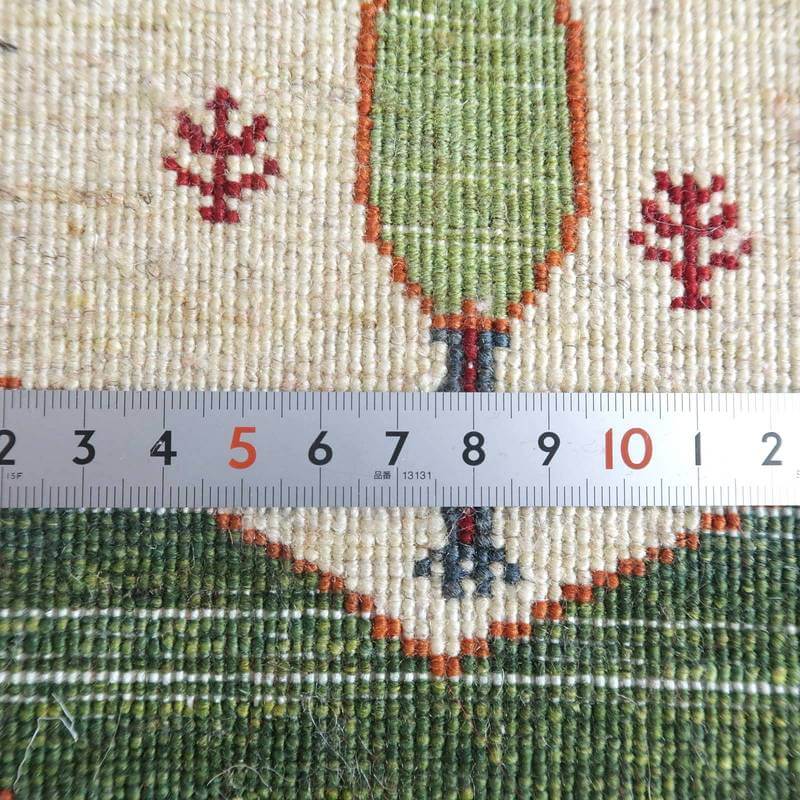 織りは、10cmあたり、およそ40から45目という普通のギャッベの数倍にもなる大変細かなルリバフ。抜け毛が少なく、手触りはふわりと柔らか。踏んだ時やんわりと沈み込む踏み心地です。腕の良い選りすぐられた織り子だけが手掛ける極上の手仕事です。