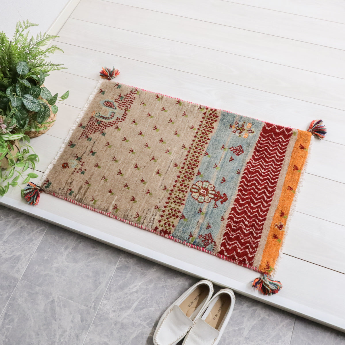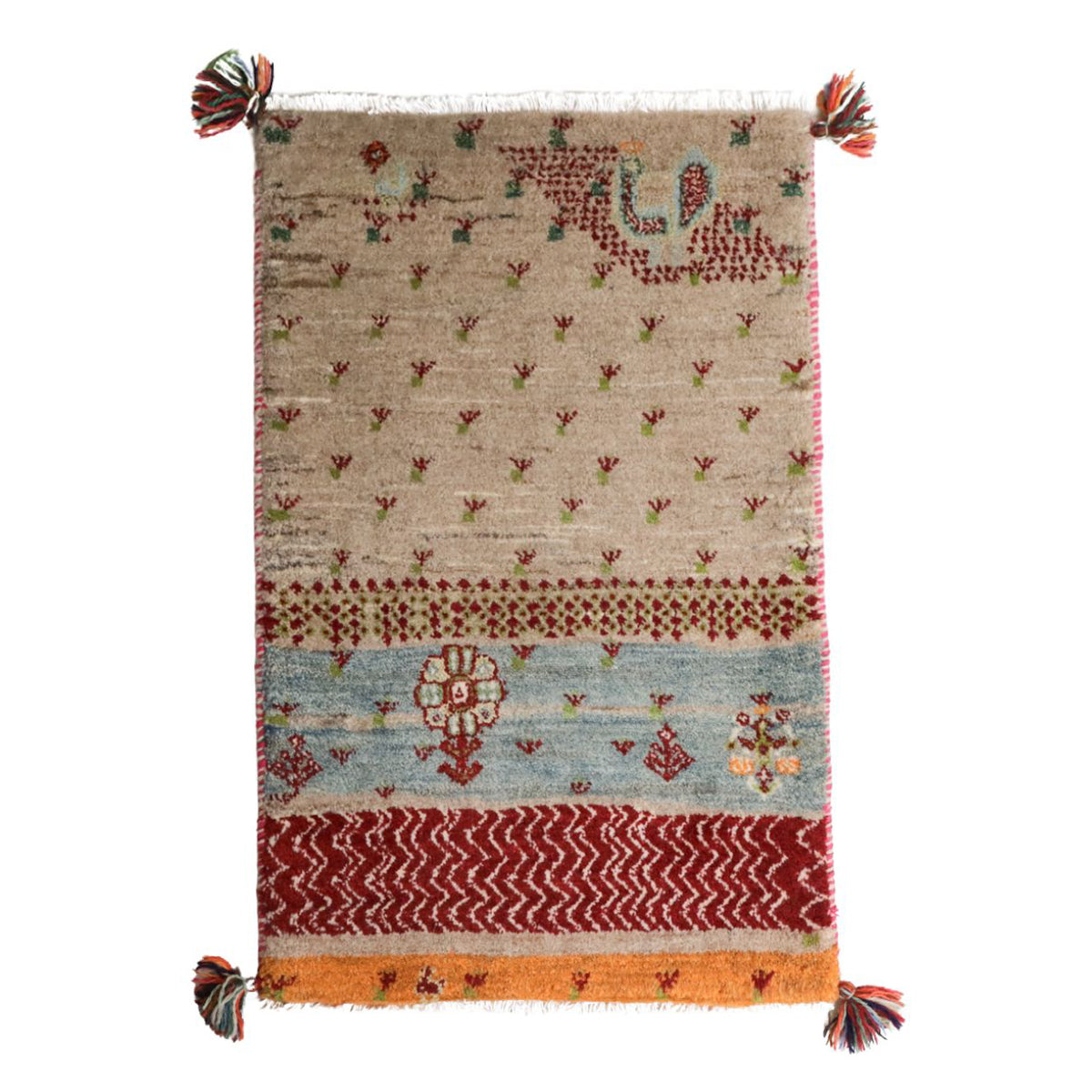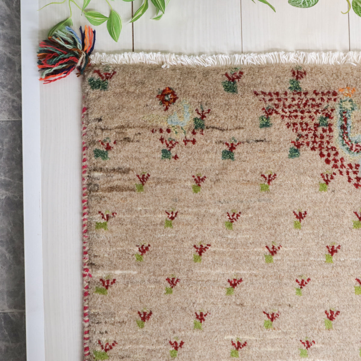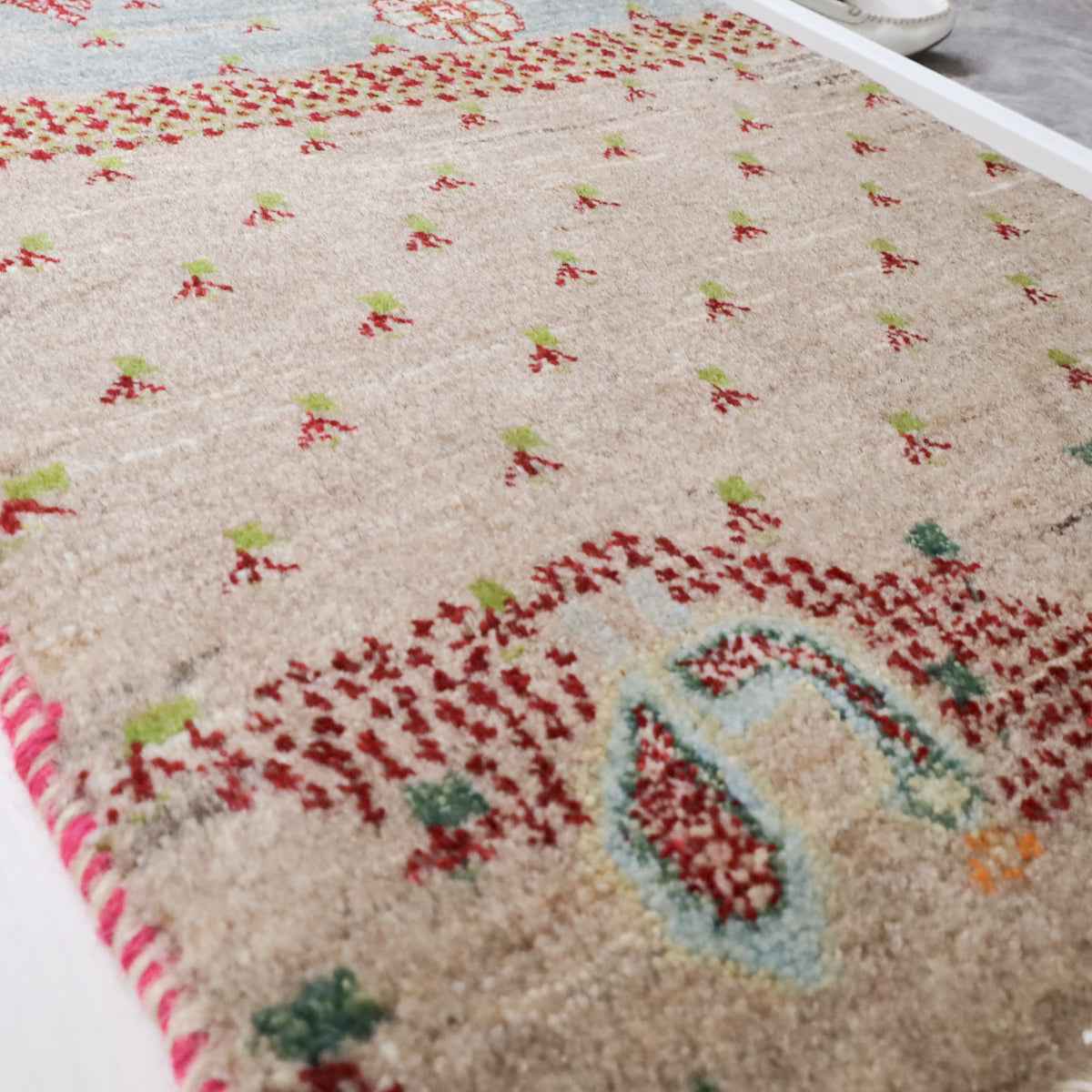 角に大きく入った鳥のモチーフが印象的なランドスケープデザイン。広がりのある風景をユニークに切り取った、絵のように飾れるギャッベです。原毛色が温かみのある雰囲気。