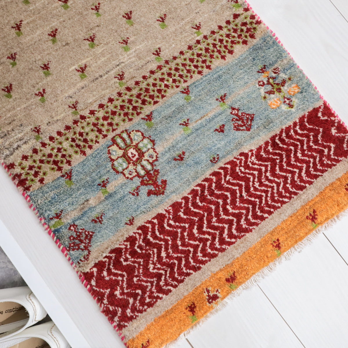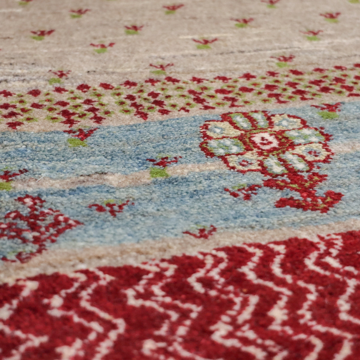 ルリ族によって織られる「ルリバフ」というギャッベは、通常のギャッベの織り目よりもはるかに細かく織られています。ルリバフは高い技術を持つ選ばれた織り子だけが手掛けることができ、デザインは細やかで柔らかなウール素材、やんわりと沈み込む快適な踏み心地のハイランクな上質ギャッベです。