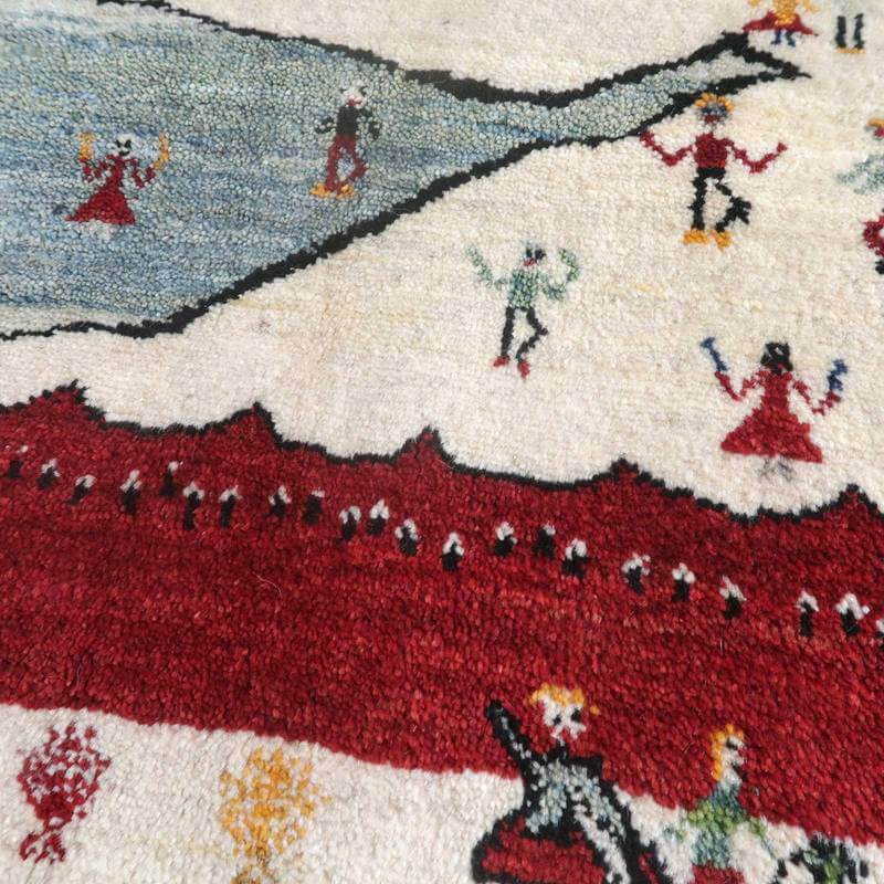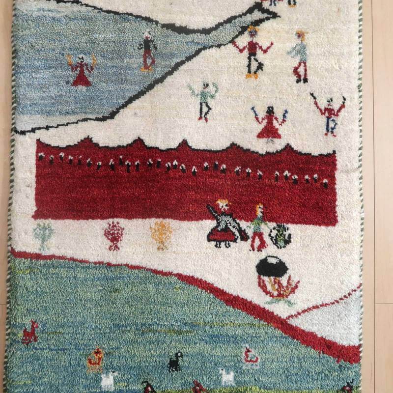 広い風景の中に大きな赤いテントと家畜たち。高いところには新郎新婦。結婚式で、みんなが手に布を持って踊っている様子が描かれたギャッベです。火にかけられた鍋やチャイポット、楽しかった思い出を明るく描いたほほえましいランドスケープ。左端で105センチ、右端で107センチと長さに手織りならではの少しの差がございます。