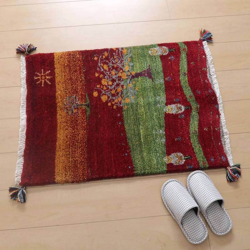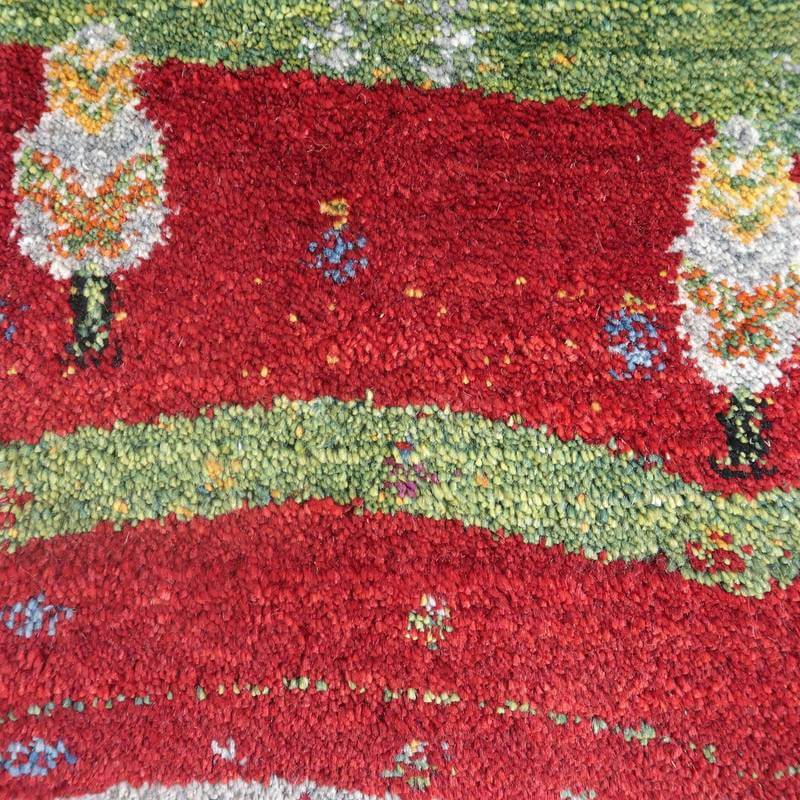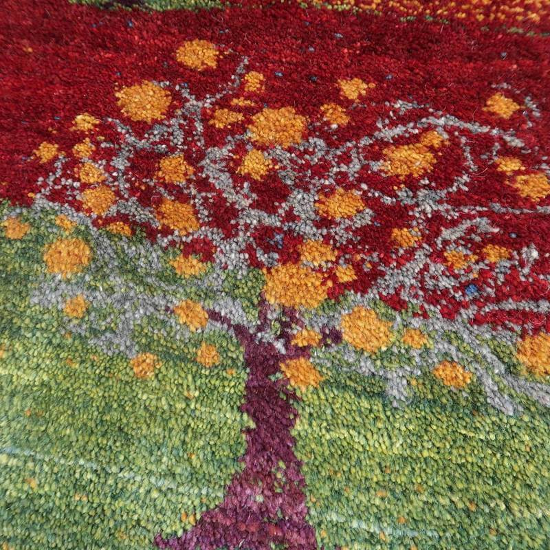 温かみを感じる赤とグリーンで広がりのある風景をギャッベに写しとった美しいランドスケープデザイン。おとぎ話の挿絵のような幻想的な雰囲気も感じられます。デザインを引き立てるため部分的に真っ白なコットンシルクが使われています。