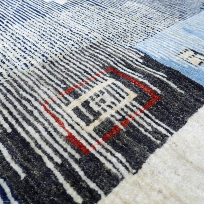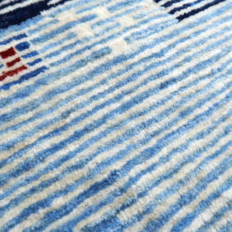 濃淡のブルーをランダムに切替えて構成したモダンなアートデザイン。刈り取ったままの羊の毛を染めず使用したアイボリーはナチュラルな素材の風合いを大きく感じさせ、遊牧の日常風景をシーン毎に捉えて描いたストーリーに想像が膨らみます。柔らかく軽やかな美しいブルー。冬毛の柔らかな最高部位のウールのみを使用して細かく編んだ最上級のソフトな手触り。