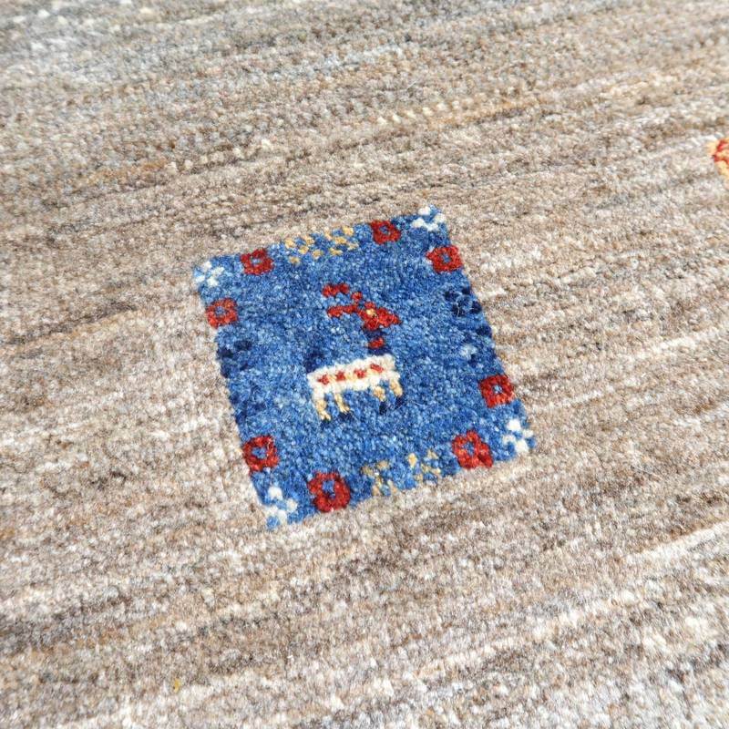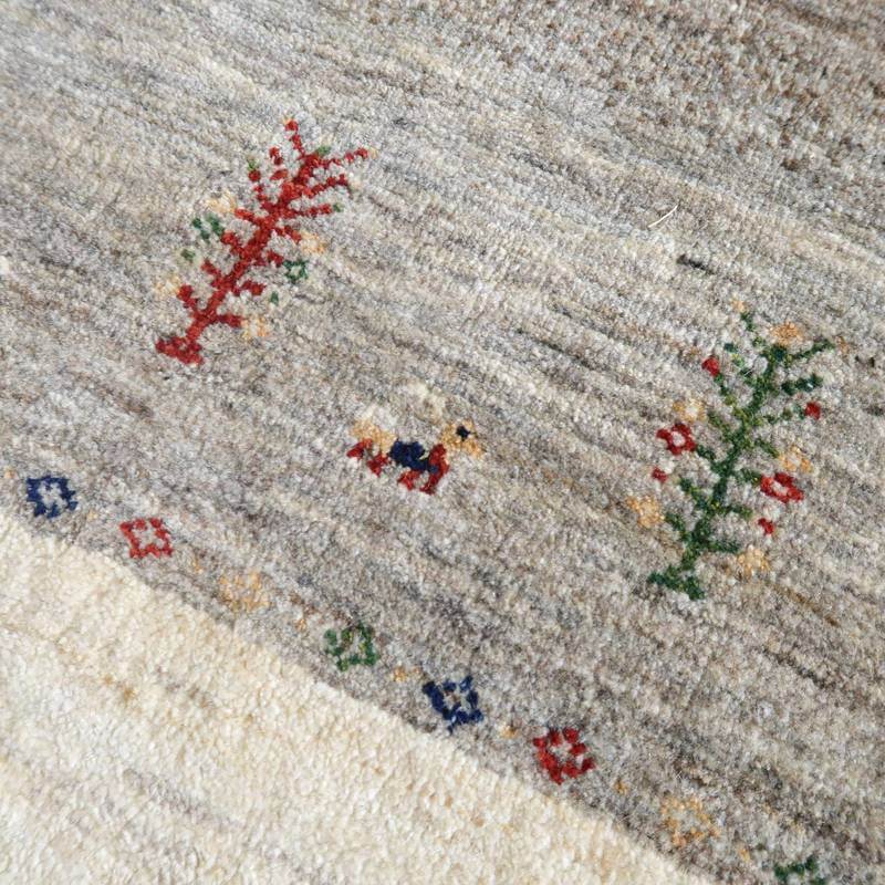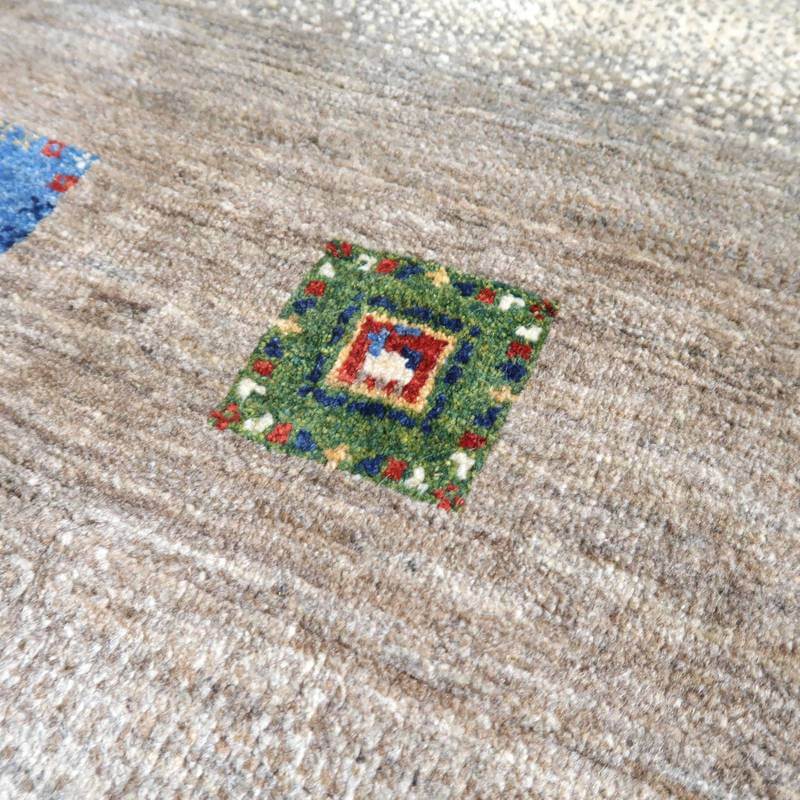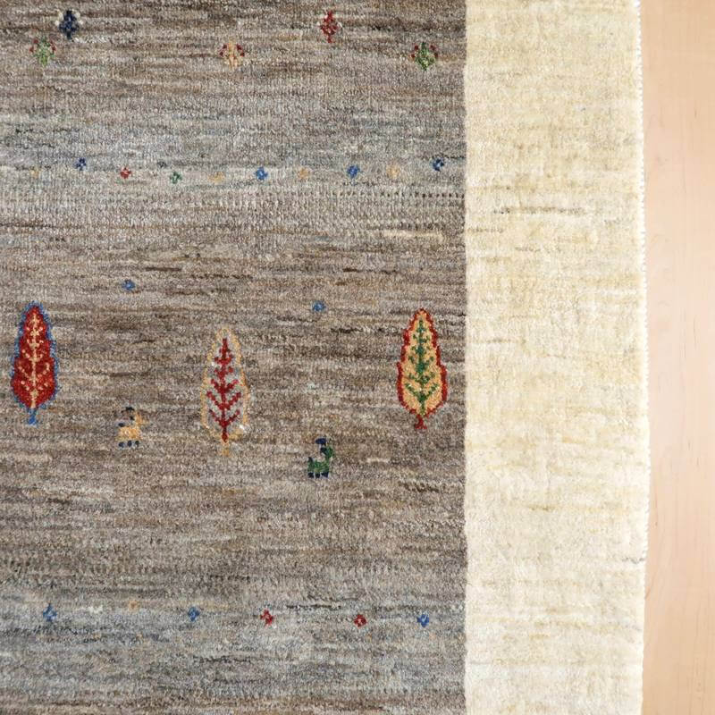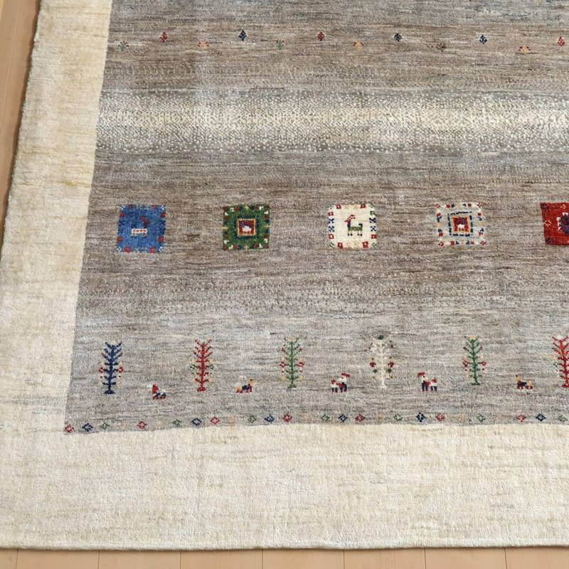 刈り取った羊の毛の明るい色は外枠に、グレーベージュの色を内側に使用した、無染色をベースとしたナチュラルな風合いです。内側はグレーやベージュをやんわりグラデーションで切り替えていくような緩いボーダーで、アブラシ(色むらのグラデーション)の揺らぎがしみじみ味わえます。動物や生命の木が小さいのは細かな織りの証。冬毛の柔らかな最高部位のウールのみを使用して細かく編んだ最上級のソフトな手触り。枠部分は無染色のタイプの中では白っぽく、明るいカラーになります。