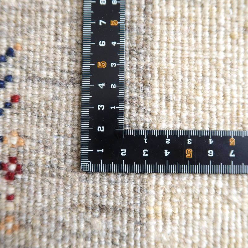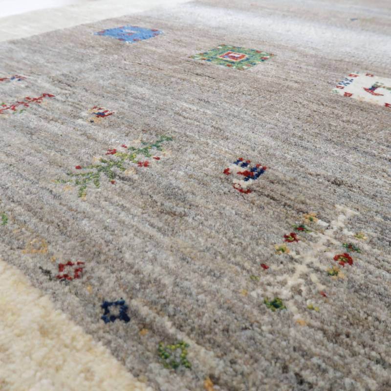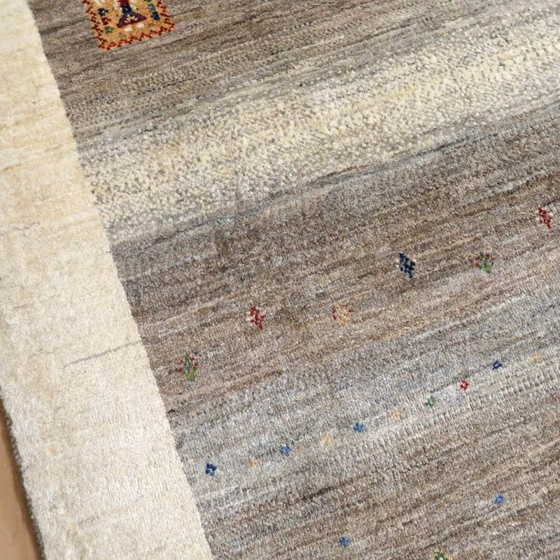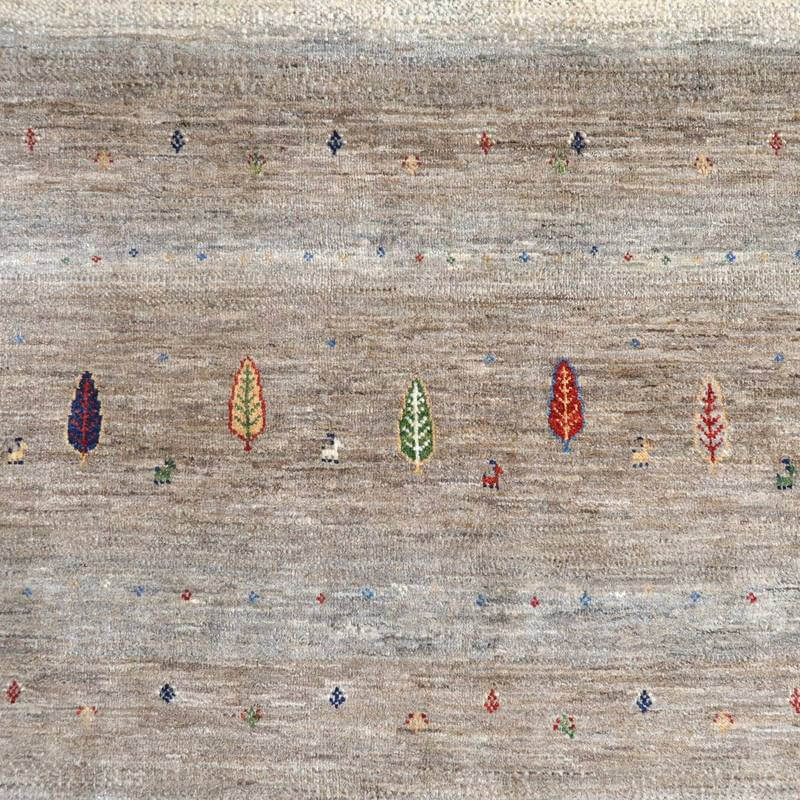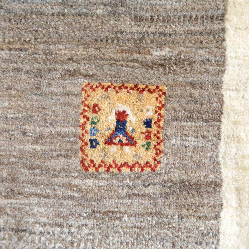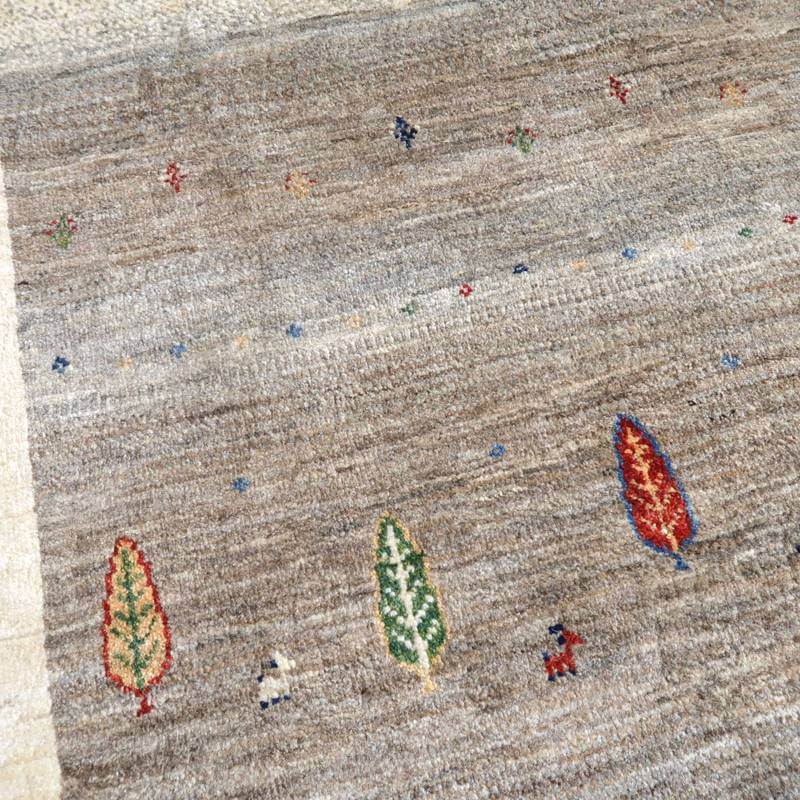 刈り取った羊の毛の明るい色は外枠に、グレーベージュの色を内側に使用した、無染色をベースとしたナチュラルな風合いです。内側はグレーやベージュをやんわりグラデーションで切り替えていくような緩いボーダーで、アブラシ(色むらのグラデーション)の揺らぎがしみじみ味わえます。動物や生命の木が小さいのは細かな織りの証。冬毛の柔らかな最高部位のウールのみを使用して細かく編んだ最上級のソフトな手触り。枠部分は無染色のタイプの中では白っぽく、明るいカラーになります。