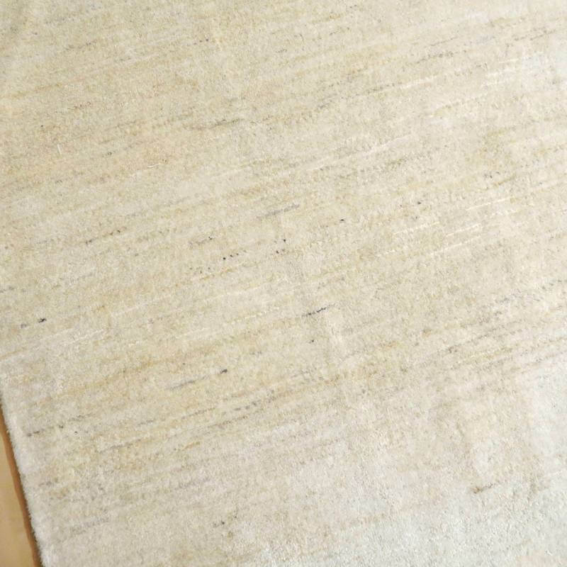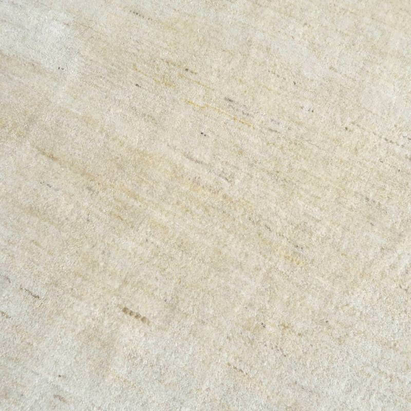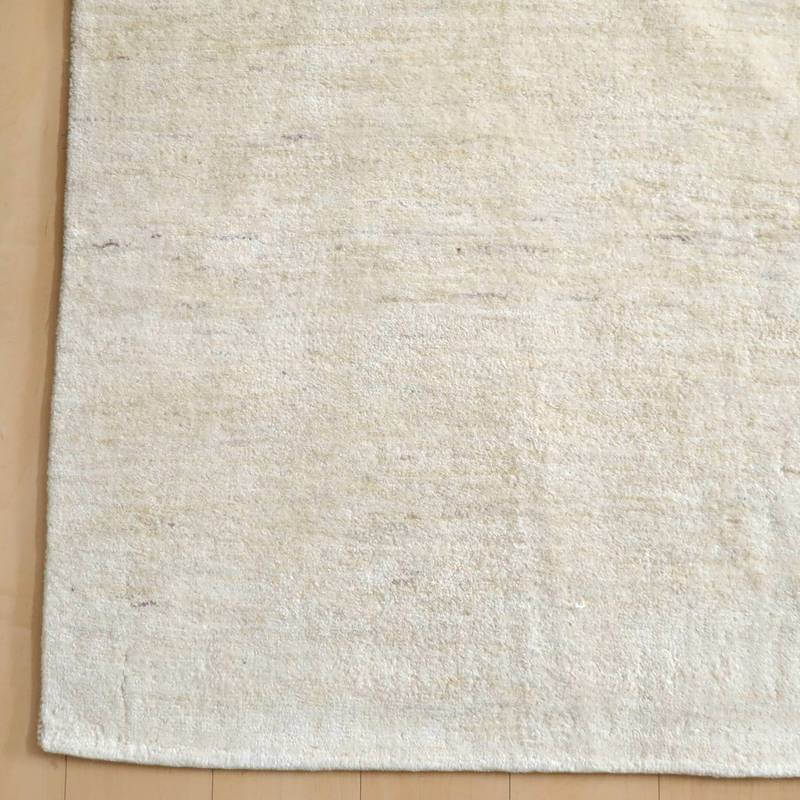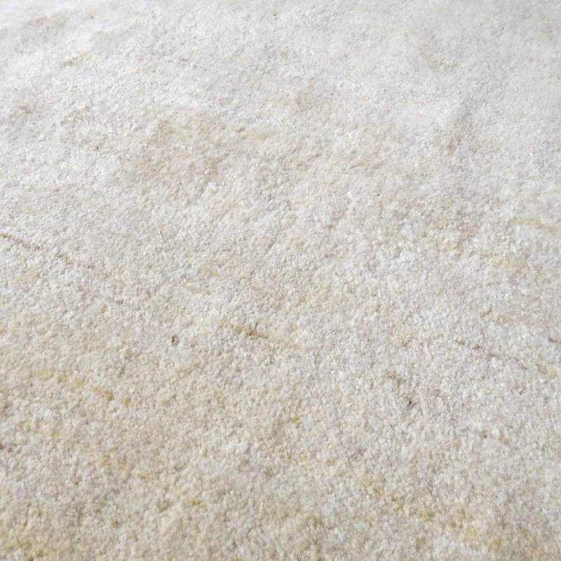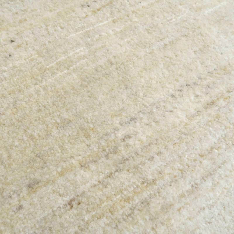 刈り取った羊の毛を染めずにそのまま使用した原毛のシンプルな無地のデザイン。クリーム色の濃淡にごく薄いグレーやベージュのアブラシ(色むらのグラデーション)がやんわり入ります。冬毛の柔らかな最高部位のウールのみを使用して細かく編んだ最上級のソフトな手触り。無染色のタイプの中では白っぽく、明るいカラーになります。