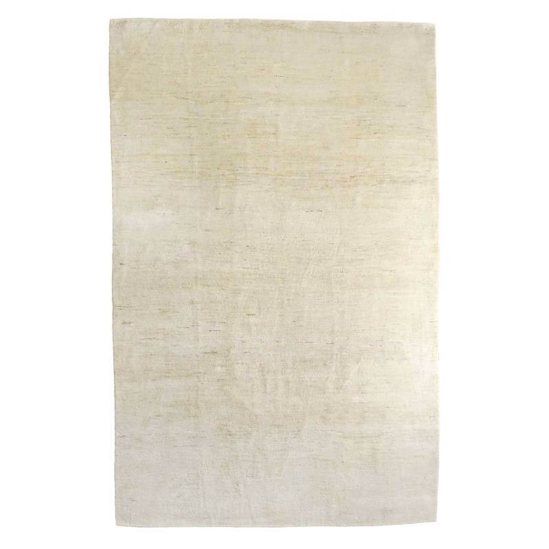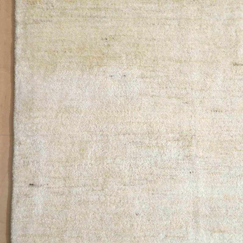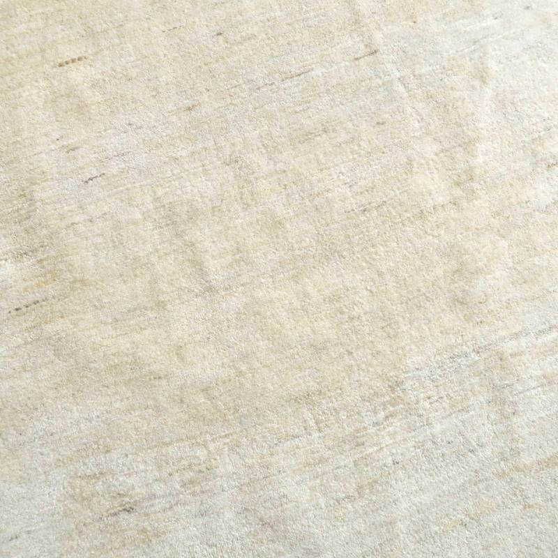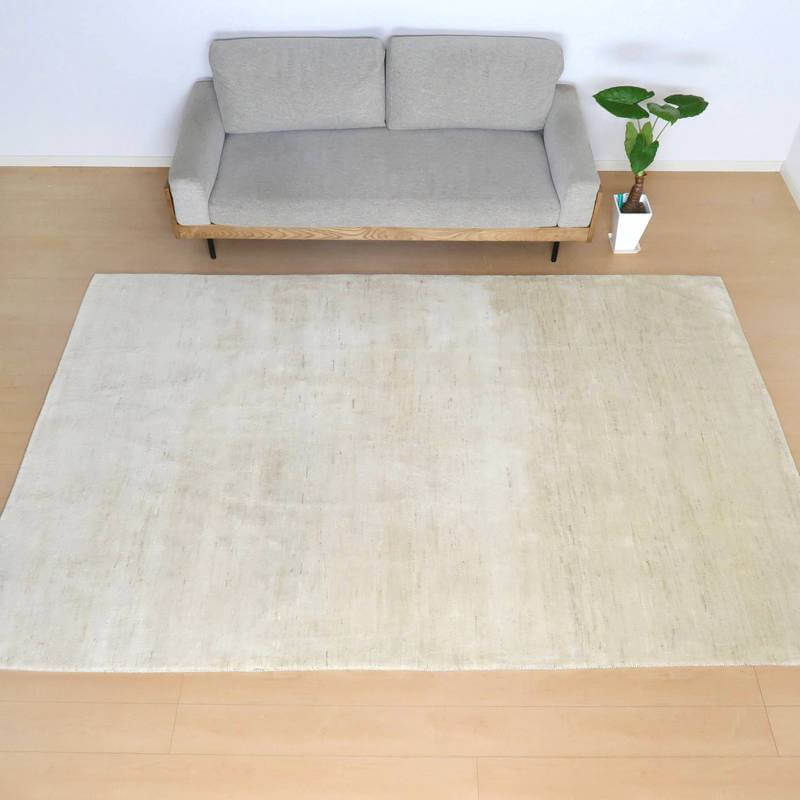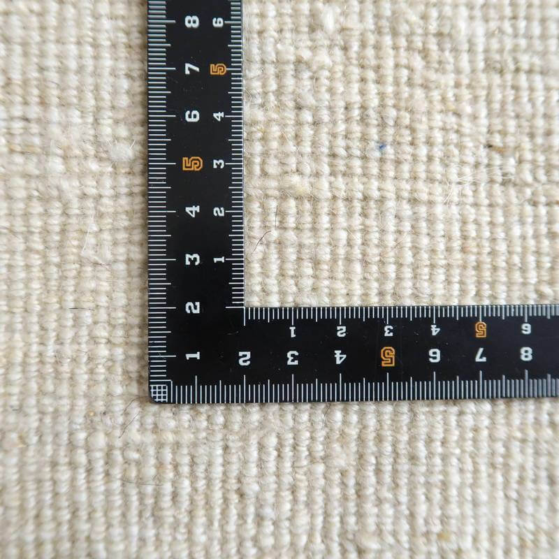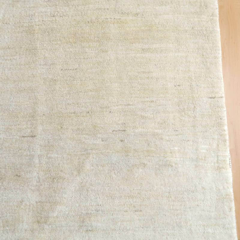 刈り取った羊の毛を染めずにそのまま使用した原毛のシンプルな無地のデザイン。クリーム色の濃淡にごく薄いグレーやベージュのアブラシ(色むらのグラデーション)がやんわり入ります。冬毛の柔らかな最高部位のウールのみを使用して細かく編んだ最上級のソフトな手触り。無染色のタイプの中では白っぽく、明るいカラーになります。