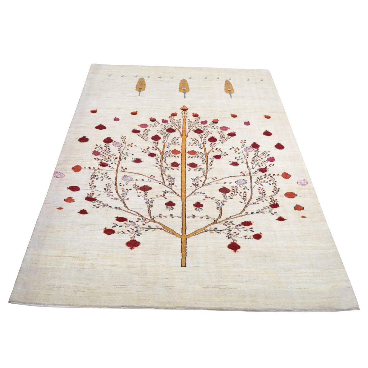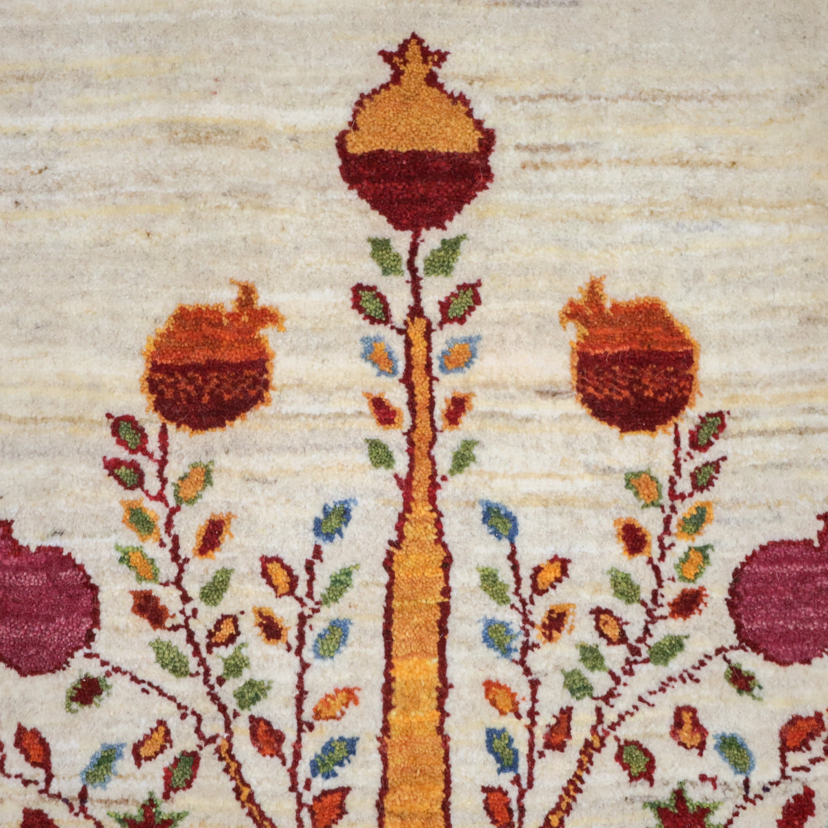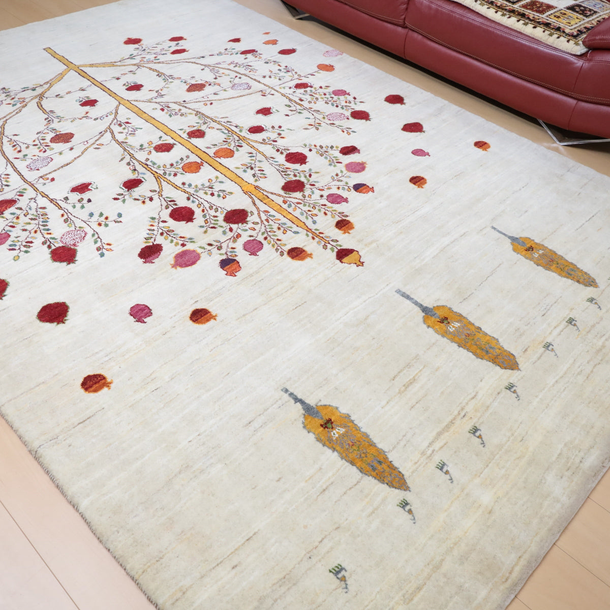 羊の毛色をそのまま言った無染色の羊色がベースのナチュラルな羊色。 イラン人にとって身近な食べ物である柘榴(ザクロ)は、昔から子の宝の薬でもありますが、大きな実をつけた大きな柘榴(ザクロ)のピクチャーデザインには、子孫多数の願いが込められています。はじけるような可愛らしい実がポップに織り込まれています。