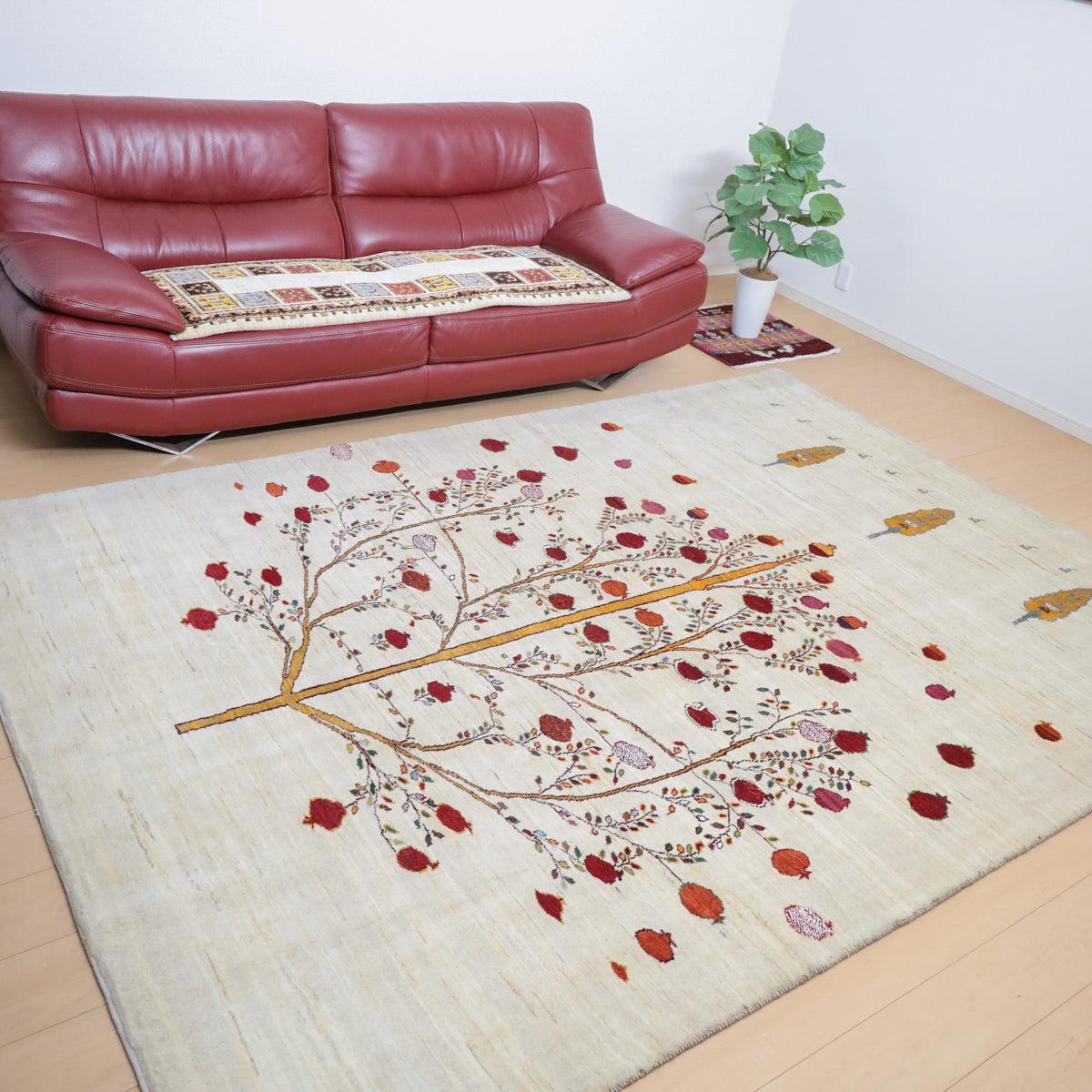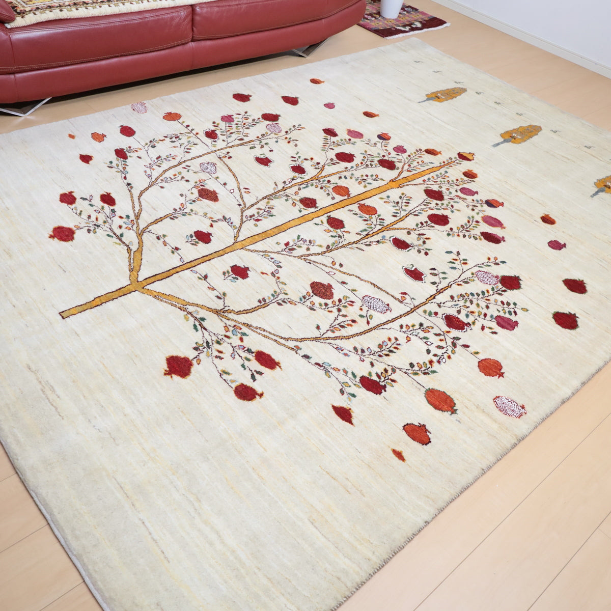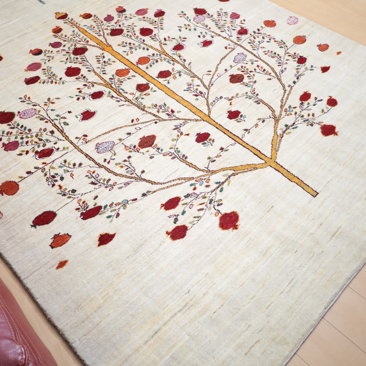 羊の毛色をそのまま言った無染色の羊色がベースのナチュラルな羊色。 イラン人にとって身近な食べ物である柘榴(ザクロ)は、昔から子の宝の薬でもありますが、大きな実をつけた大きな柘榴(ザクロ)のピクチャーデザインには、子孫多数の願いが込められています。はじけるような可愛らしい実がポップに織り込まれています。