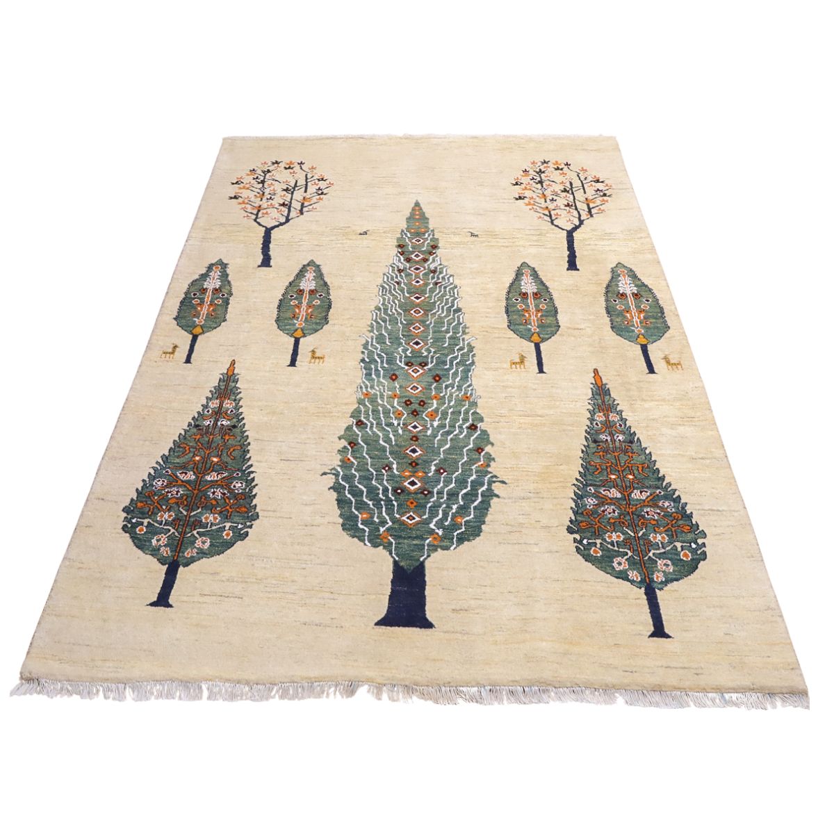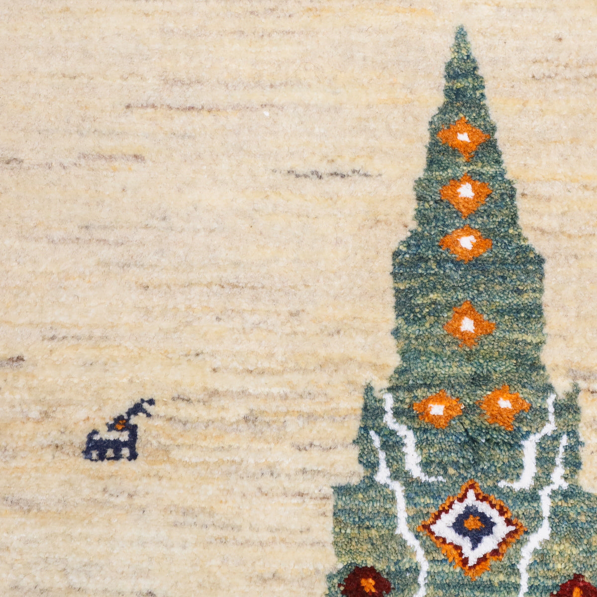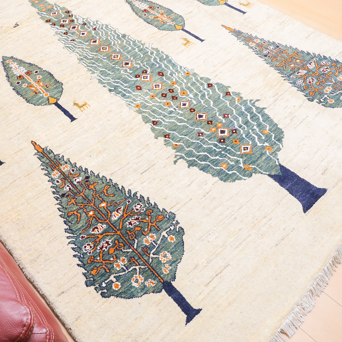 薄グレーや薄ベージュのグラデーションがふわりと入ったベースのウールは、羊の毛色をそのまま活かした無染色で、ナチュラルな風合い。どっしりと鎮座する大きな糸杉の木が背後の木々を従えている王のように大変力強さがあり、インパクトのあるデザインです。デザインを引き立てる為のシルクが一部(特に白く見える部分)に使われている高級感のあるギャッベです。