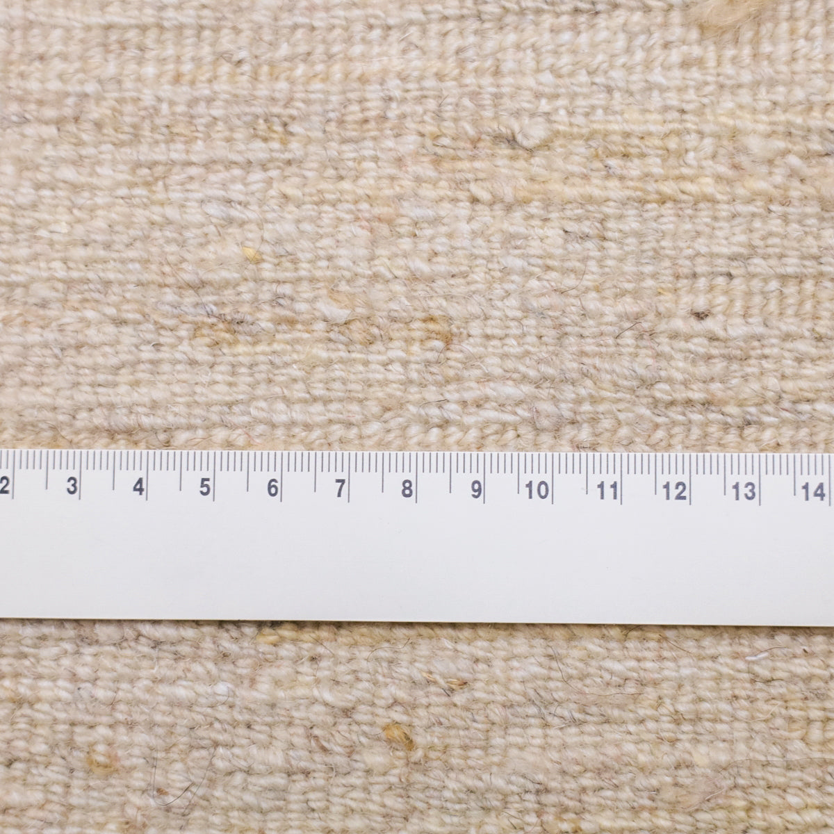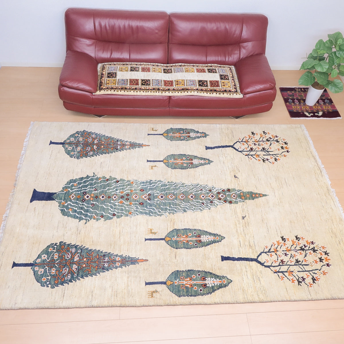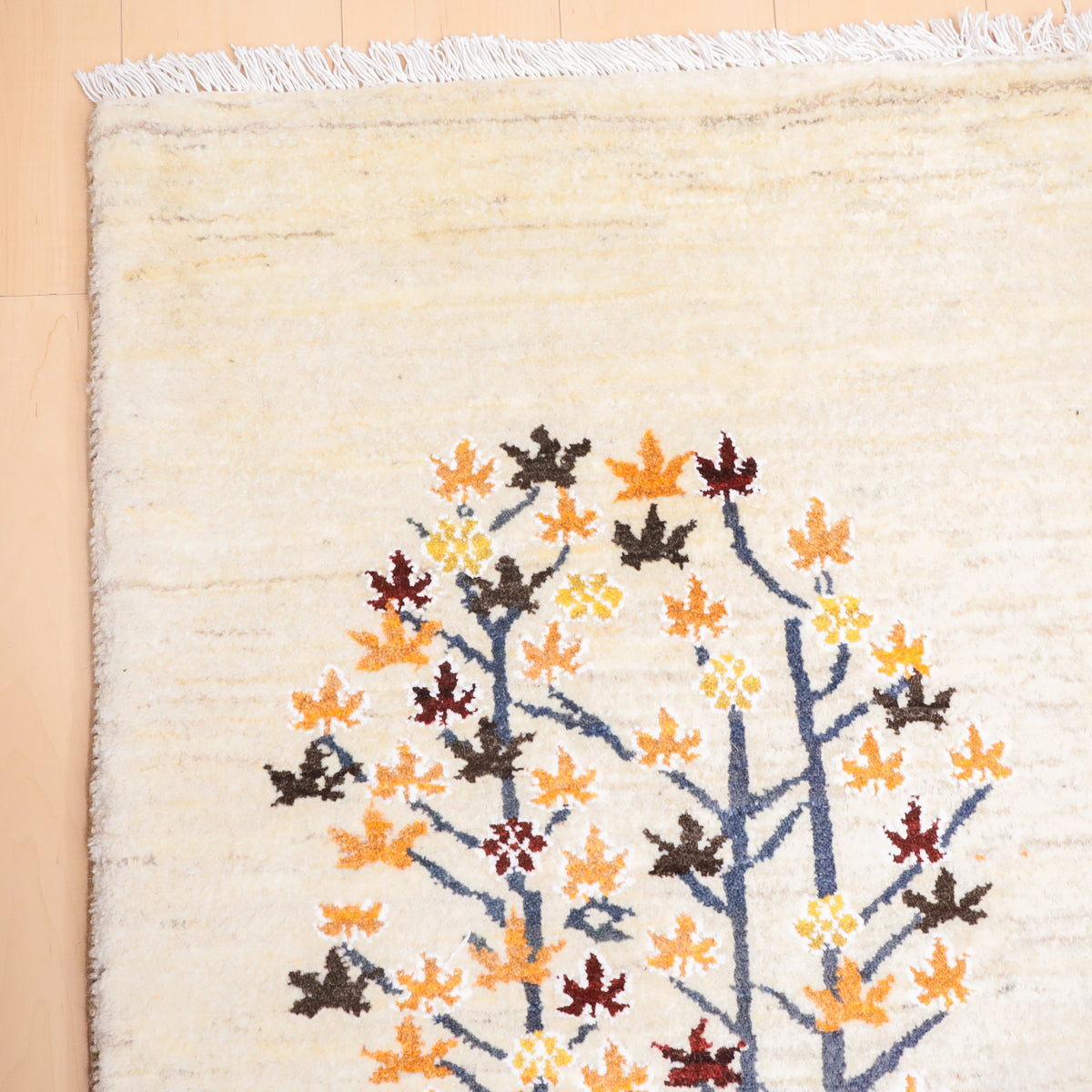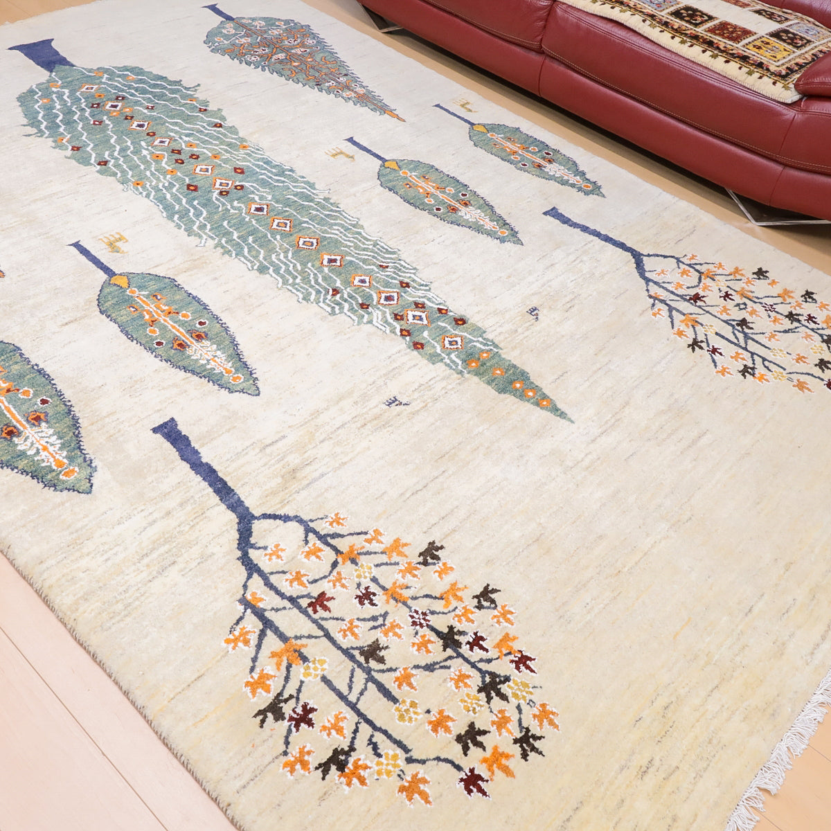 薄グレーや薄ベージュのグラデーションがふわりと入ったベースのウールは、羊の毛色をそのまま活かした無染色で、ナチュラルな風合い。どっしりと鎮座する大きな糸杉の木が背後の木々を従えている王のように大変力強さがあり、インパクトのあるデザインです。デザインを引き立てる為のシルクが一部(特に白く見える部分)に使われている高級感のあるギャッベです。