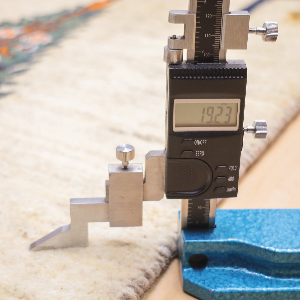 織りは、10cmあたり、およそ40から45目という普通のギャッベの数倍にもなる大変細かなルリバフ。細かく繊細なデザインで手触りはふわりと柔らか。やんわりと沈み込む踏み心地です。腕の良い選りすぐられた織り子だけが手掛ける極上の手仕事です。