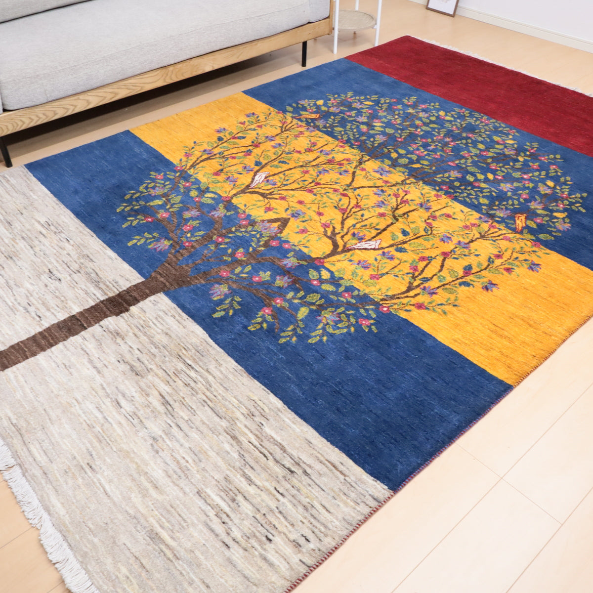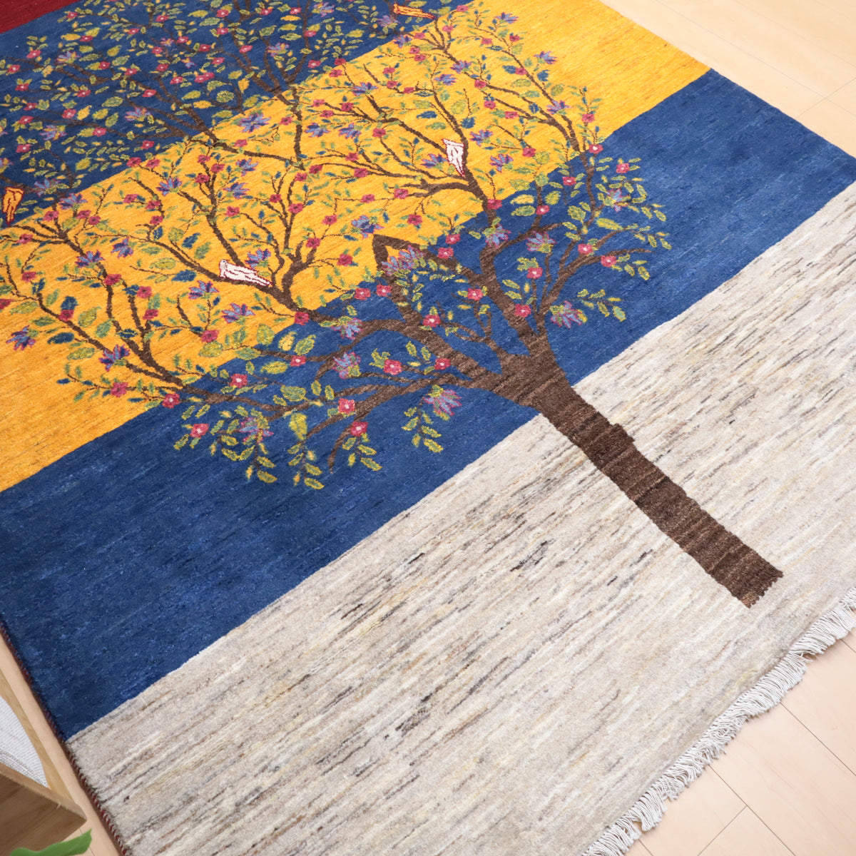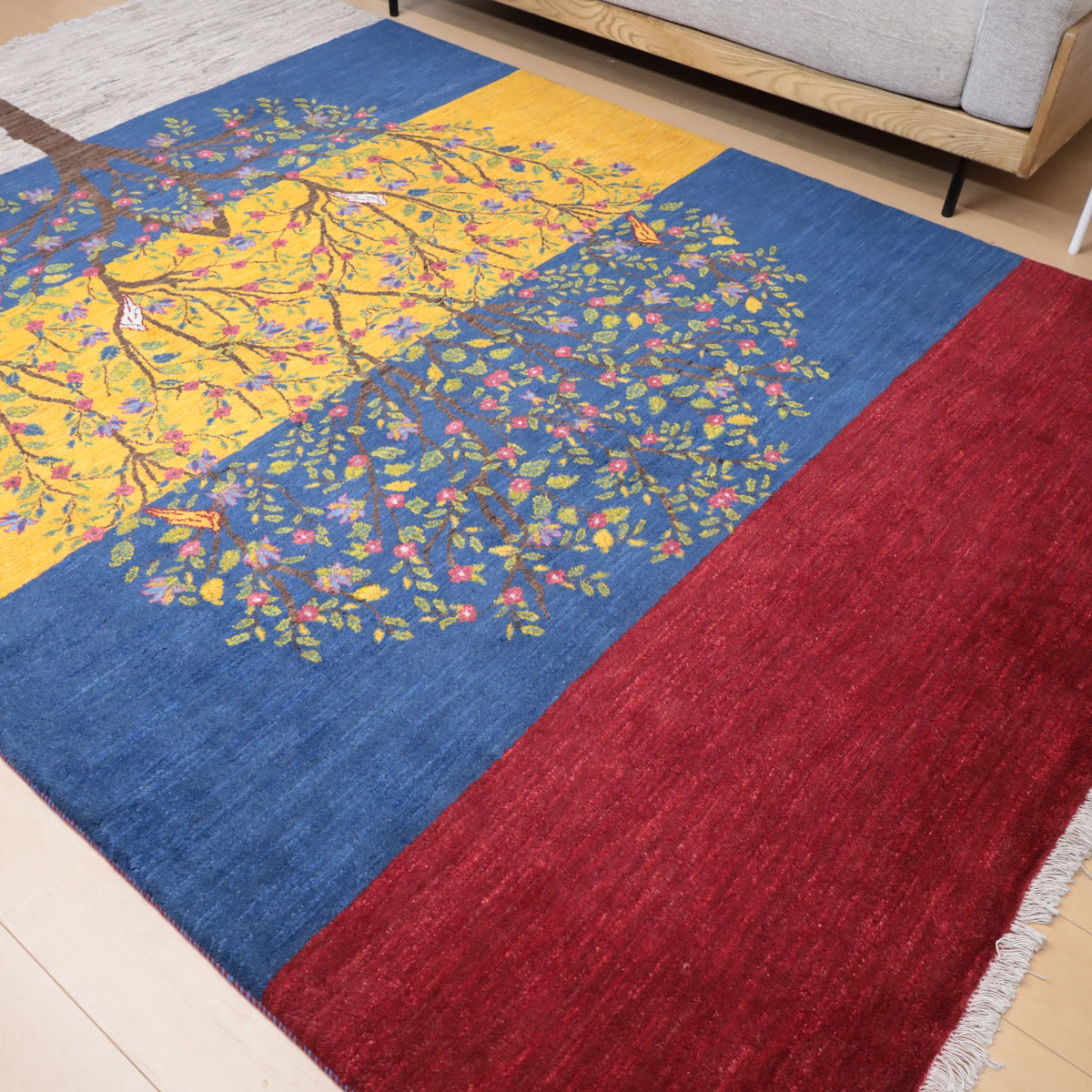 青、赤、黄とも鮮やかさの少ない、くすみのあるカラーで、嫌な派手さはありません。花をつけた大きな生命の木には幸せの小鳥、モダンなアートデザインは織るのに大変手間が掛かっている分だけ、いっそうプレミアムな存在感が感じられる芸術的なデザインです。