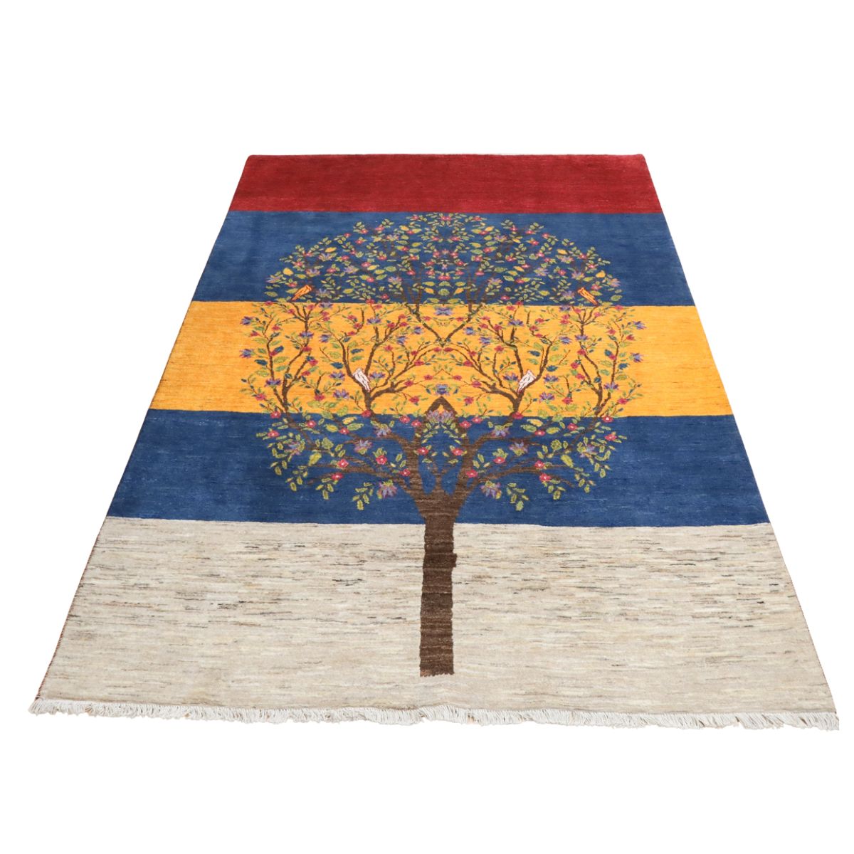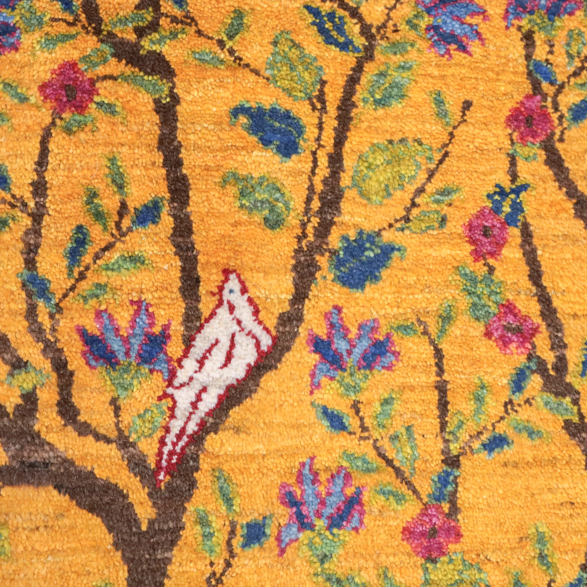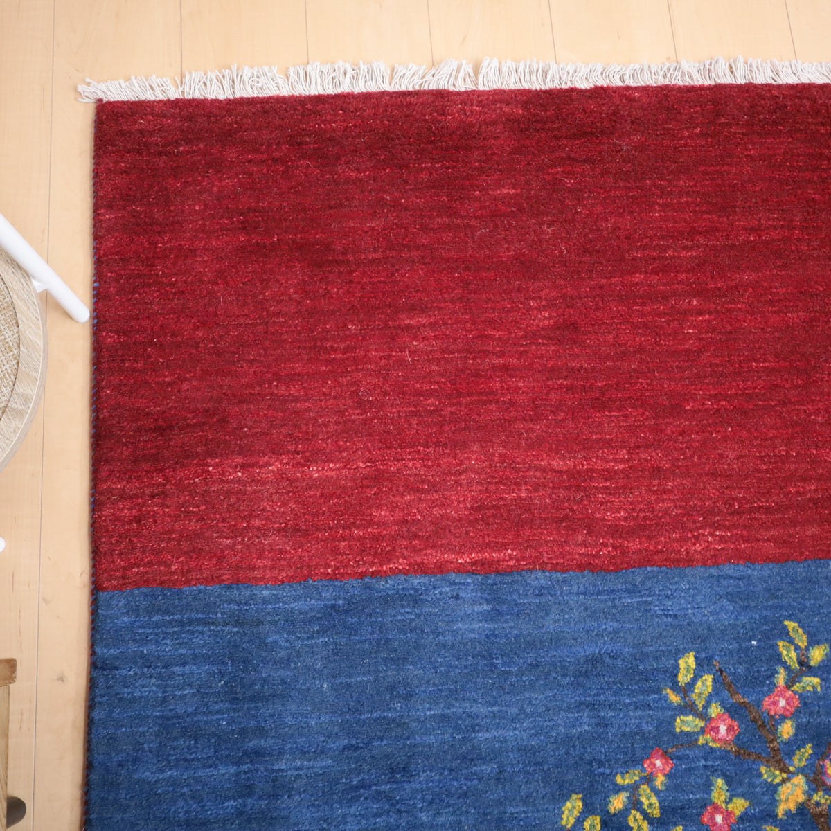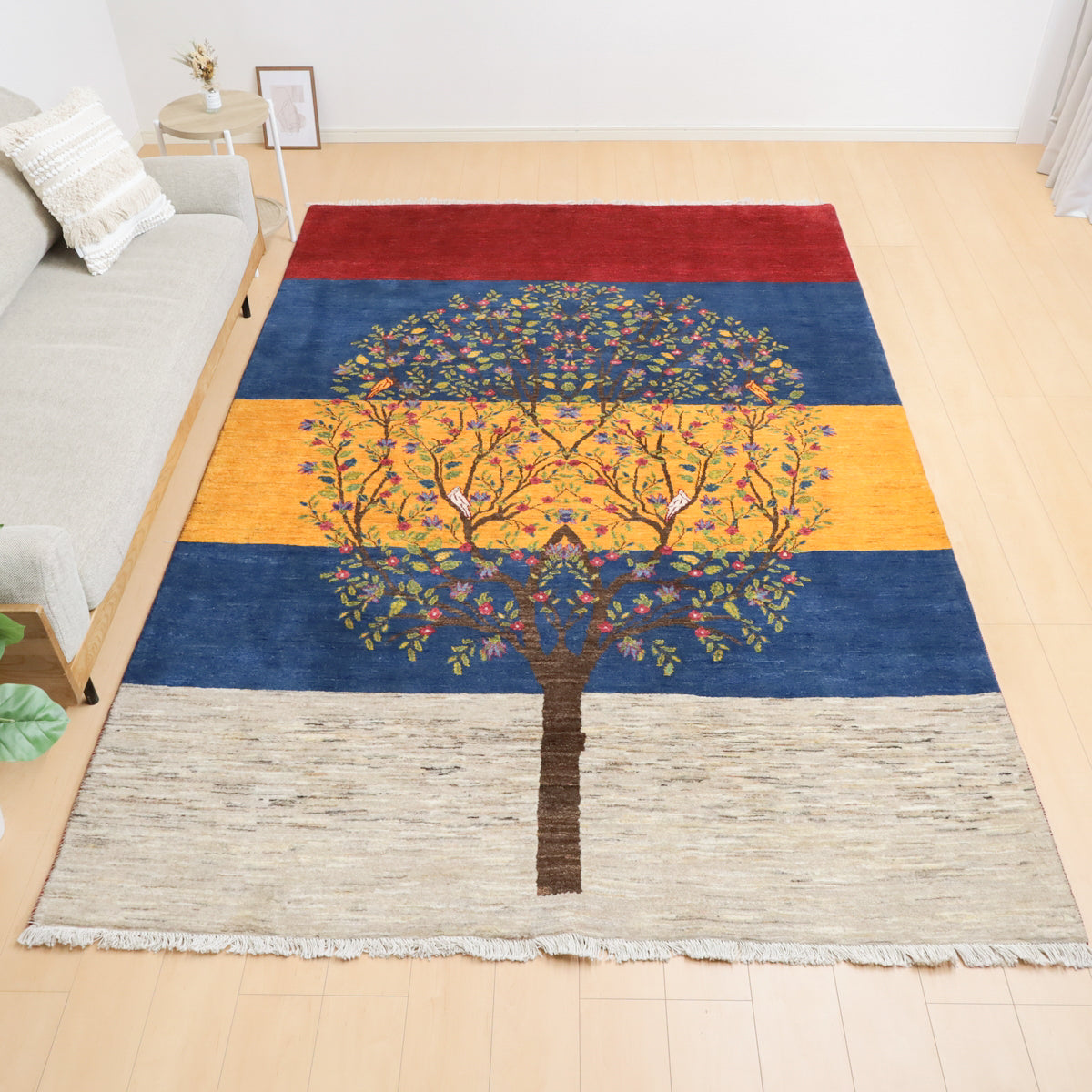 青、赤、黄とも鮮やかさの少ない、くすみのあるカラーで、嫌な派手さはありません。花をつけた大きな生命の木には幸せの小鳥、モダンなアートデザインは織るのに大変手間が掛かっている分だけ、いっそうプレミアムな存在感が感じられる芸術的なデザインです。