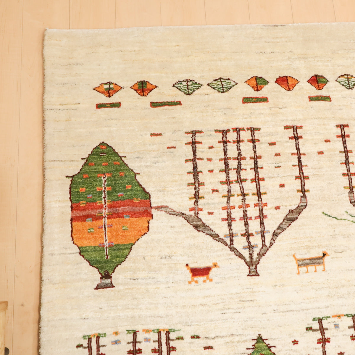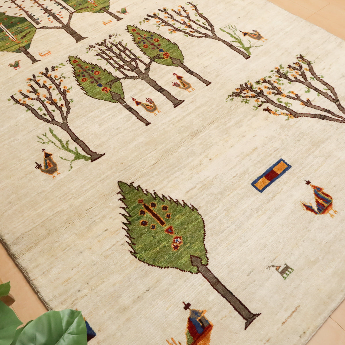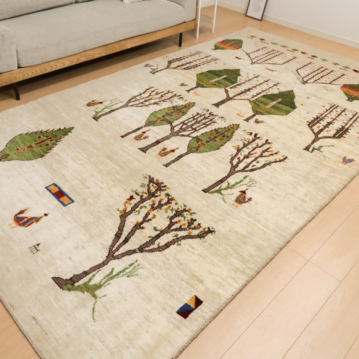羊の毛色をそのまま活かした無染色の羊色のベースは、どんな場所にも似合うナチュラルな風合い。強い生命力の象徴である糸杉とそこに集う動物たち、調和のとれた生命の木々と立ち並ぶ自然の景色が生き生きとした色合いで描かれたアート・デザインです。