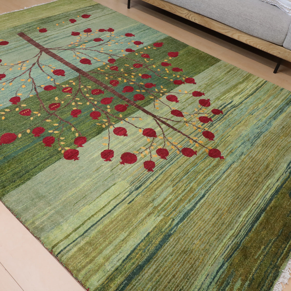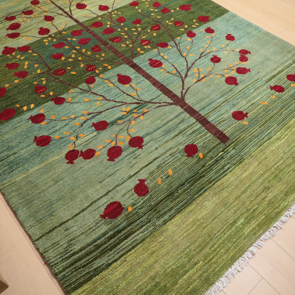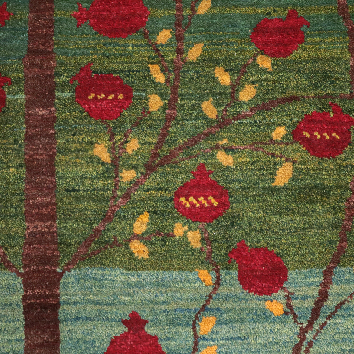何十種類もの色数を使用した複雑なグラデーションが美しいグリーンのギャッベ。渋さのある落ち着いた色合いです。大きな柘榴(ザクロ)のコロンと丸い様子は落ち着いたカラーに彩のアクセントとして映えます。イラン人にとって身近な食べ物である柘榴は、昔から子宝の薬でもありますが、たわわに実をつけたザクロのデザインには、子孫繁栄の願いが込められています。