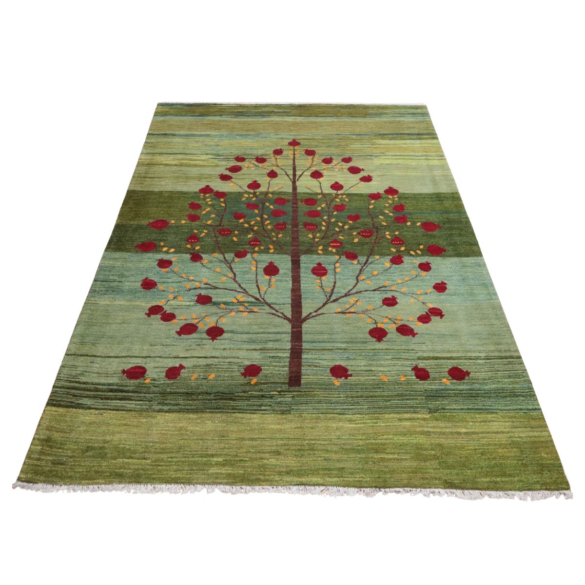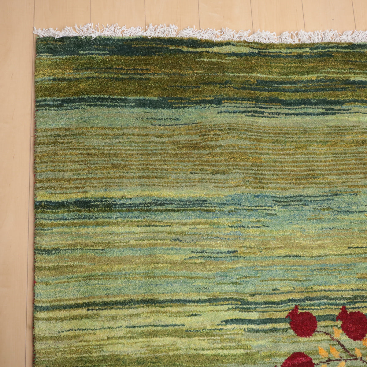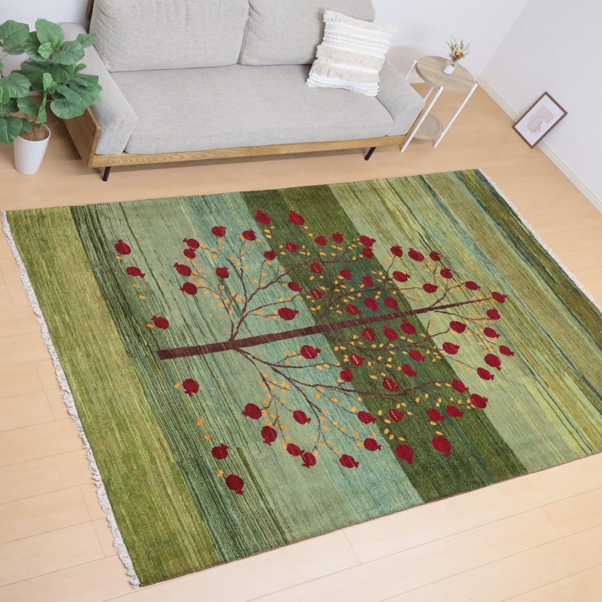 何十種類もの色数を使用した複雑なグラデーションが美しいグリーンのギャッベ。渋さのある落ち着いた色合いです。大きな柘榴(ザクロ)のコロンと丸い様子は落ち着いたカラーに彩のアクセントとして映えます。イラン人にとって身近な食べ物である柘榴は、昔から子宝の薬でもありますが、たわわに実をつけたザクロのデザインには、子孫繁栄の願いが込められています。