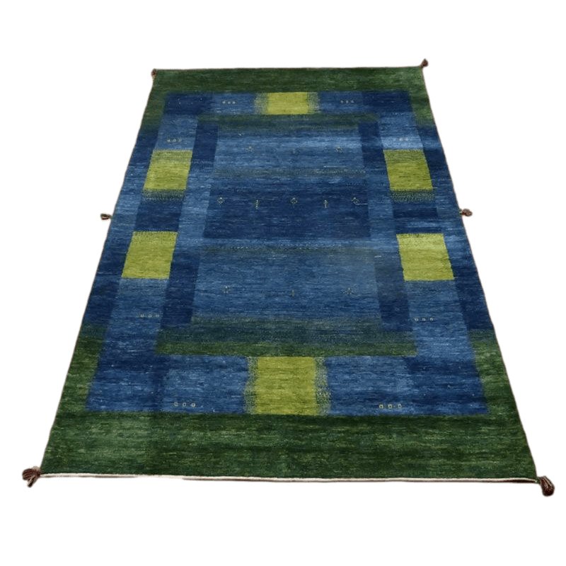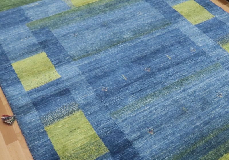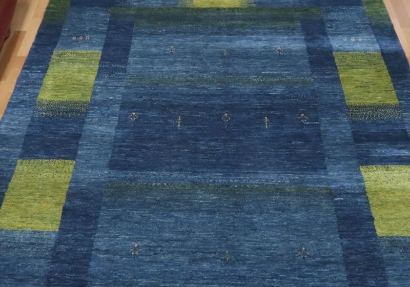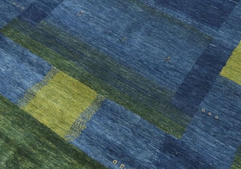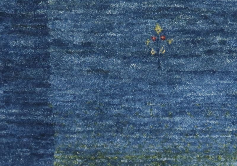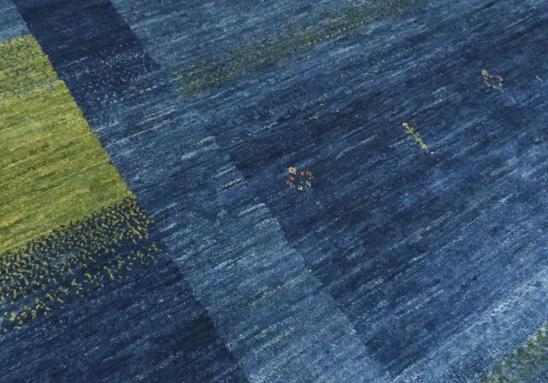 濃淡様々なブルーがやんわりと切り替わるように変化した美しいグラデーションとなっている、草木と空からインスピレーションを受けたようなモダンなアートデザイン。草木染の馴染むような落ち着いた色合いとギャッベ特有の手仕事の温かい風合いが感じられます。