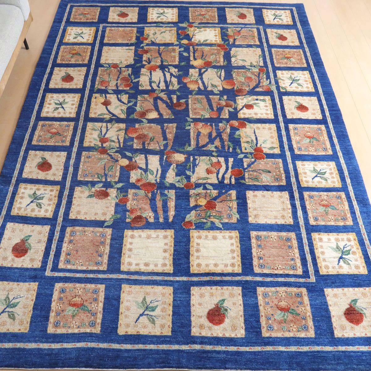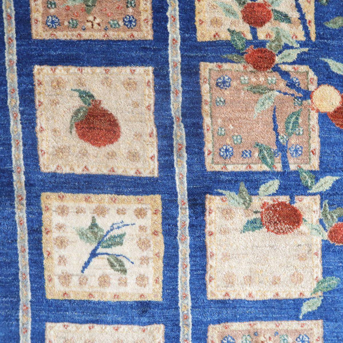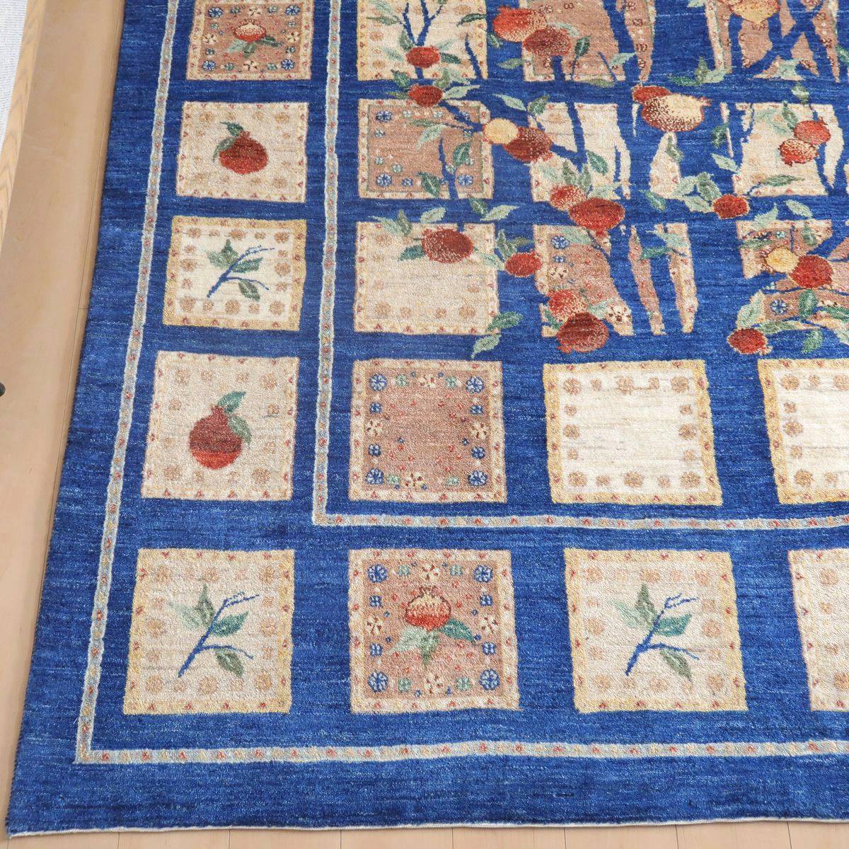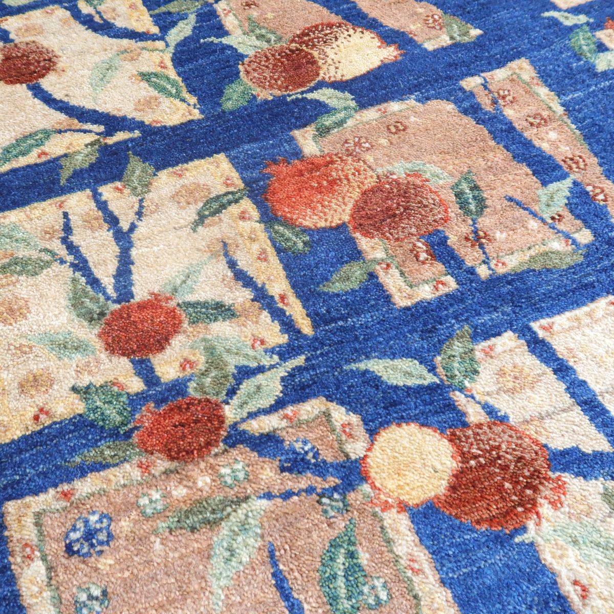 やんわり濃淡のグラデーションが入った濃い目の青色がベース。イラン人にとって身近な食べ物である柘榴(ザクロ)は、昔から子宝の薬でもありますが、たわわに実をつけた大きな柘榴(ザクロ)のピクチャーデザインには、子孫繁栄の願いが込められています。薄い肌ベージュと生成りのタイル柄の前面に、大きなザクロの木を透かし柄のように織り込んだモダンなアートデザイン。