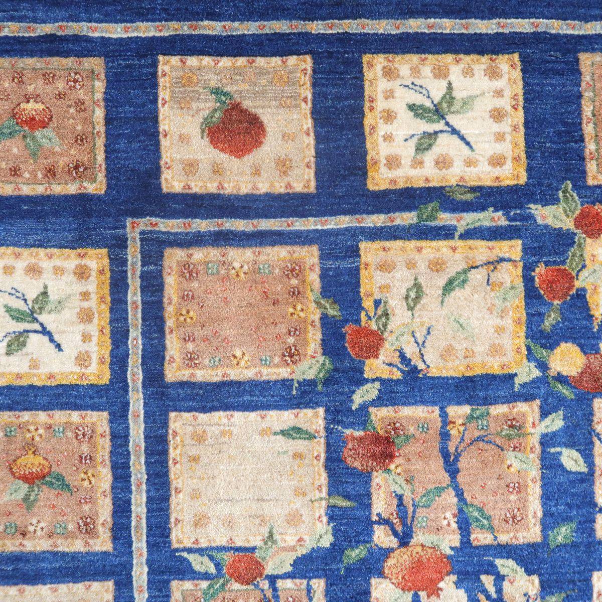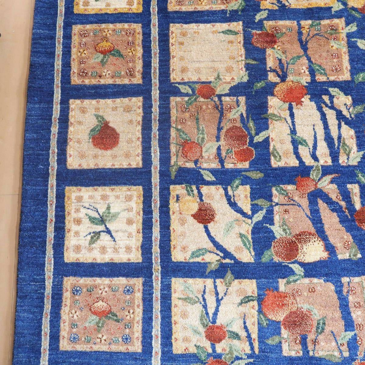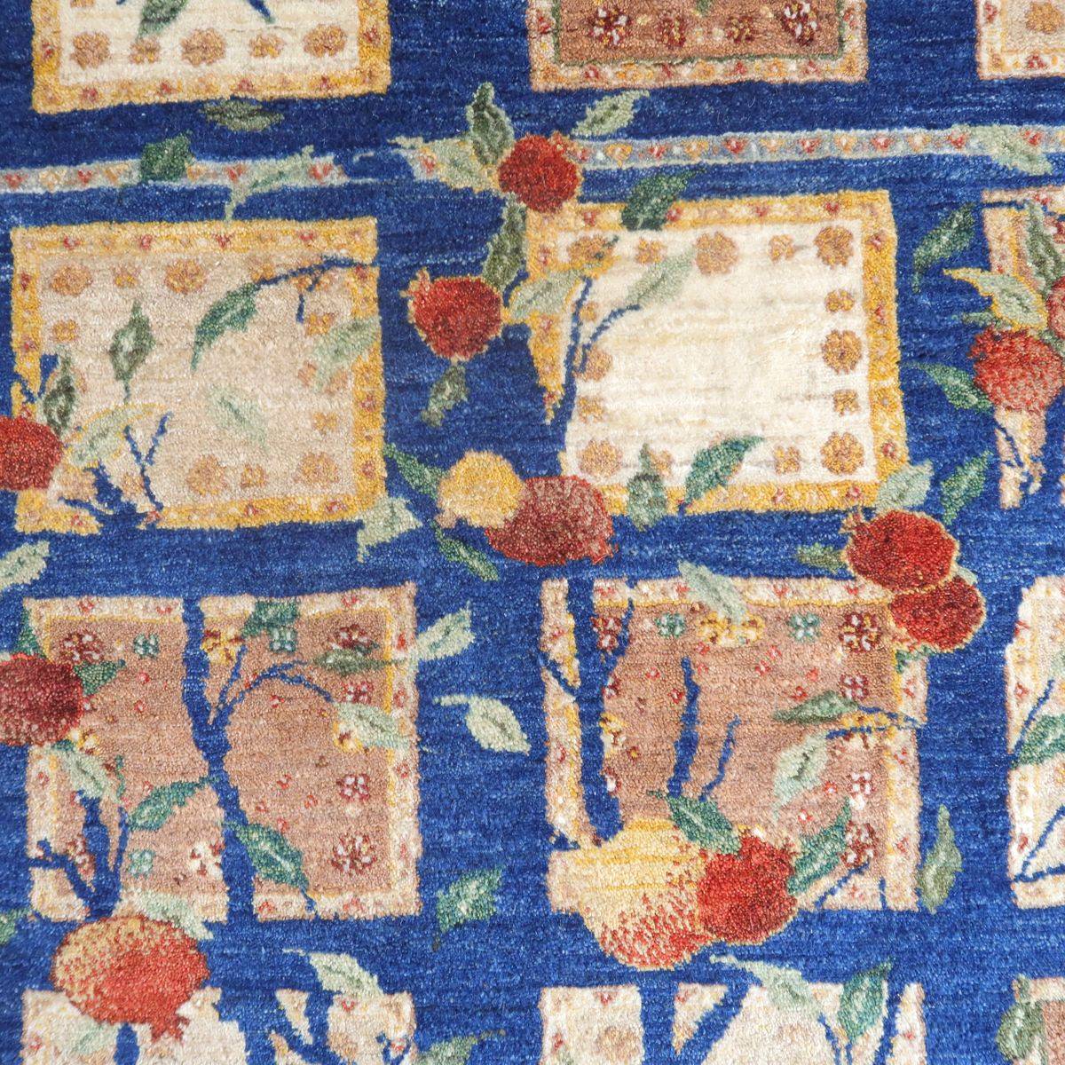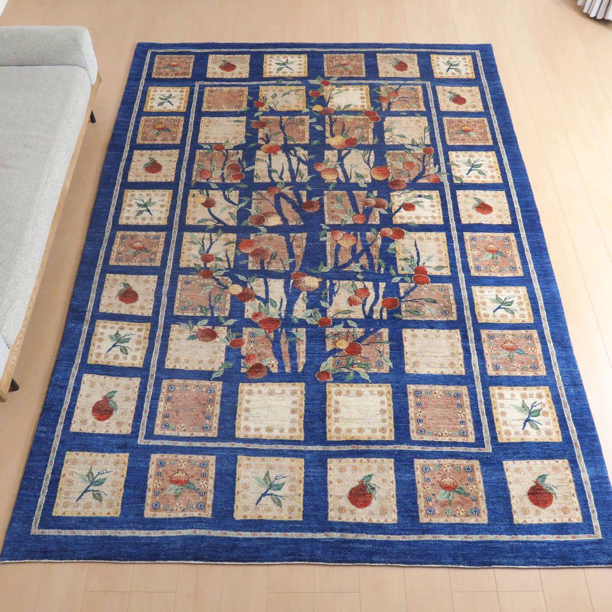 やんわり濃淡のグラデーションが入った濃い目の青色がベース。イラン人にとって身近な食べ物である柘榴(ザクロ)は、昔から子宝の薬でもありますが、たわわに実をつけた大きな柘榴(ザクロ)のピクチャーデザインには、子孫繁栄の願いが込められています。薄い肌ベージュと生成りのタイル柄の前面に、大きなザクロの木を透かし柄のように織り込んだモダンなアートデザイン。