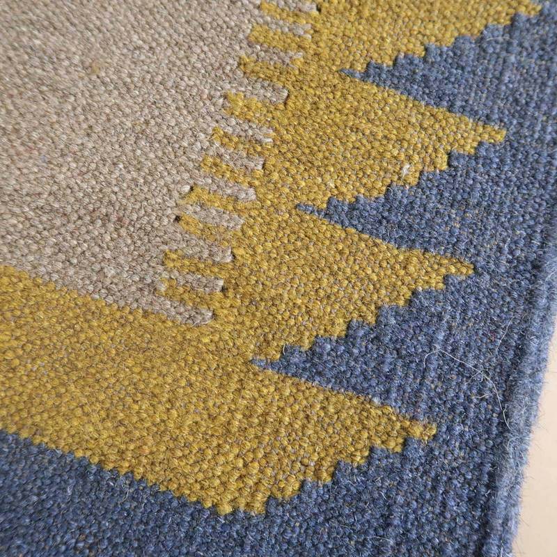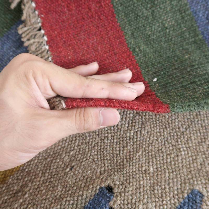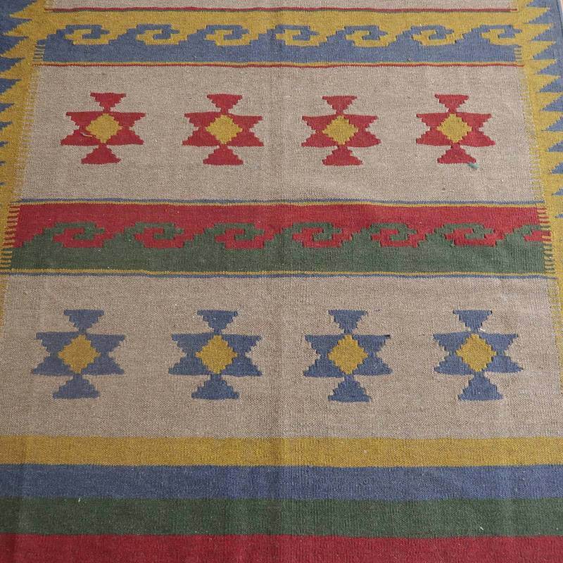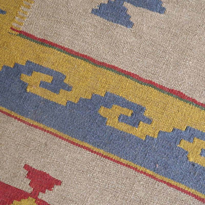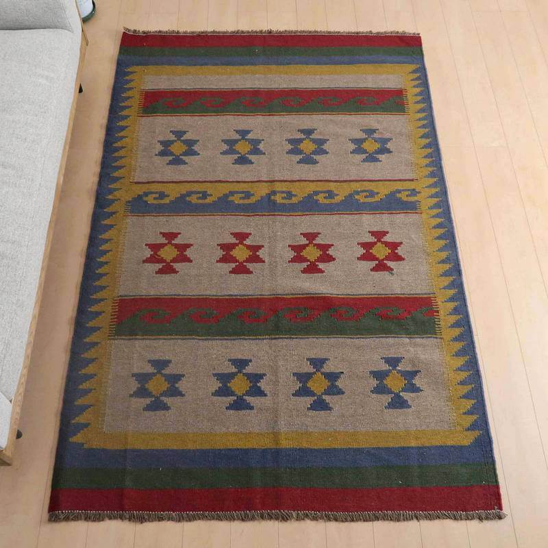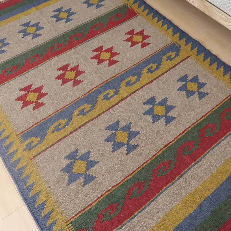 ギャッベでお馴染みのシラーズ地方カシュガイ族に伝わるキリムです。いくつかの色を使用した幾何学柄やギザギザ文様はリズムのある明るい雰囲気。程よく落ち着いた色とウールの風合いが、やさしくインテリアに馴染みます。カシュガイの女性が昔ながらに織り上げたキリムなので、よく締まった丈夫な織り目で、早く仕上げる為、ゆるく粗く織られる商用生産のキリムには無い、誠実さが伝わってくる一枚です。また、平織り(ひらおり)という裏表の無い織り方で両面使えます。カシュガイ族の遊牧のテント生活用の為、丈夫に織られ、洗濯も簡単、床なじみの良い適度な厚さで、普段使いのラグとして大変使いやすいキリムです。