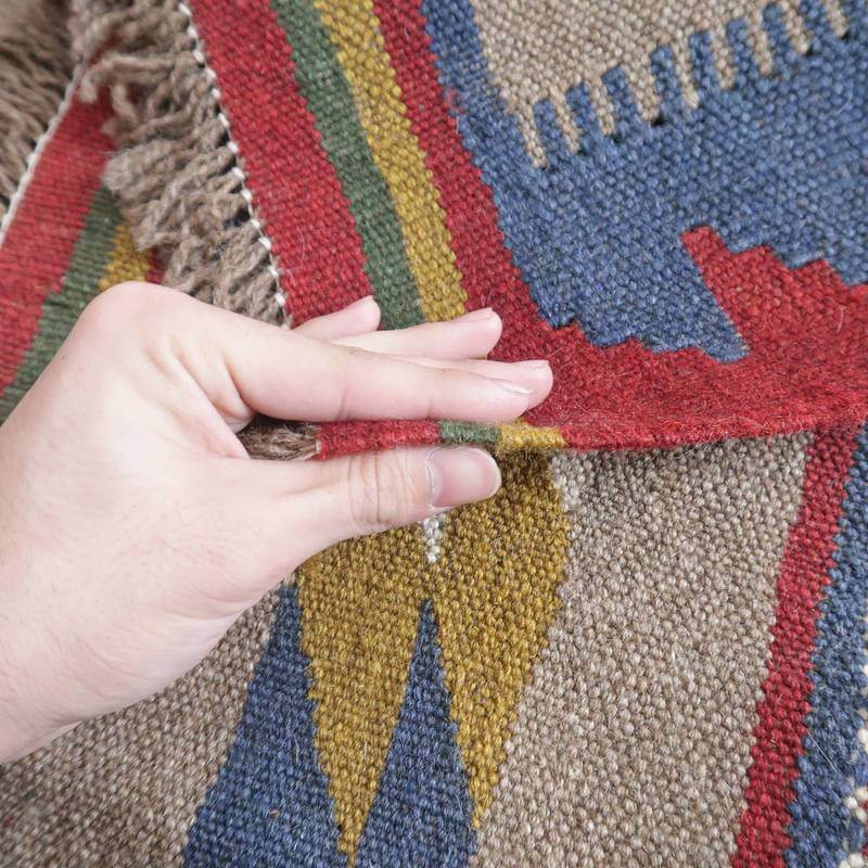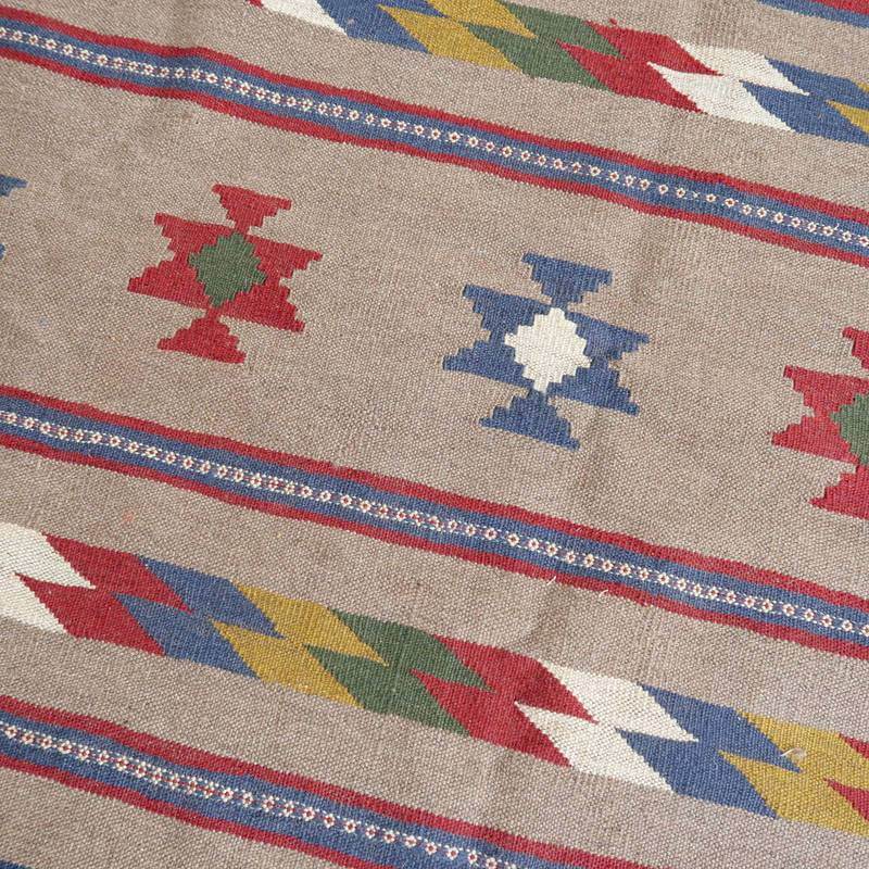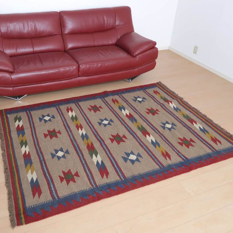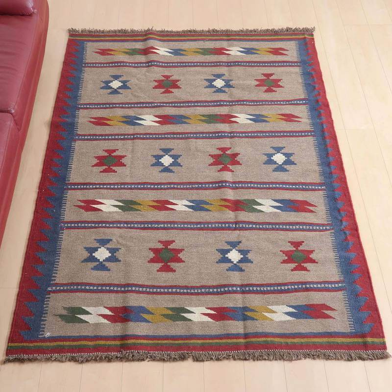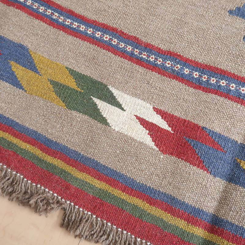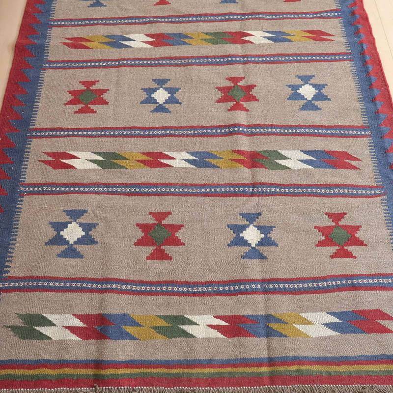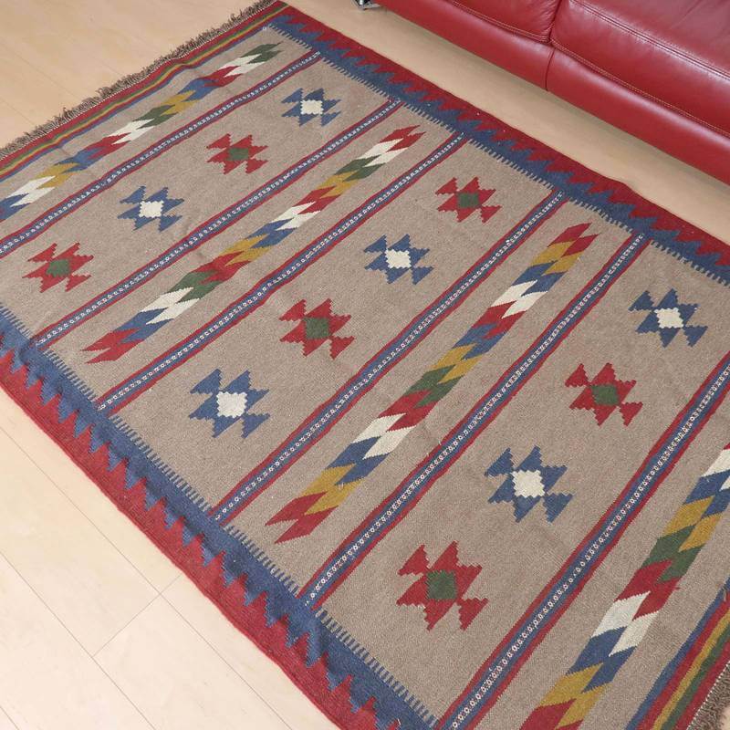 イラン南部シラーズ地方のキリムです。いくつかの色を使用した幾何学柄やギザギザ文様はリズムのある明るい雰囲気。使用している色はどれも、くすみのある落ち着いた色なので、目立たずインテリアに馴染みます。カシュガイの女性が昔ながらに織り上げたキリムなので、よく締まった丈夫な織り目で、早く仕上げる為、ゆるく粗く織られる商用生産のキリムには無い、誠実さが伝わってくる一枚です。また、平織り(ひらおり)という裏表の無い織り方で両面使えます。カシュガイ・キリムは遊牧のテント生活用の為、丈夫に織られ、洗濯も簡単、普段使いのラグとして扱いやすいキリムです。