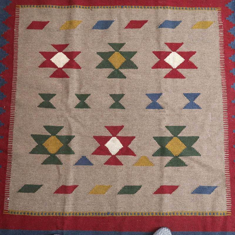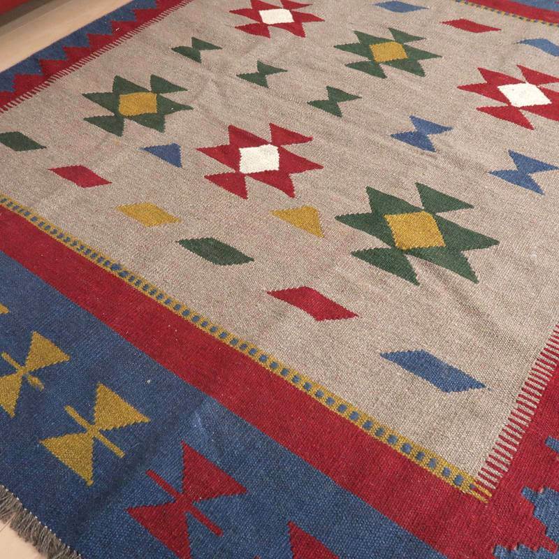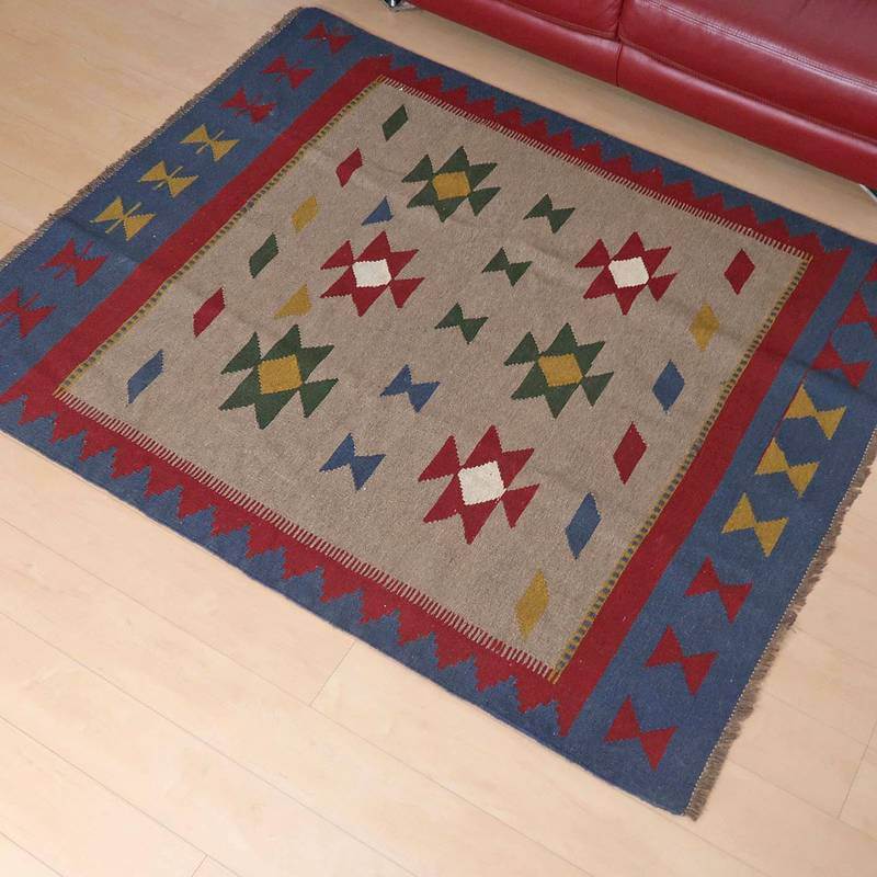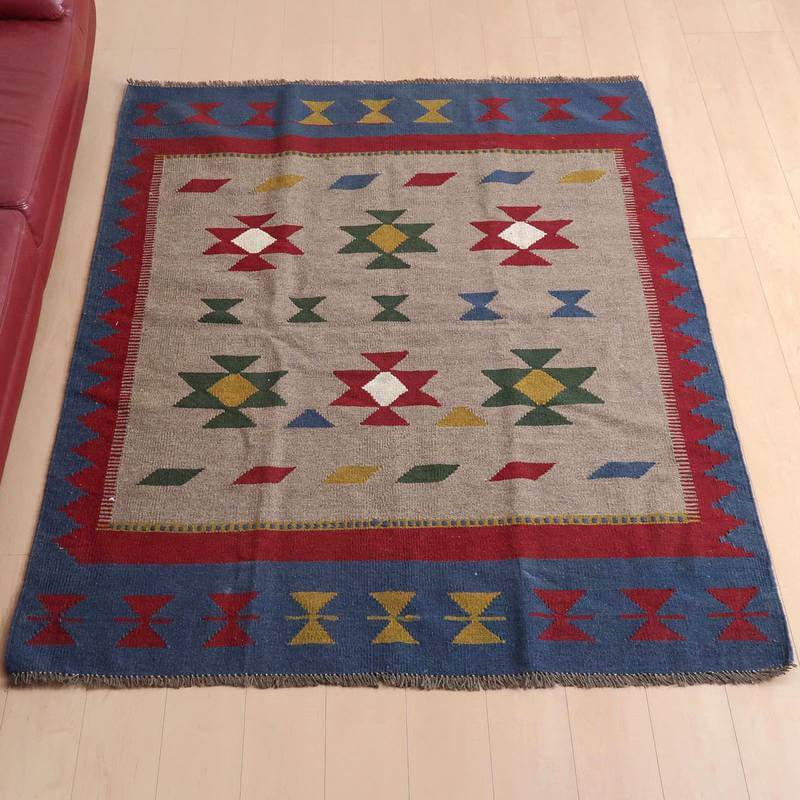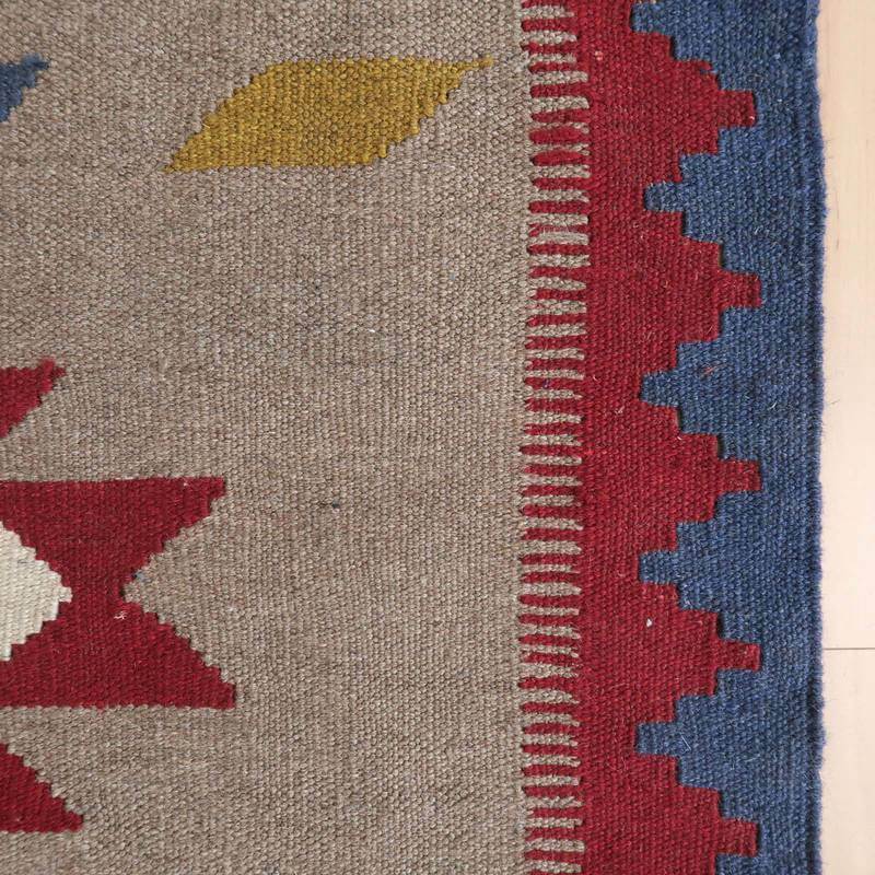 イラン南部シラーズ地方のキリムです。いくつかの色を使用した幾何学柄やギザギザ文様はリズムのある明るい雰囲気。使用している色はどれも、くすみのある落ち着いた色なので、目立たずインテリアに馴染みます。カシュガイの女性が昔ながらに織り上げたキリムなので、よく締まった丈夫な織り目で、早く仕上げる為、ゆるく粗く織られる商用生産のキリムには無い、誠実さが伝わってくる一枚です。また、平織り(ひらおり)という裏表の無い織り方で両面使えます。カシュガイ・キリムは遊牧のテント生活用の為、丈夫に織られ、洗濯も簡単、普段使いのラグとして扱いやすいキリムです。