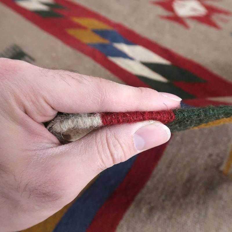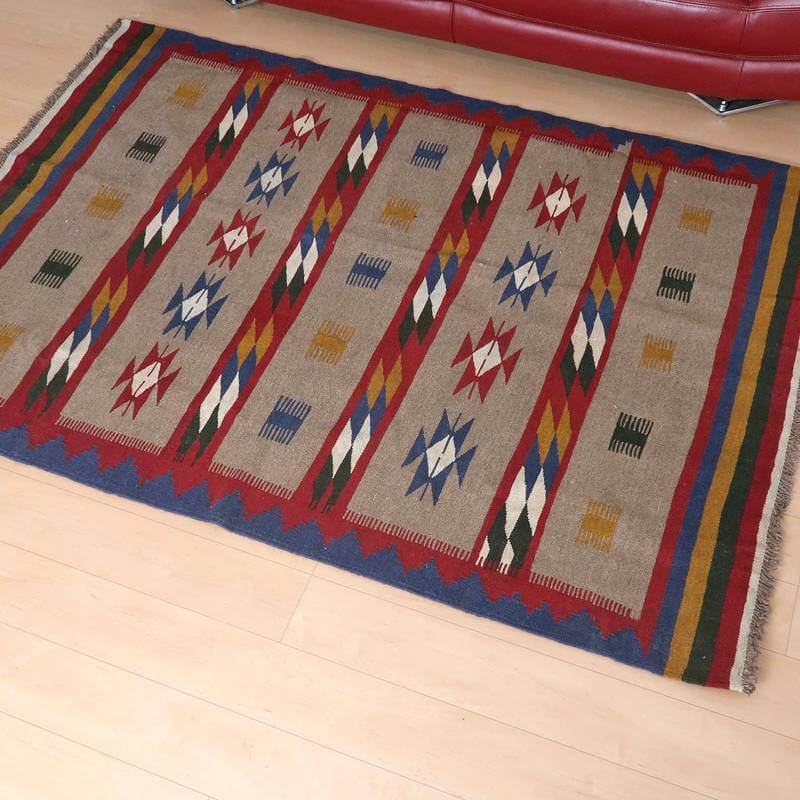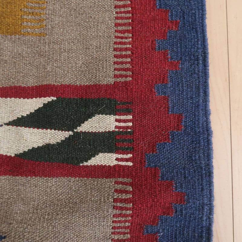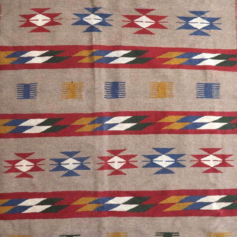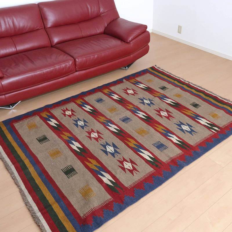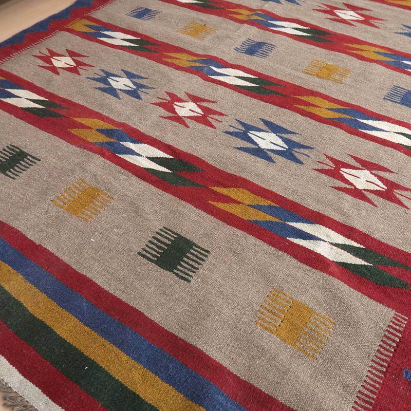 イラン南部シラーズ地方のキリムです。いくつかの色を使用した幾何学柄やギザギザ文様はリズムのある明るい雰囲気。使用している色はどれも、くすみのある落ち着いた色なので、目立たずインテリアに馴染みます。カシュガイの女性が昔ながらに織り上げたキリムなので、よく締まった丈夫な織り目で、早く仕上げる為、ゆるく粗く織られる商用生産のキリムには無い、誠実さが伝わってくる一枚です。また、平織り(ひらおり)という裏表の無い織り方で両面使えます。カシュガイ・キリムは遊牧のテント生活用の為、丈夫に織られ、洗濯も簡単、普段使いのラグとして扱いやすいキリムです。