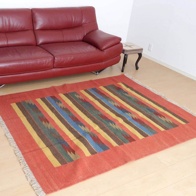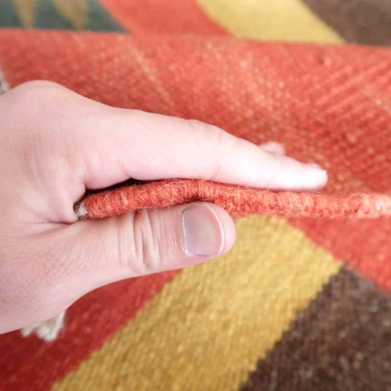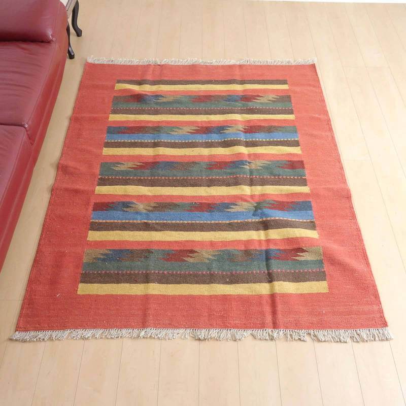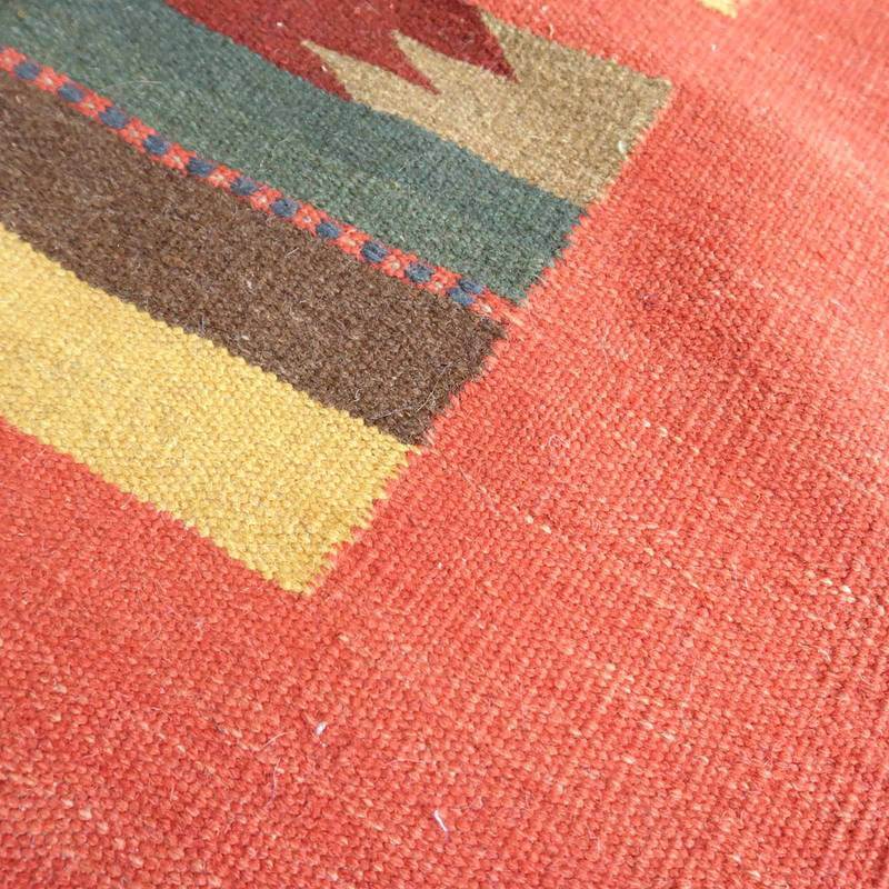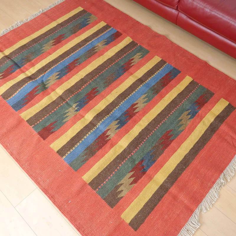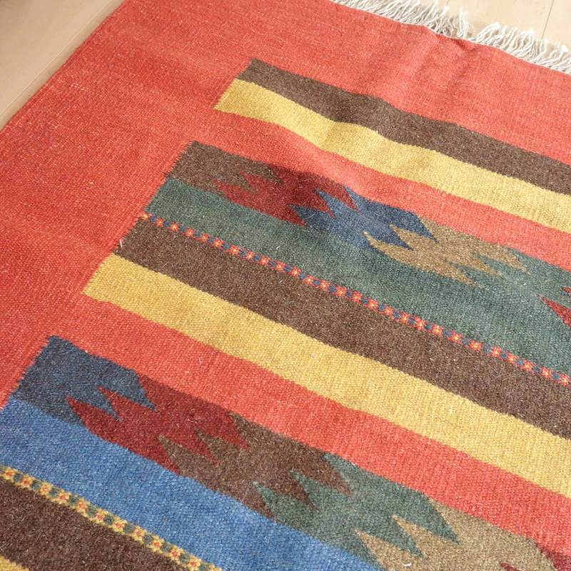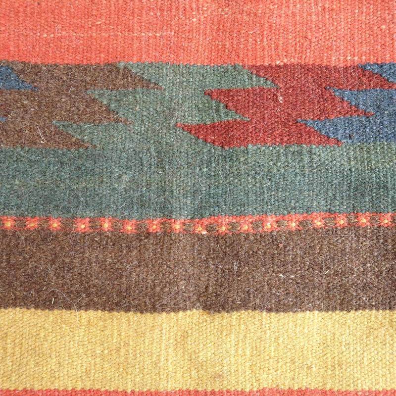 イラン南部シラーズ地方のキリムです。いくつかの色を使用した幾何学柄やギザギザ文様はリズムのある明るい雰囲気。程よく落ち着いた色とウールの風合いが、やさしくインテリアに馴染みます。カシュガイの女性が昔ながらに織り上げたキリムなので、よく締まった丈夫な織り目で、早く仕上げる為、ゆるく粗く織られる商用生産のキリムには無い、誠実さが伝わってくる一枚です。また、平織り(ひらおり)という裏表の無い織り方で両面使えます。カシュガイ族の遊牧のテント生活用の為、丈夫に織られ、洗濯も簡単、床なじみの良い適度な厚さで、普段使いのラグとして大変使いやすいキリムです。
