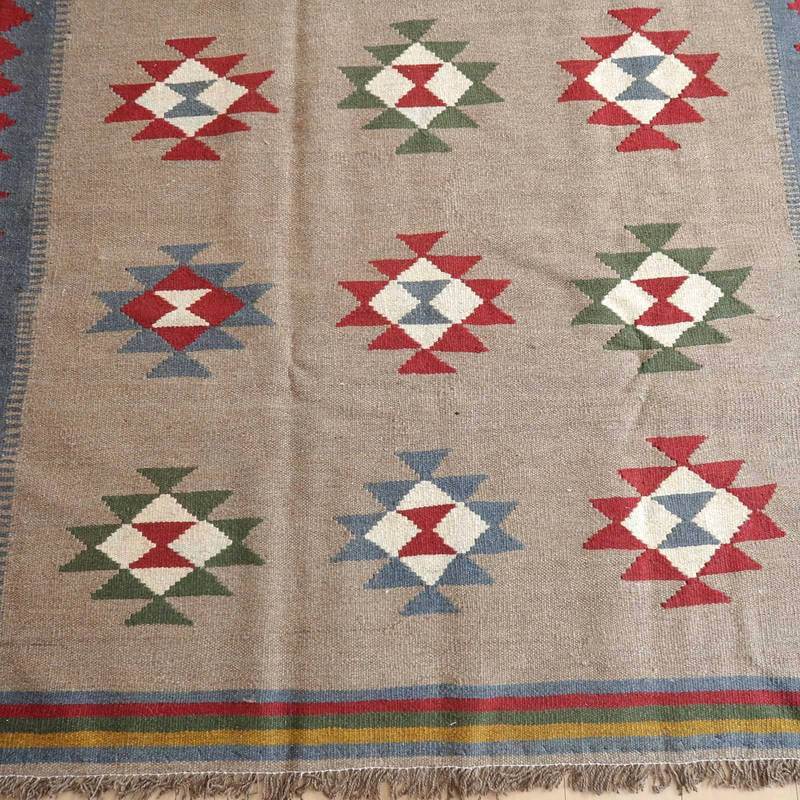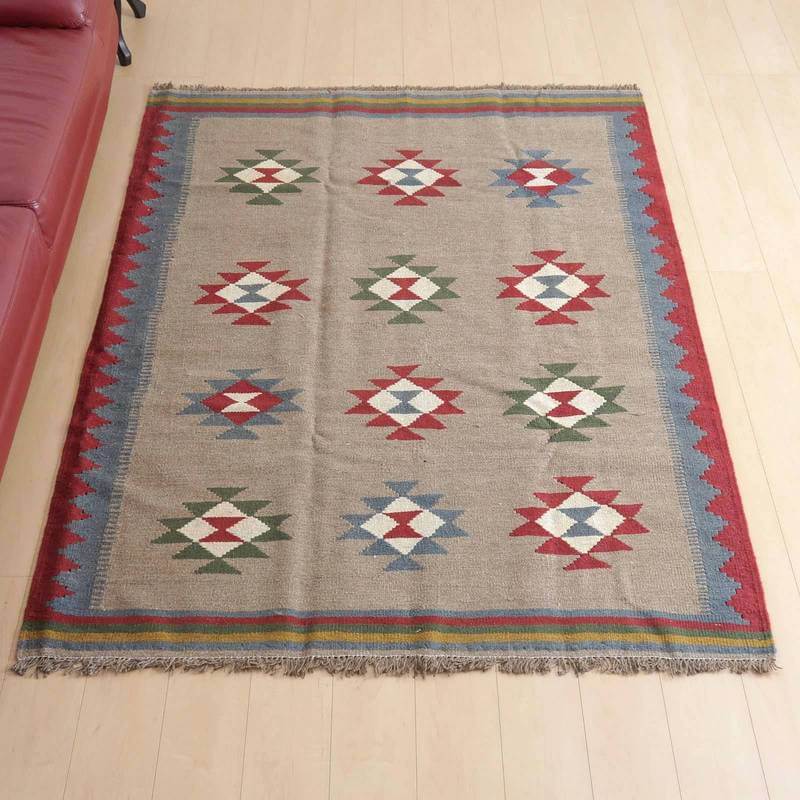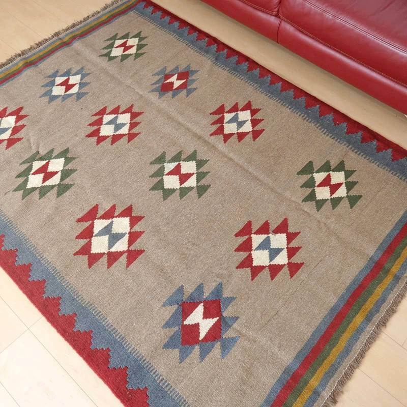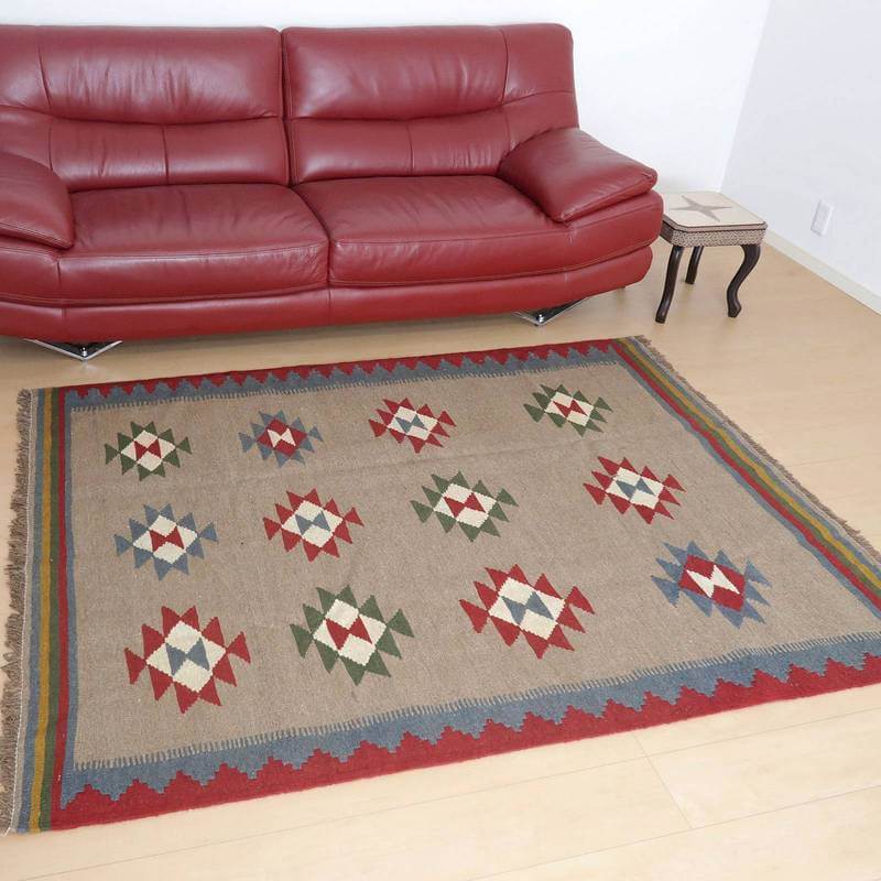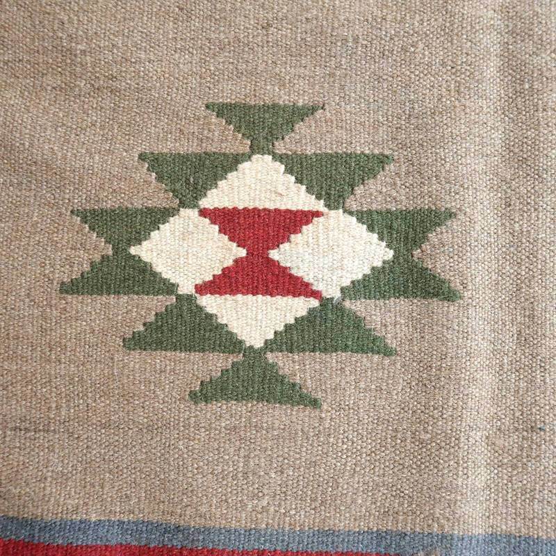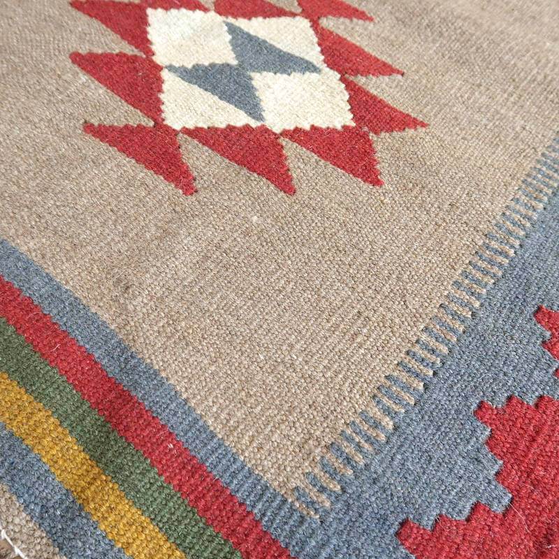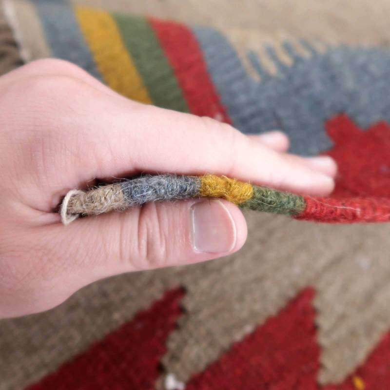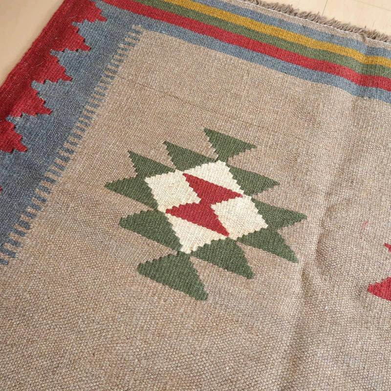 イラン南部シラーズ地方のキリムです。いくつかの色を使用した幾何学柄やギザギザ文様はリズムのある明るい雰囲気。程よく落ち着いた色とウールの風合いが、やさしくインテリアに馴染みます。カシュガイの女性が昔ながらに織り上げたキリムなので、よく締まった丈夫な織り目で、早く仕上げる為、ゆるく粗く織られる商用生産のキリムには無い、誠実さが伝わってくる一枚です。また、平織り(ひらおり)という裏表の無い織り方で両面使えます。カシュガイ族の遊牧のテント生活用の為、丈夫に織られ、洗濯も簡単、床なじみの良い適度な厚さで、普段使いのラグとして大変使いやすいキリムです。