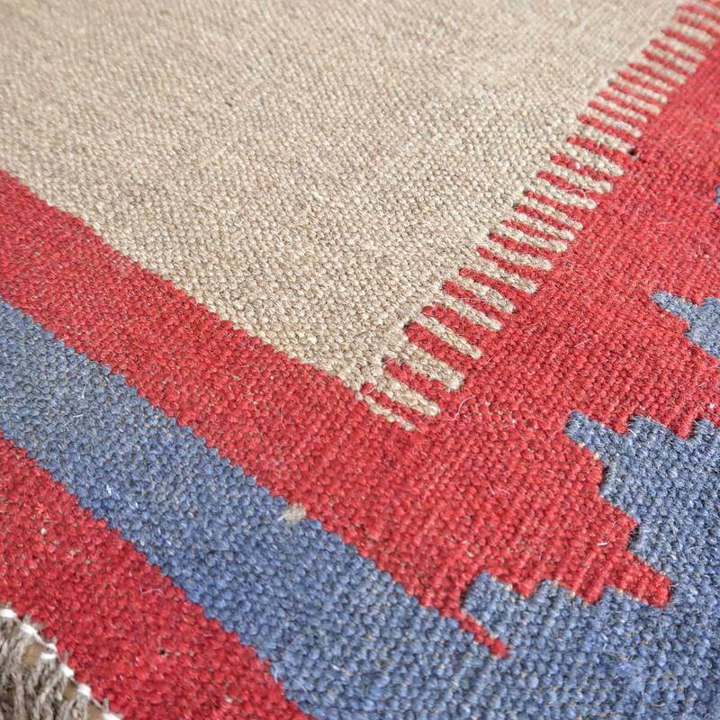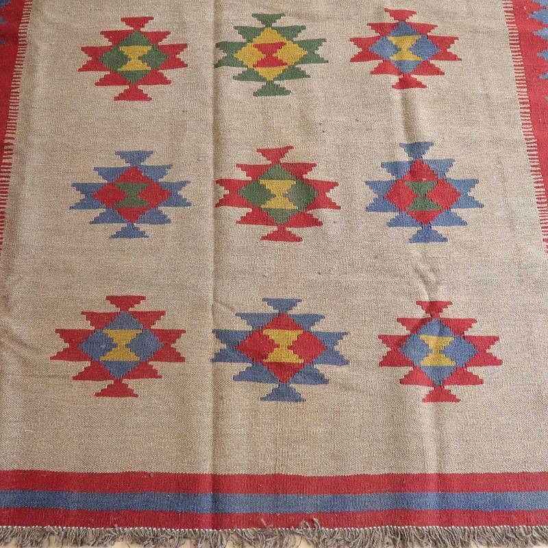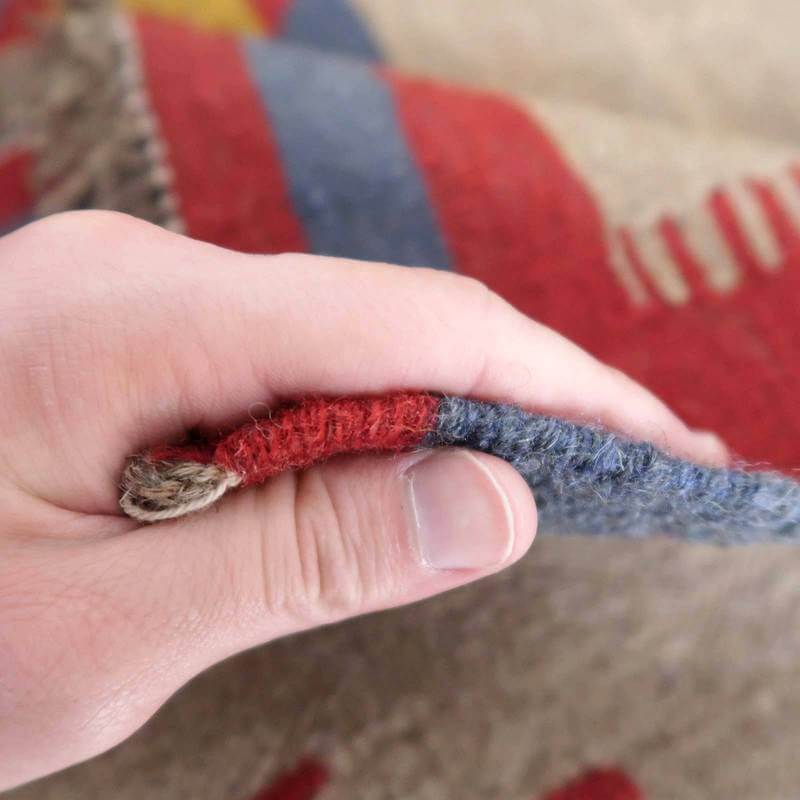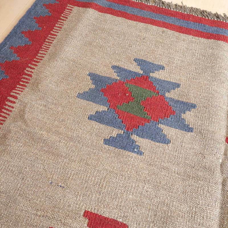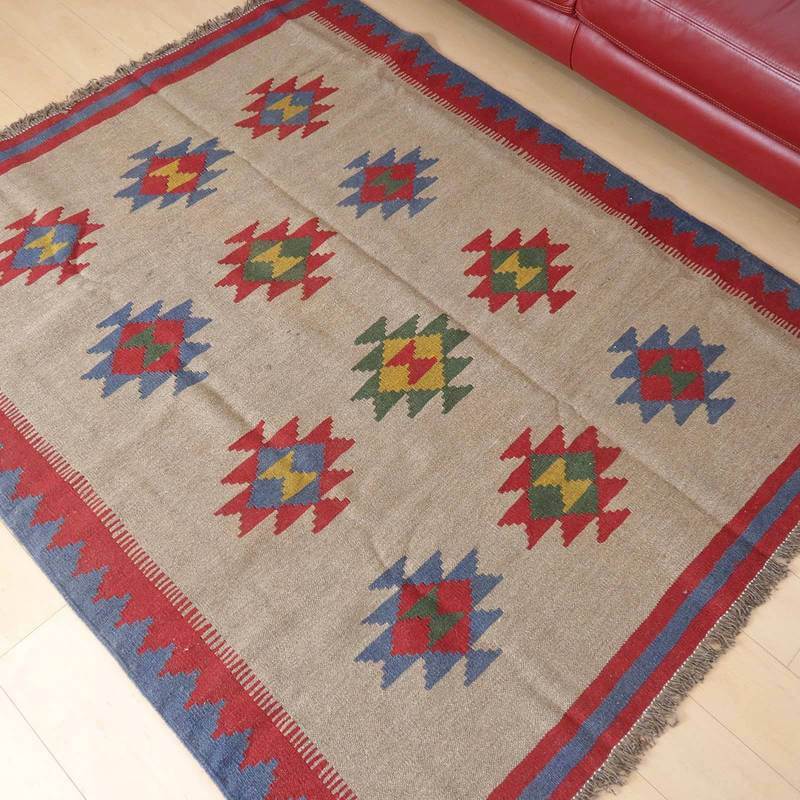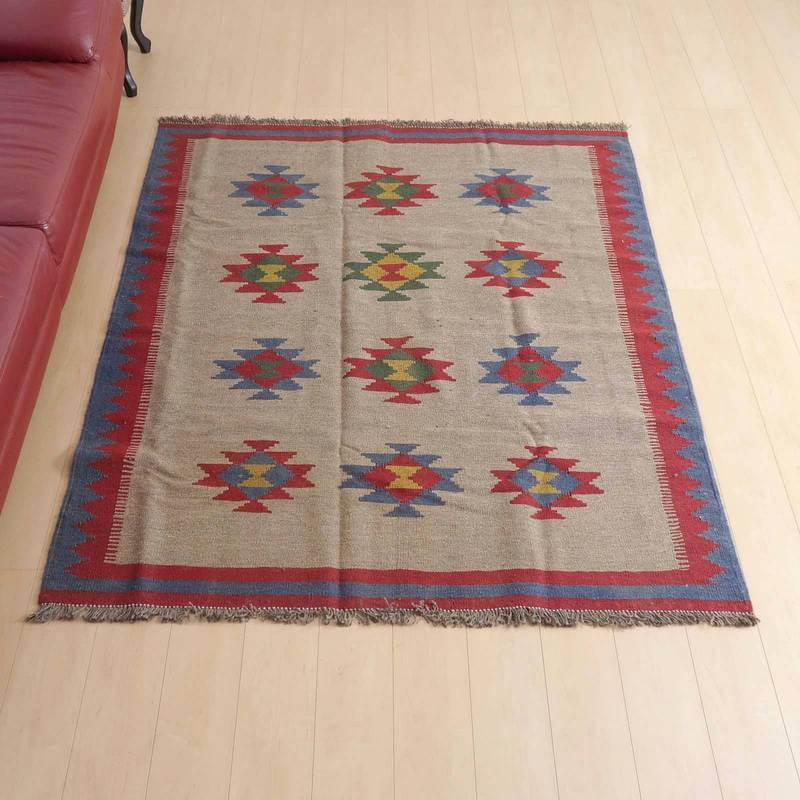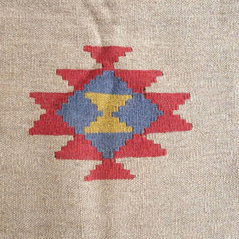 イラン南部シラーズ地方のキリムです。いくつかの色を使用した幾何学柄やギザギザ文様はリズムのある明るい雰囲気。程よく落ち着いた色とウールの風合いが、やさしくインテリアに馴染みます。カシュガイの女性が昔ながらに織り上げたキリムなので、よく締まった丈夫な織り目で、早く仕上げる為、ゆるく粗く織られる商用生産のキリムには無い、誠実さが伝わってくる一枚です。また、平織り(ひらおり)という裏表の無い織り方で両面使えます。カシュガイ族の遊牧のテント生活用の為、丈夫に織られ、洗濯も簡単、床なじみの良い適度な厚さで、普段使いのラグとして大変使いやすいキリムです。