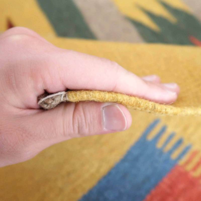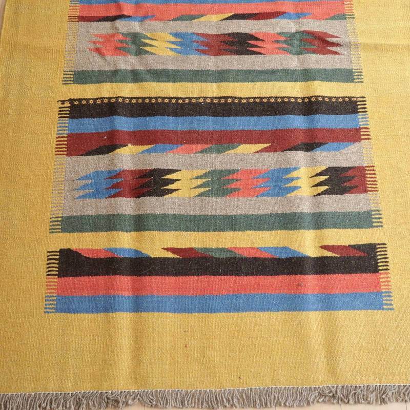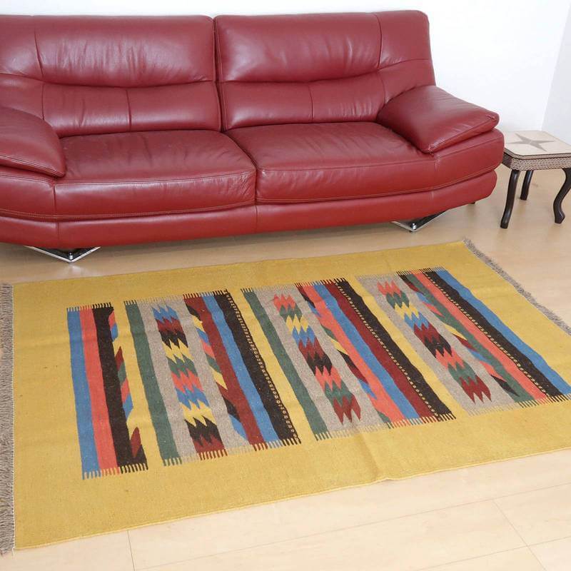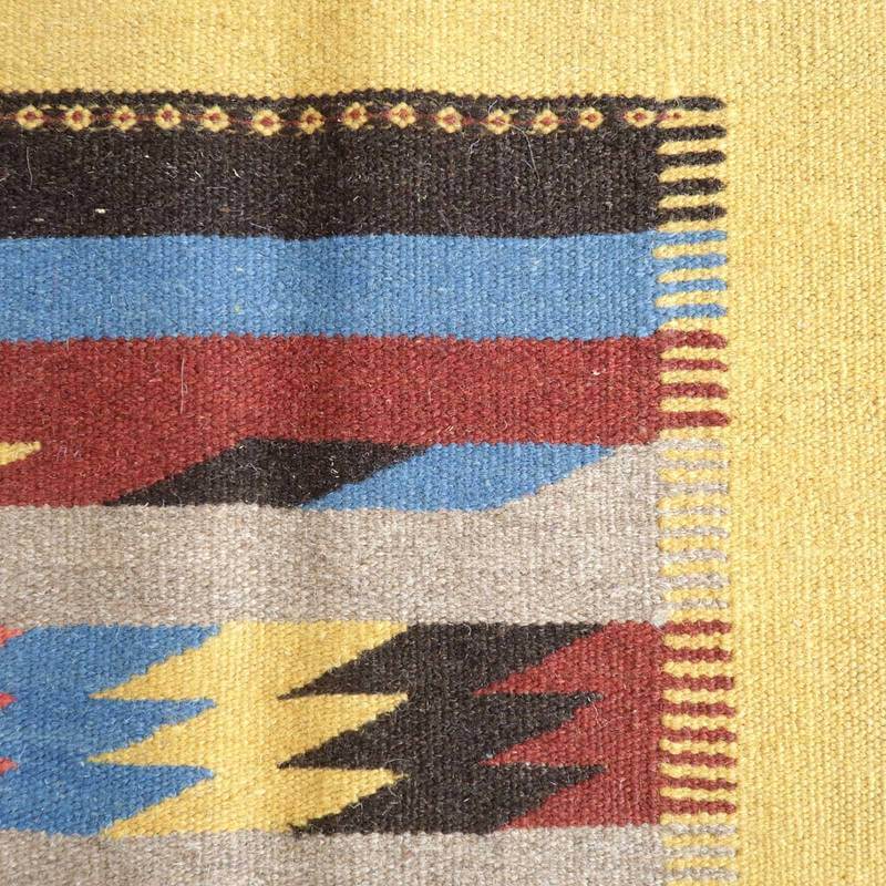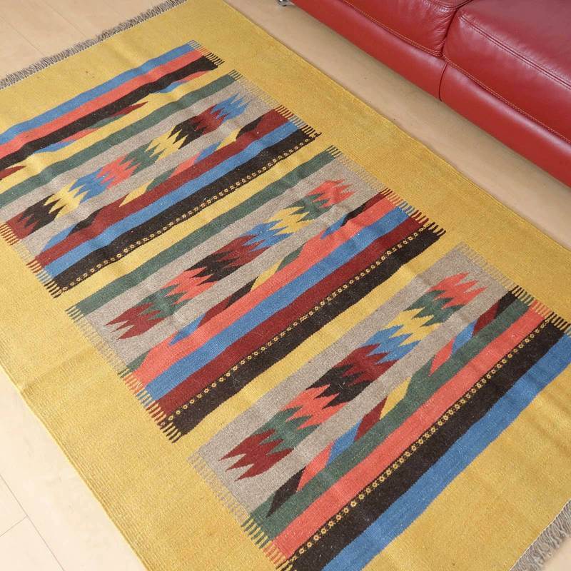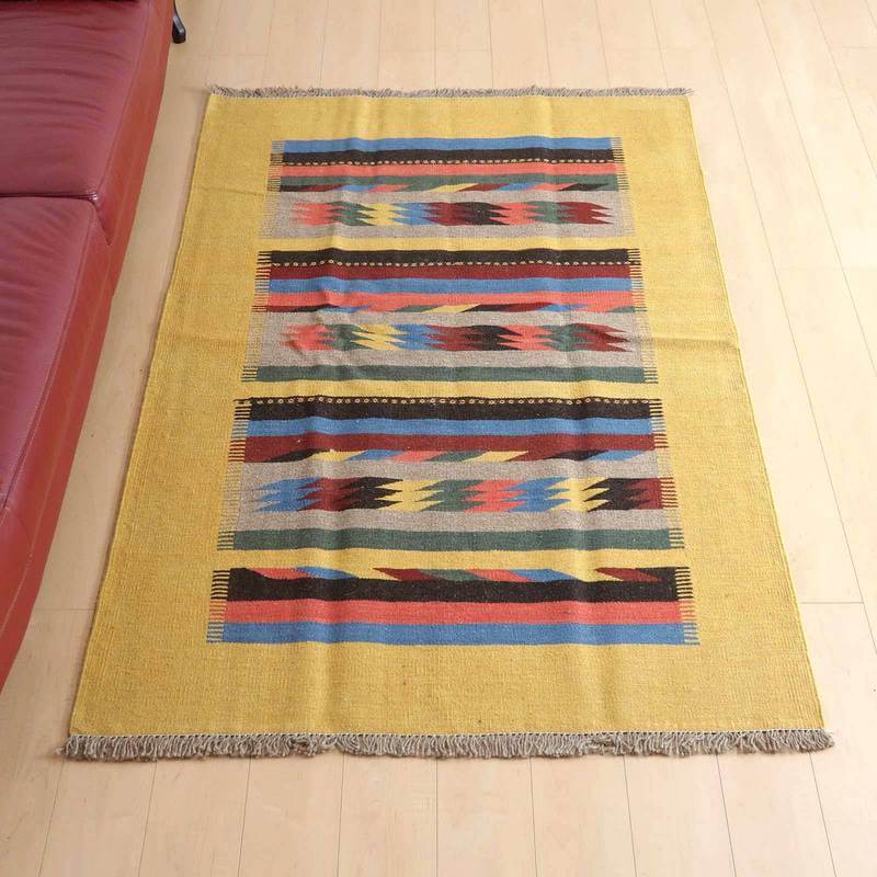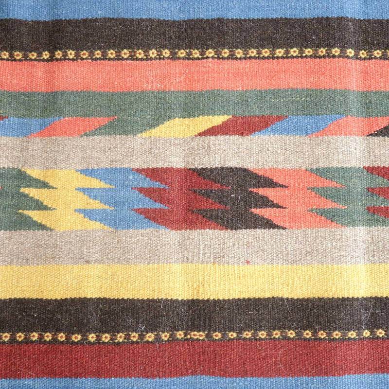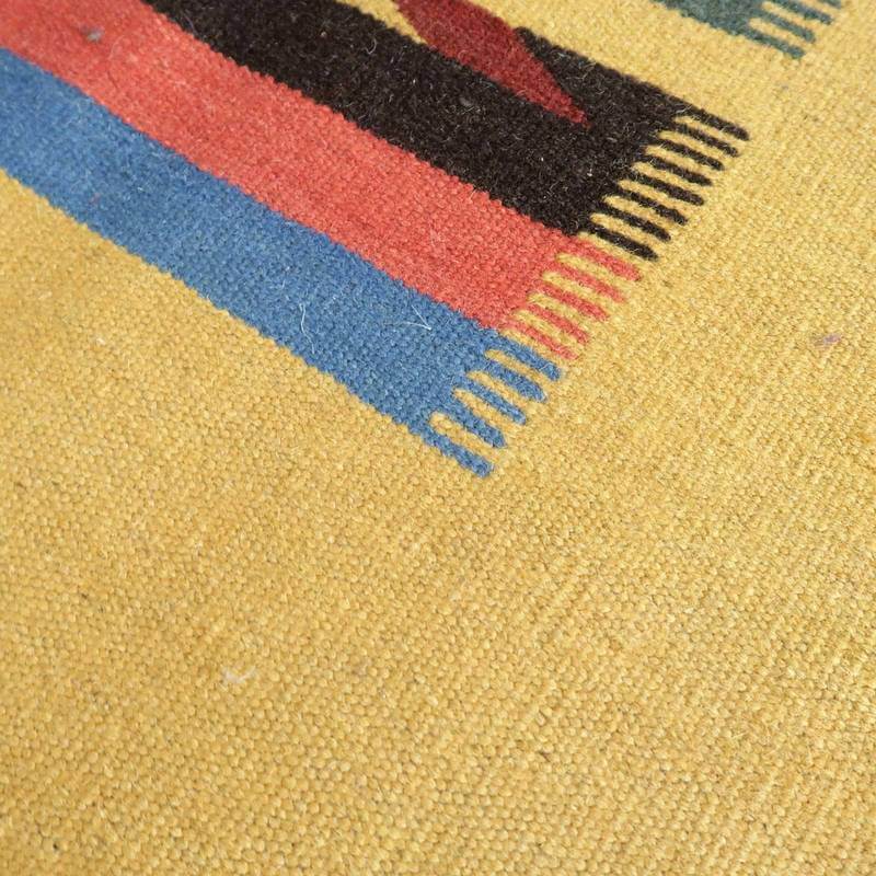 イラン南部シラーズ地方のキリムです。いくつかの色を使用した幾何学柄やギザギザ文様はリズムのある明るい雰囲気。程よく落ち着いた色とウールの風合いが、やさしくインテリアに馴染みます。カシュガイの女性が昔ながらに織り上げたキリムなので、よく締まった丈夫な織り目で、早く仕上げる為、ゆるく粗く織られる商用生産のキリムには無い、誠実さが伝わってくる一枚です。また、平織り(ひらおり)という裏表の無い織り方で両面使えます。カシュガイ族の遊牧のテント生活用の為、丈夫に織られ、洗濯も簡単、床なじみの良い適度な厚さで、普段使いのラグとして大変使いやすいキリムです。