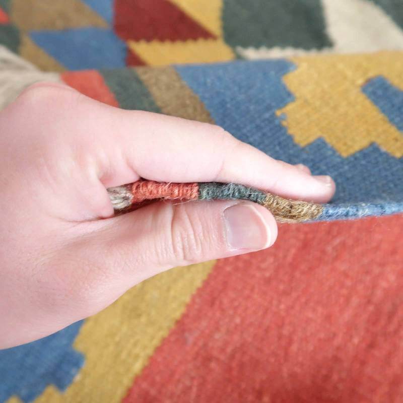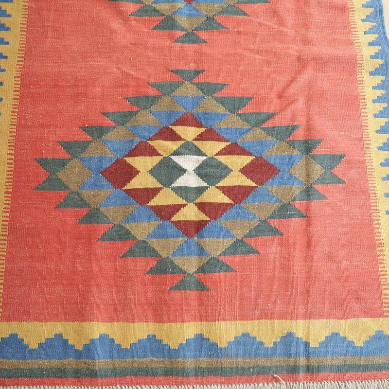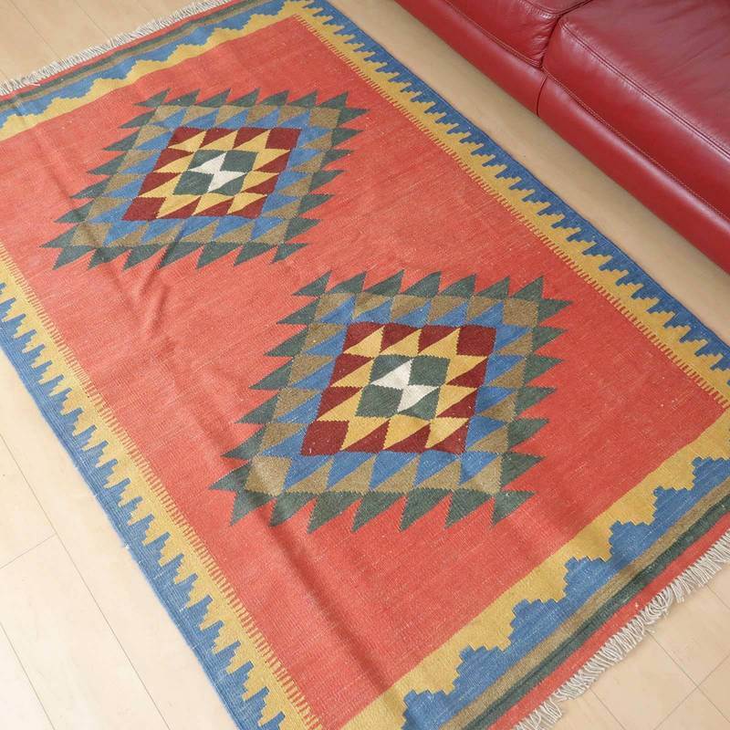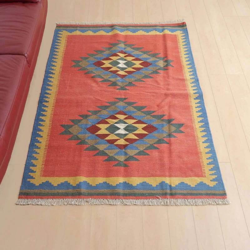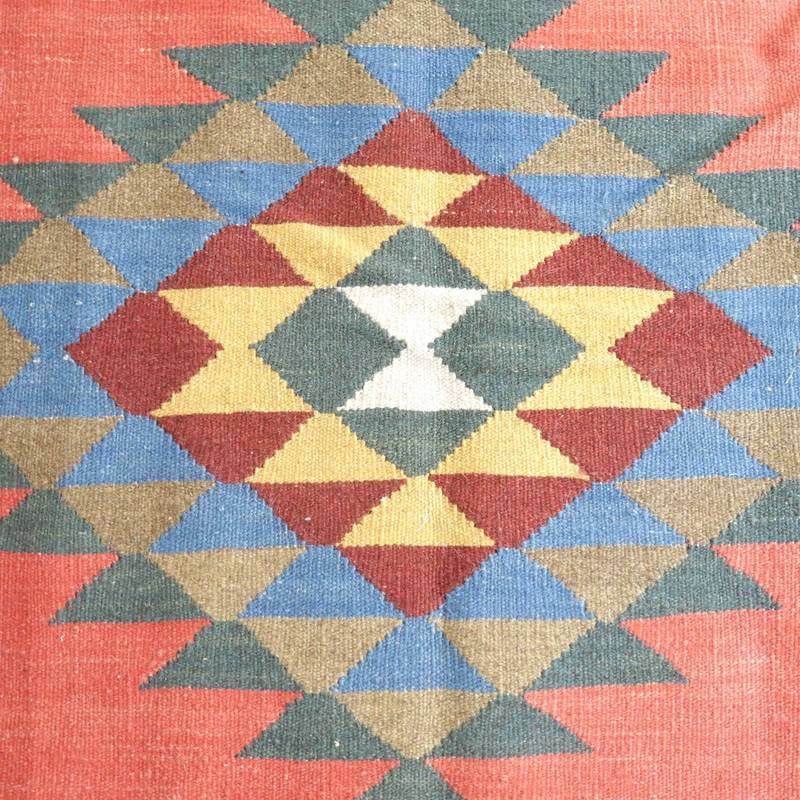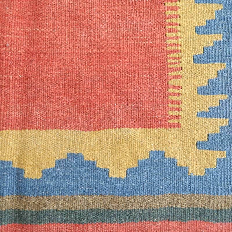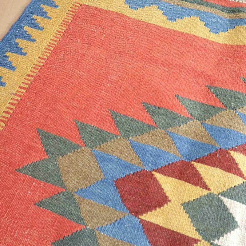 イラン南部シラーズ地方のキリムです。いくつかの色を使用した幾何学柄やギザギザ文様はリズムのある明るい雰囲気。程よく落ち着いた色とウールの風合いが、やさしくインテリアに馴染みます。カシュガイの女性が昔ながらに織り上げたキリムなので、よく締まった丈夫な織り目で、早く仕上げる為、ゆるく粗く織られる商用生産のキリムには無い、誠実さが伝わってくる一枚です。また、平織り(ひらおり)という裏表の無い織り方で両面使えます。カシュガイ族の遊牧のテント生活用の為、丈夫に織られ、洗濯も簡単、床なじみの良い適度な厚さで、普段使いのラグとして大変使いやすいキリムです。