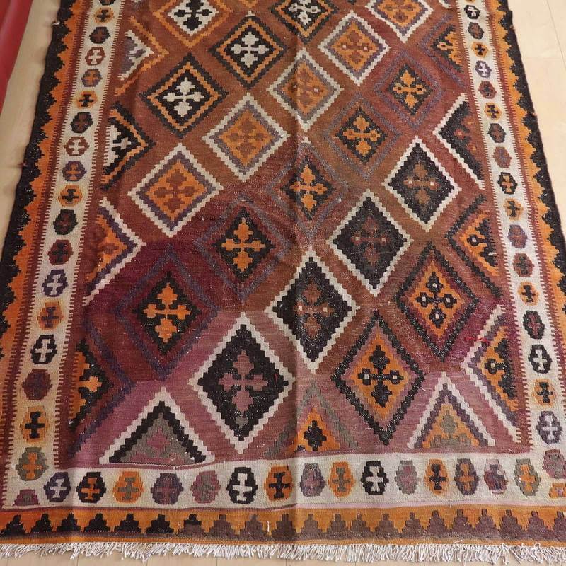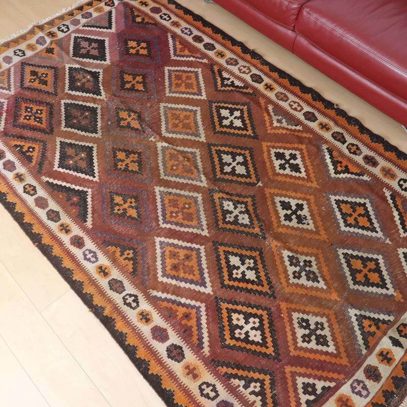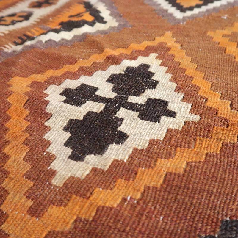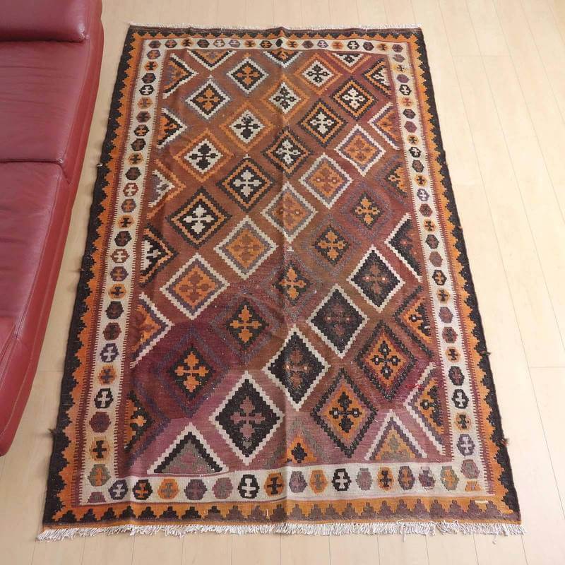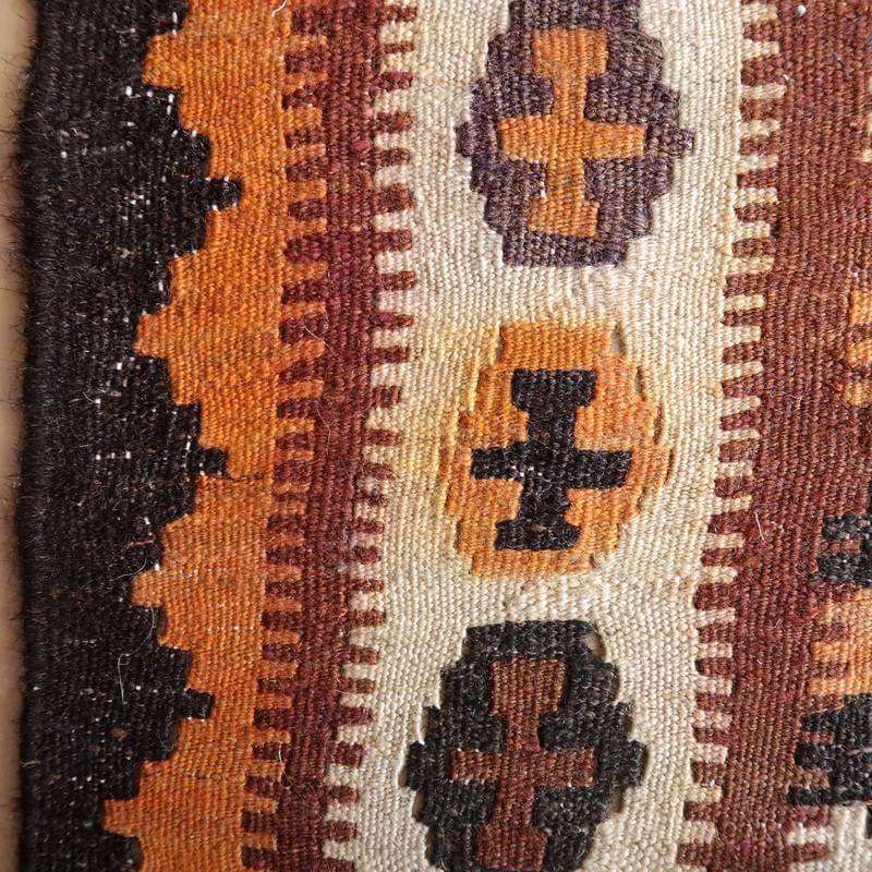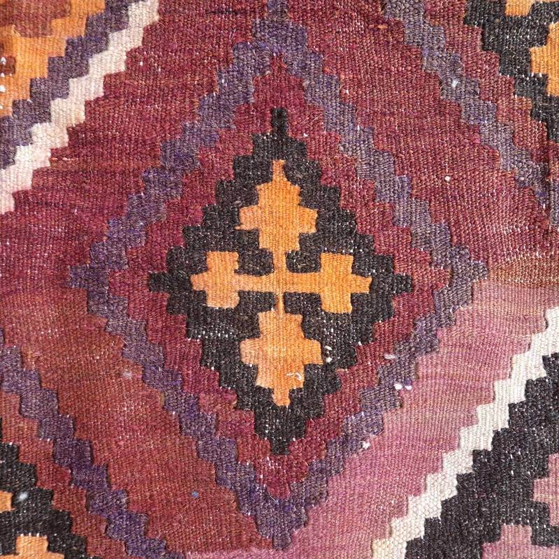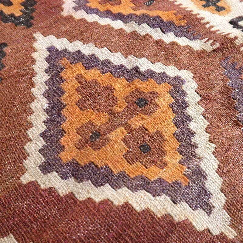 紫からさび色へと移り変わる地色のグラデーションや所々に見られる色のにじみの風合いが、オールド感の魅力あふれるカラー。こなれた手触りや色には時の流れを感じますが、イラン南部シラーズ地方特有の幾何学柄やギザギザ文様は織られた当時のままの様子を留めていて、時の経過を思うとしみじみと感じ入るものもあります。平織り(ひらおり)という裏表の無い織り方で両面使えます。カシュガイ族の遊牧のテント生活用の為、丈夫に織られ、洗濯も簡単、床なじみの良い適度な厚さで、普段使いのラグとして大変使いやすいキリムです。