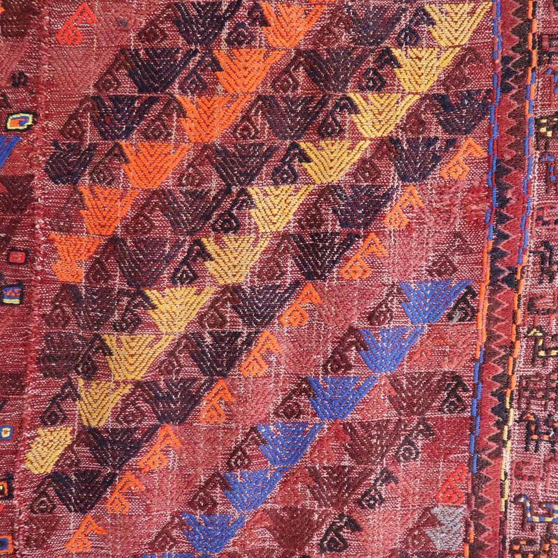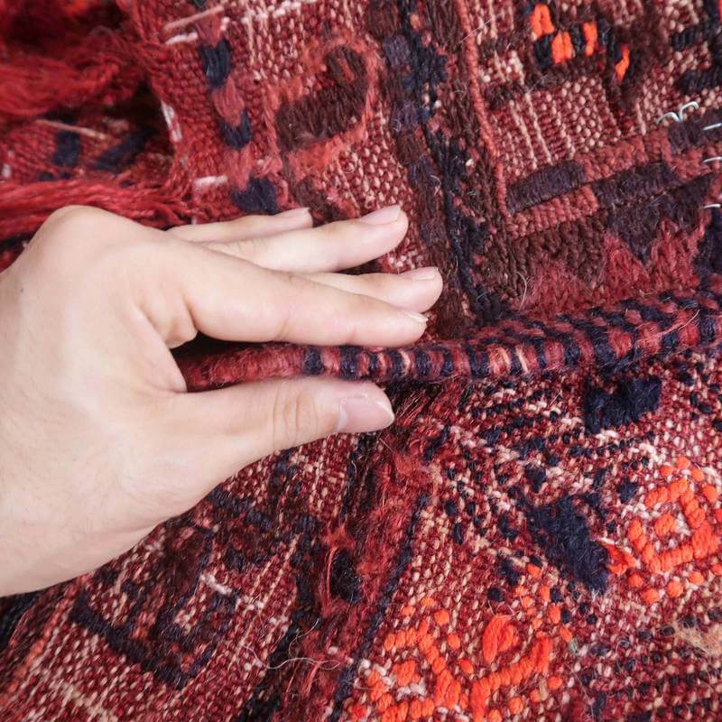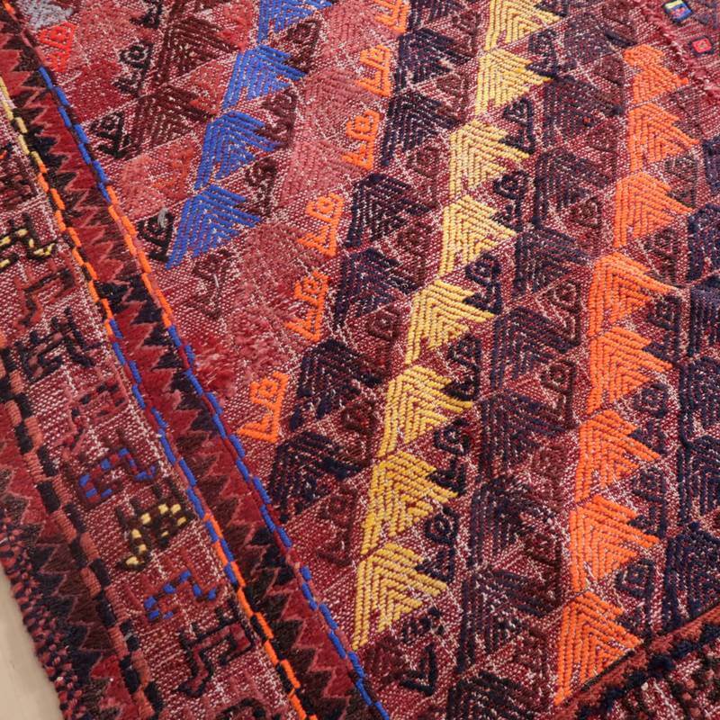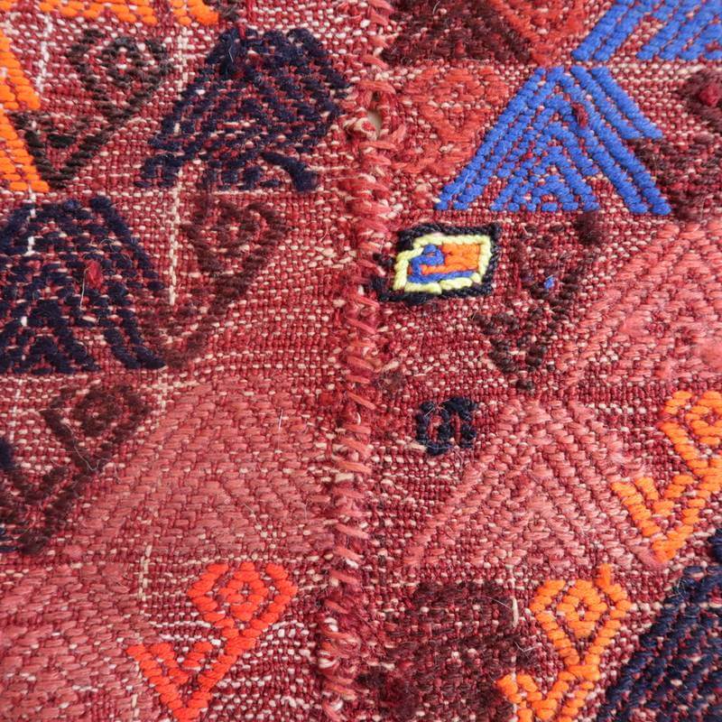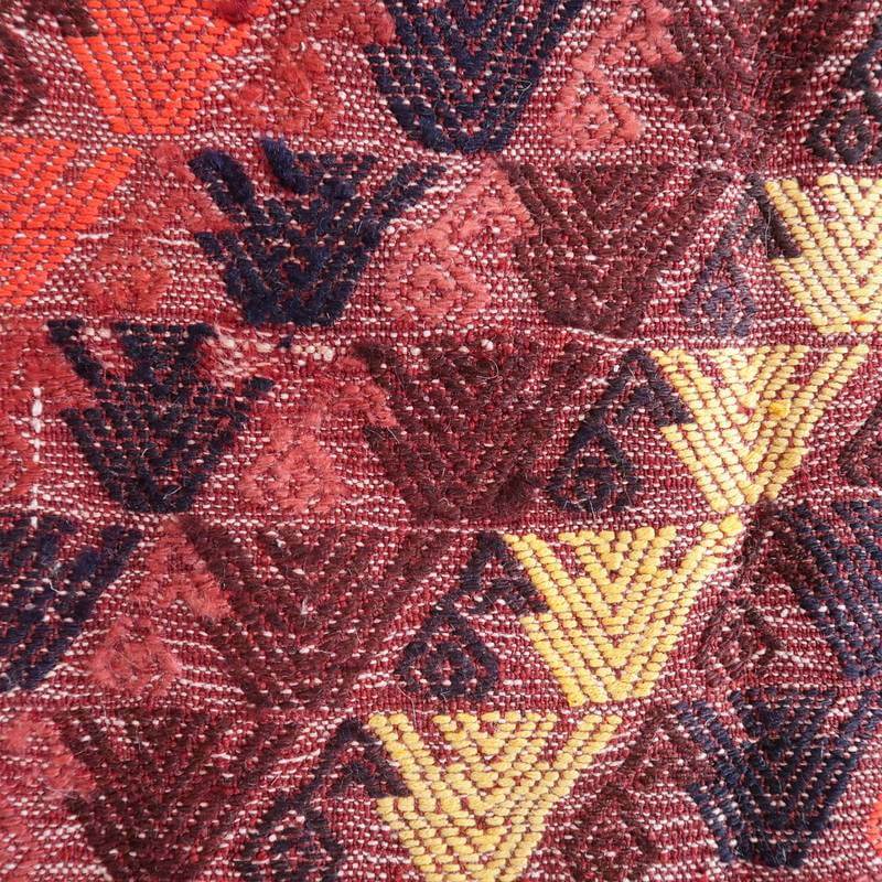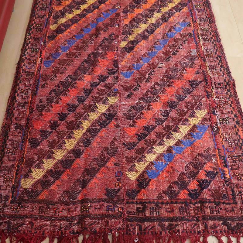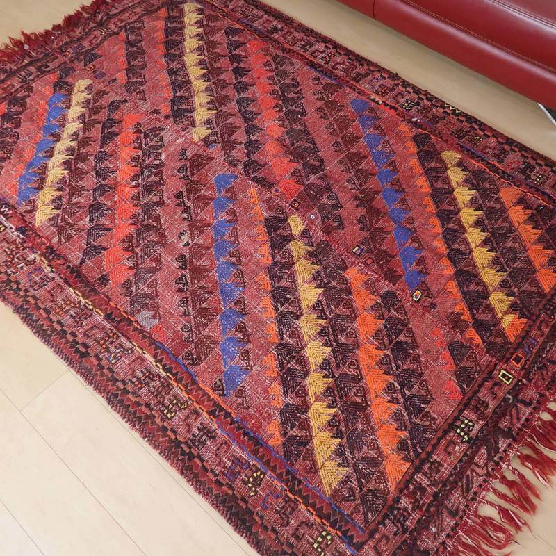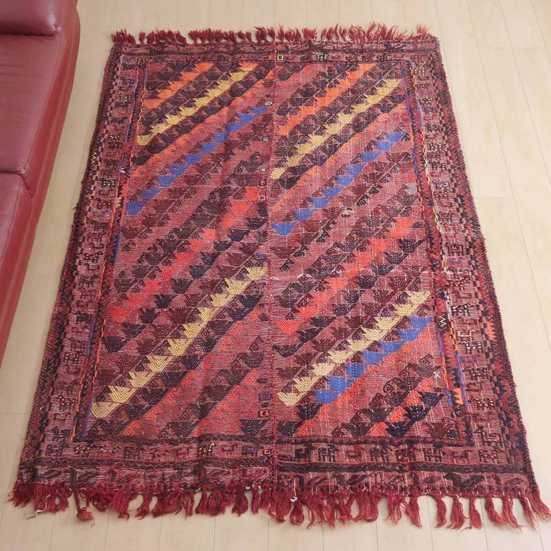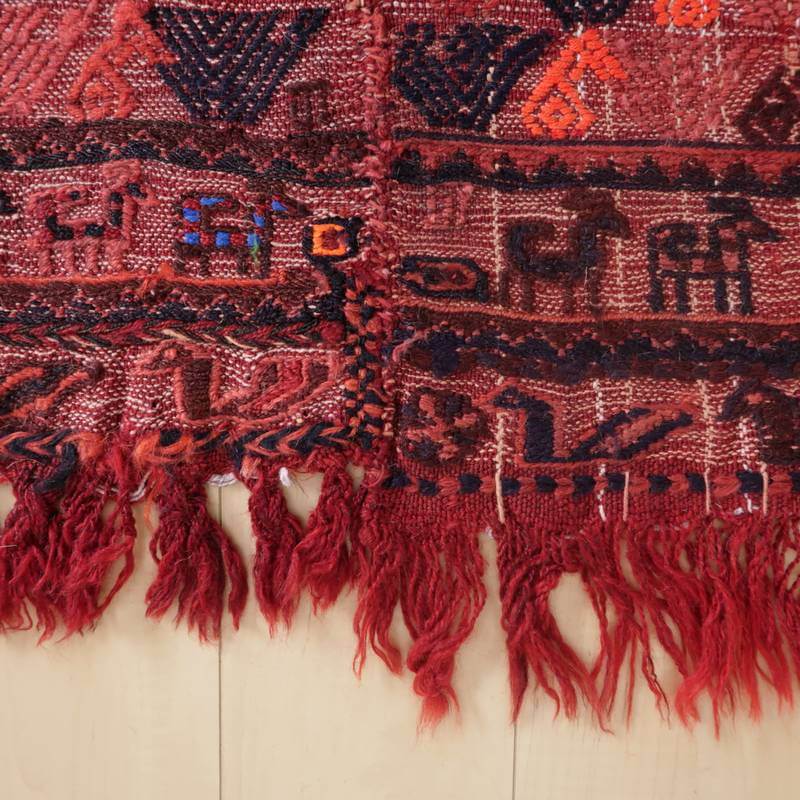 重厚感を感じさせる深みのあるシックな赤色。色を切り替えて斜めに繰り返される刺繍のようなモチーフと周囲はぐるりと並んだ動物の連続文様。細かく織られた生地には、縦糸をあえて見せるようなかすれた織り地の風合い、また縦糸を長く残してルーズにまとめたフサの風合いには素朴な野性味があって、遠いイランの片田舎の空気感がダイレクトに感じられ、手織りファンにはゾクゾクと胸が踊るような粗野さがあります。ビビッドな化学染料の織り手にしてみれば「明るい色を入れたらきれいだよね」と使ったのだと思います。生地の手触りはてろんと沿うようなしなやかさがあり、20~30年程度のオールドキリムと考えられます。中心で縦半分にざくっと縫い合わせられていて、商用生産品には絶対見られない、家庭織りならではの珍品といえます。上端で149センチ、下端で156センチと横幅に手織りならではの違いがございます。