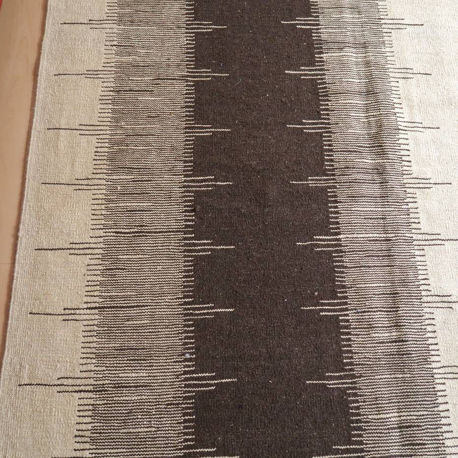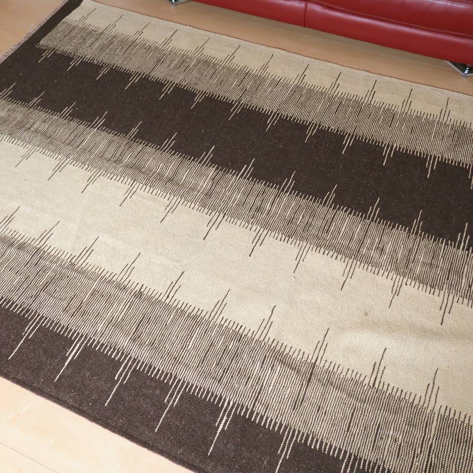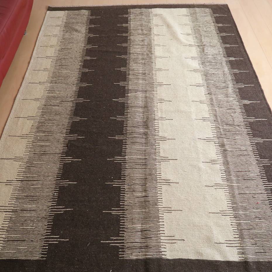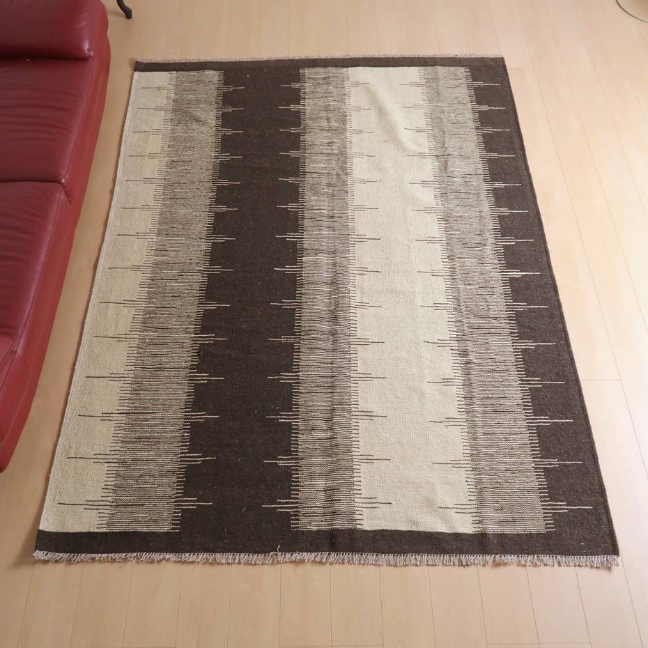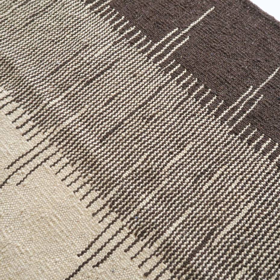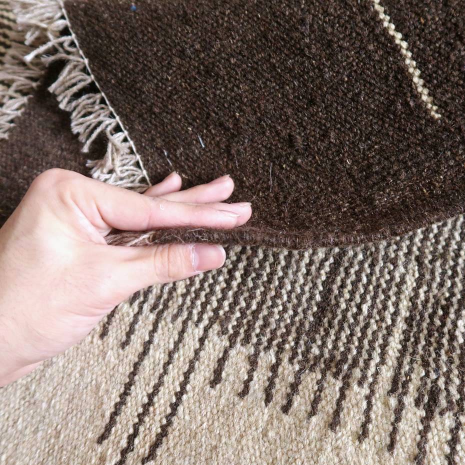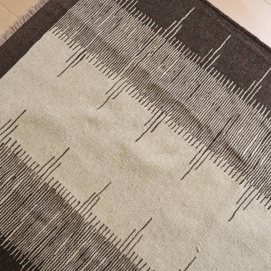 ギャッベでお馴染みのシラーズ地方カシュガイ族に伝わるキリムです。生成りや茶、グレーなどの元々の羊の毛色をそのまま活かした無染色のウールを使用したナチュラルカラーなので、敷く場所を選ばず、落ち着いた雰囲気で馴染みます。幾何学やギザギザ文様のシンプルな中にもリズムのあるモダンなデザイン。カシュガイの女性が昔ながらに織り上げたキリムなので、よく締まった丈夫な織り目で、早く仕上げる為、ゆるく粗く織られる商用生産のキリムには無い、誠実さと愛着が感じられる味わい深さがあります。作りは、平織り(ひらおり)という裏表の無い、両面を使える織り方。カシュガイ・キリムは遊牧のテント生活用の為、丈夫に織られ、洗濯も簡単、普段使いのラグとして扱いやすいキリムです。