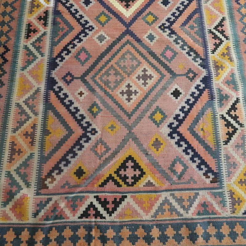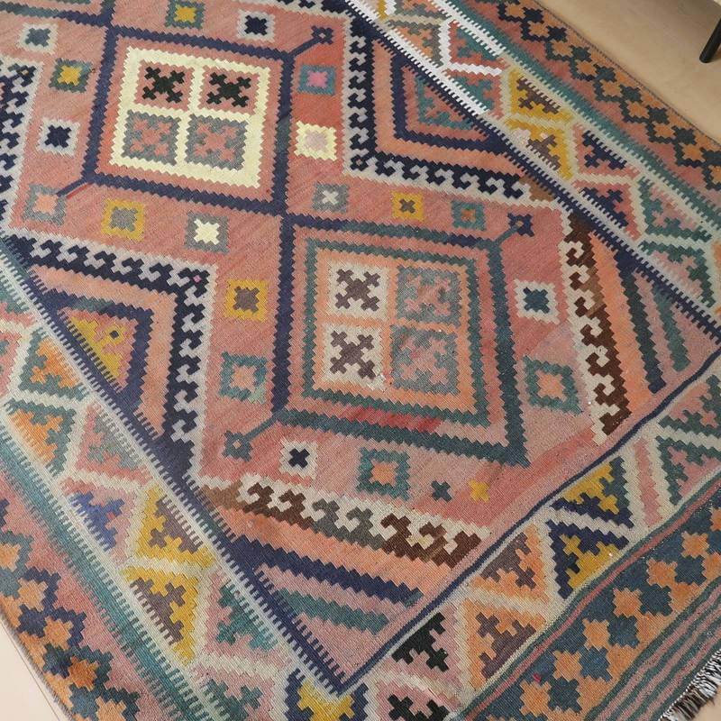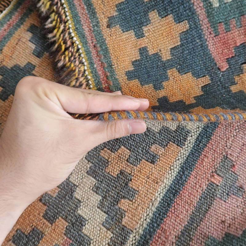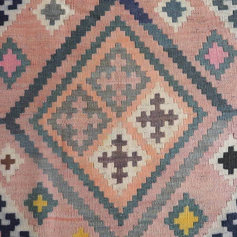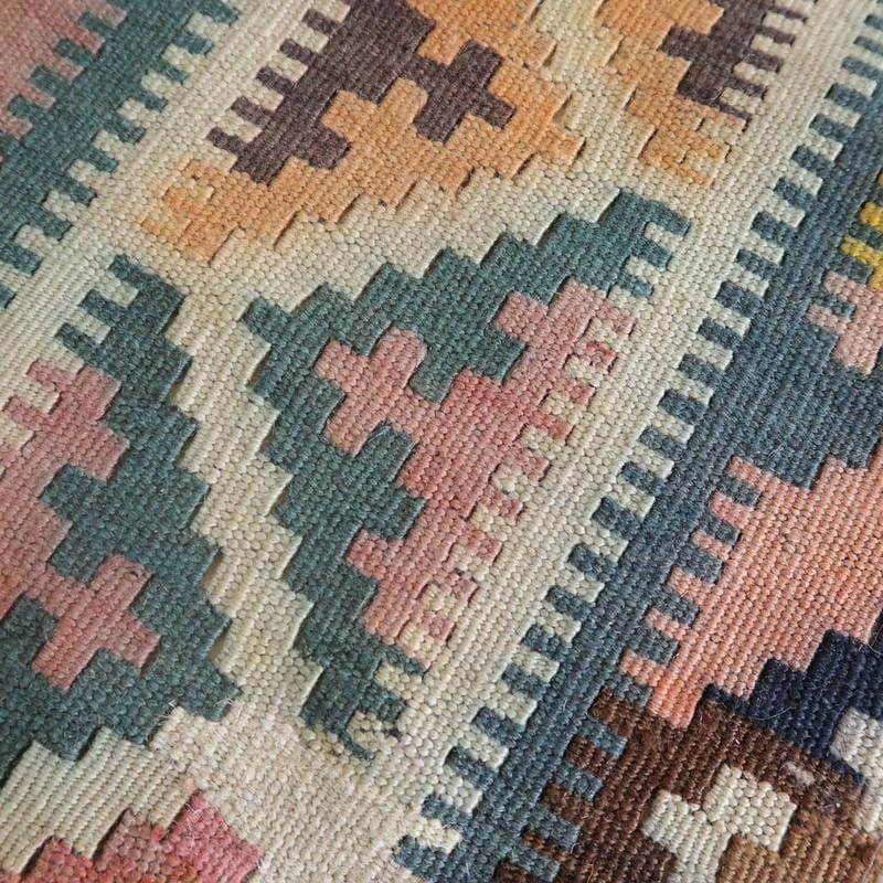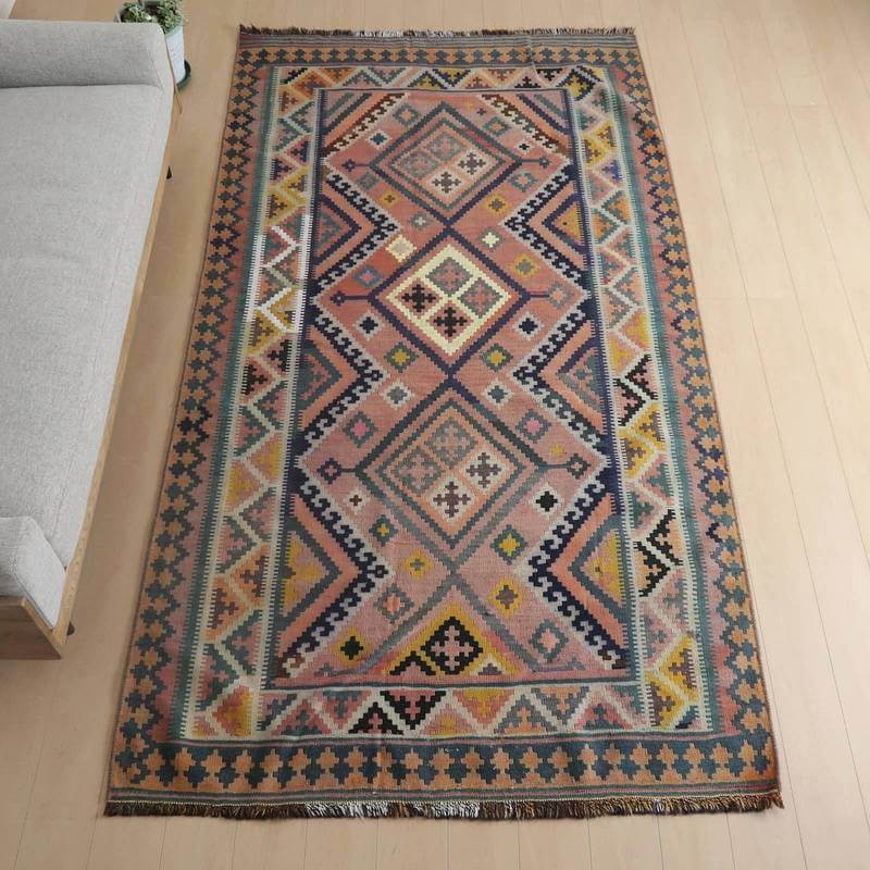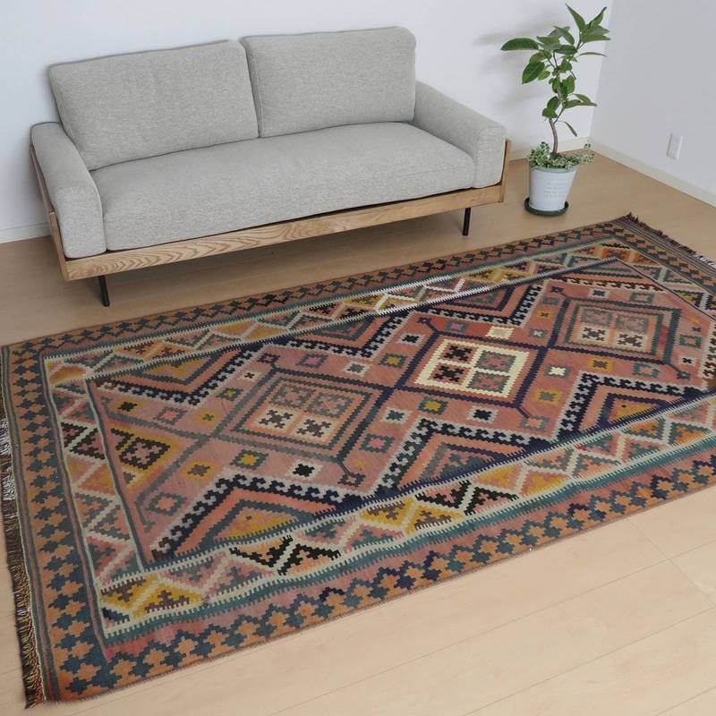 色褪せてあずき色やなす色、青緑に薄くぼんやりと変化した地色のグラデーションや所々に見られる色のにじみの風合いが、オールド独特の魅力あふれるカラー。こなれた手触りや色には時の流れを感じますが、イラン南部シラーズ地方特有の幾何学柄やギザギザ文様は織られた当時のままの様子を留めていて、時の経過を思うとしみじみと感じ入るものもあります。平織り(ひらおり)という裏表の無い織り方で両面使えます。カシュガイ族の遊牧のテント生活用の為、丈夫に織られ、洗濯も簡単、床なじみの良い適度な厚さで、普段使いのラグとして大変使いやすいキリムです。