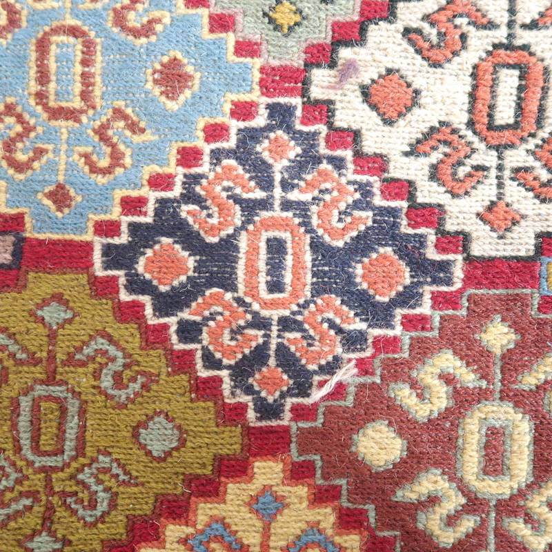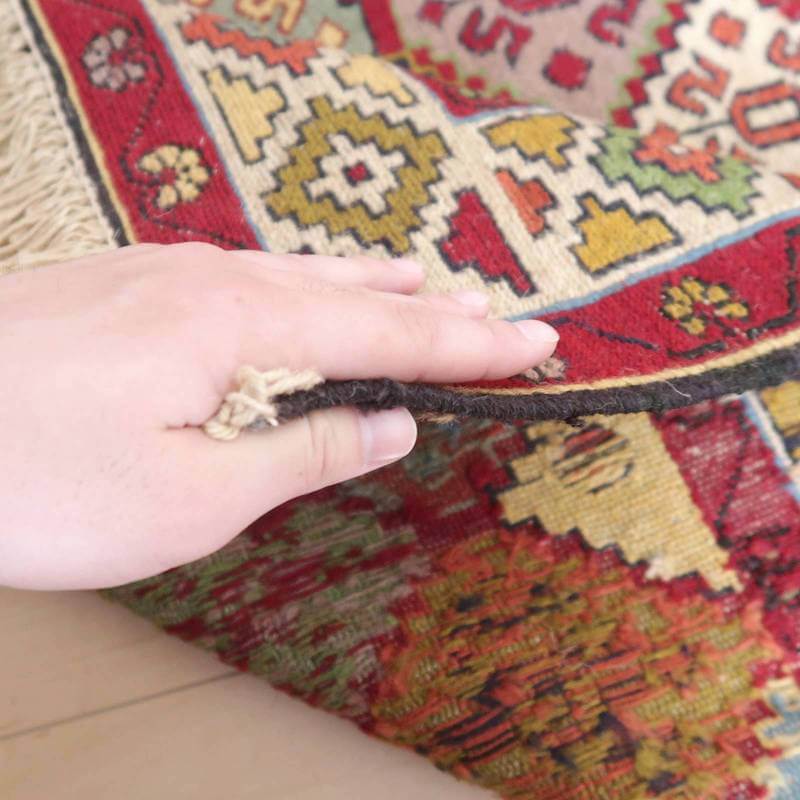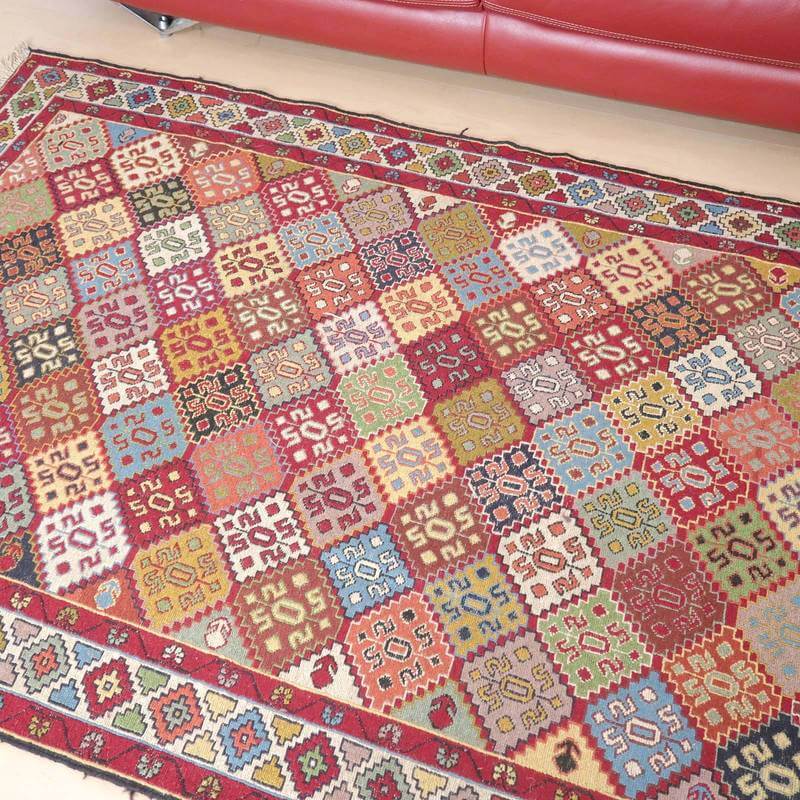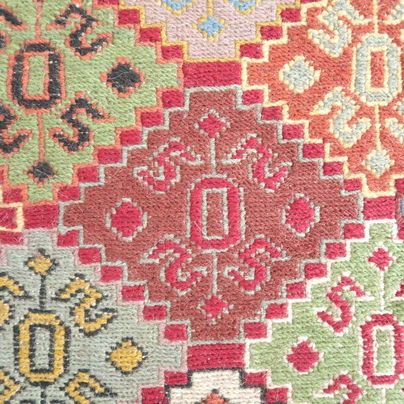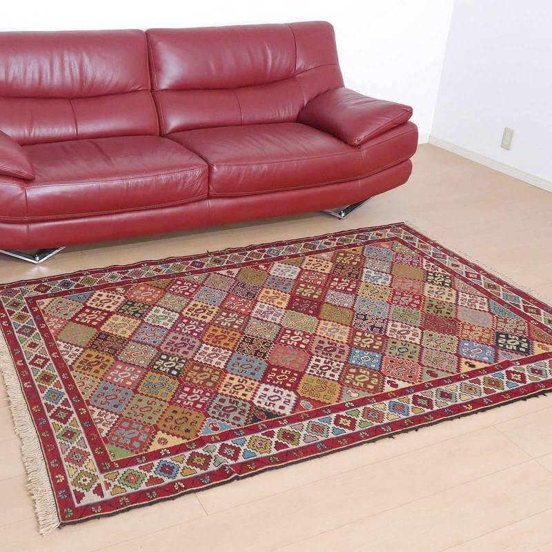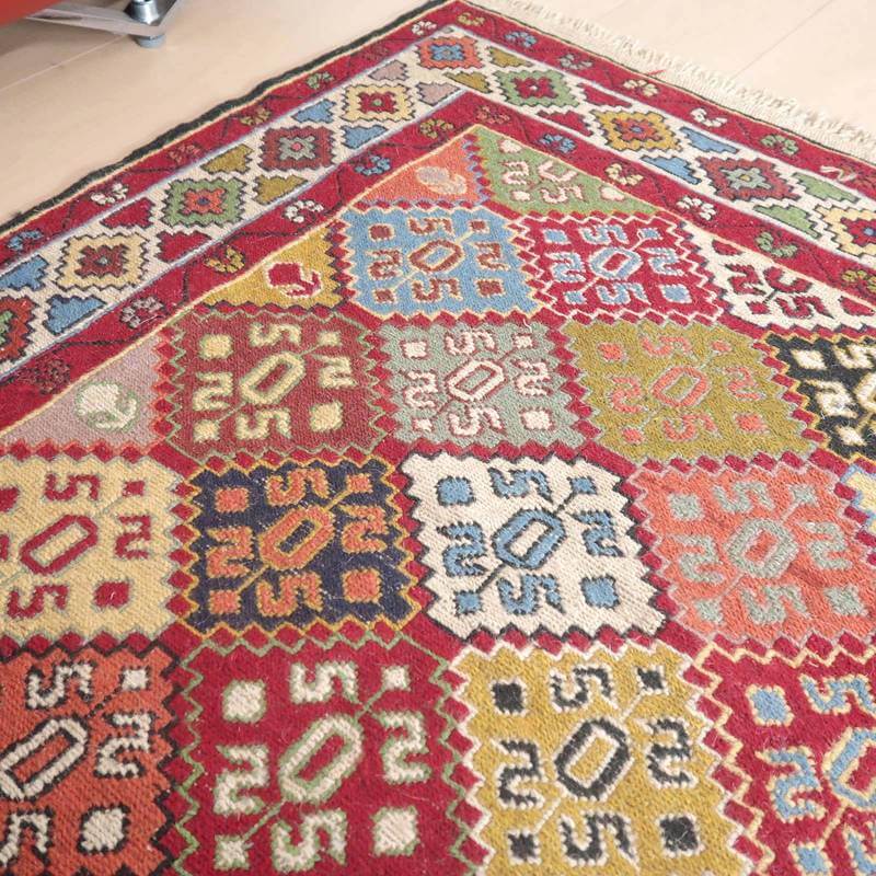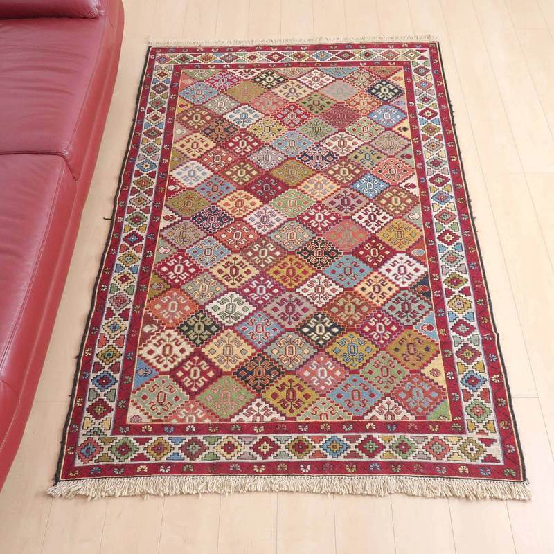 刺繍のように細かな文様が全面に施された美しいスマック織りのキリム。赤を基調に様々な色で文様が入った多色使いですが柄が細かいので落ち着きもあります。一目一目の模様をじっくり眺めて味わえるキリムでたいへん上質感があります。スマック織りは裏面に模様の糸を渡してあるので片面使いのキリムになります。