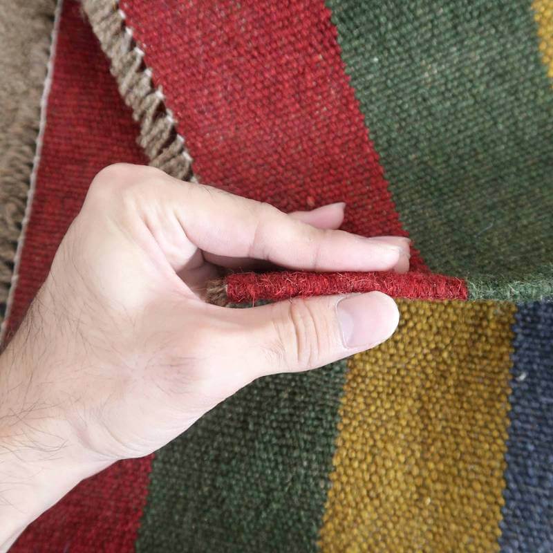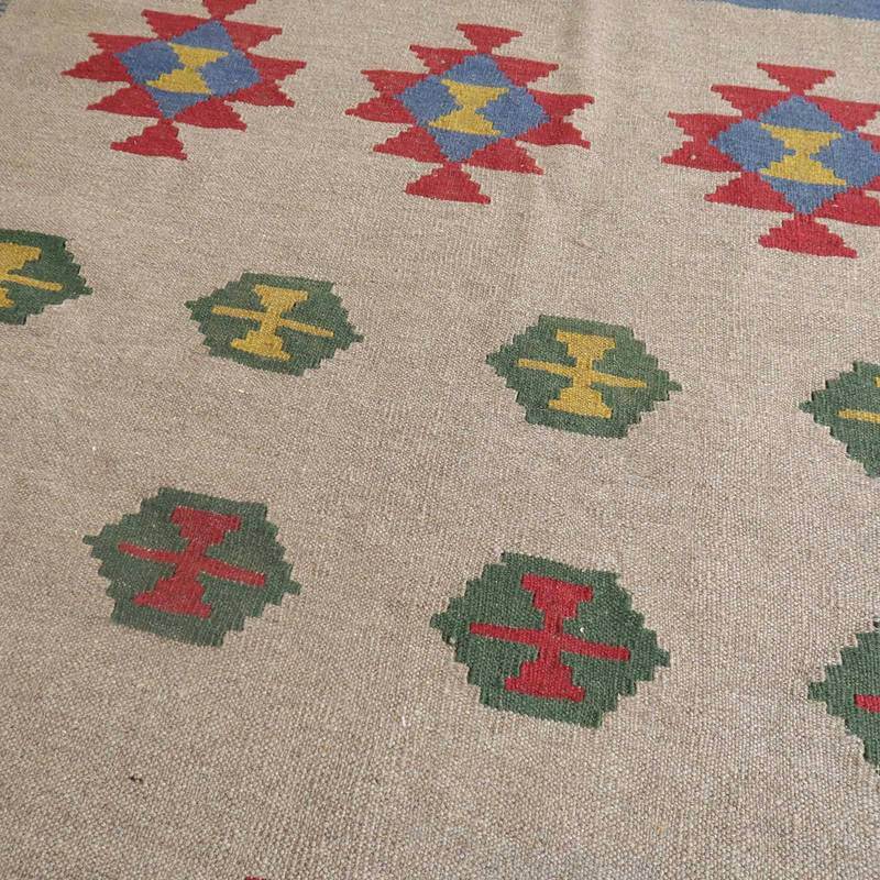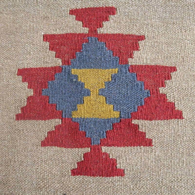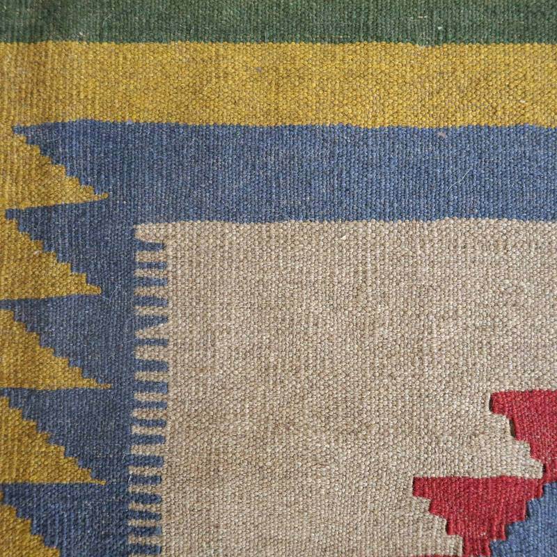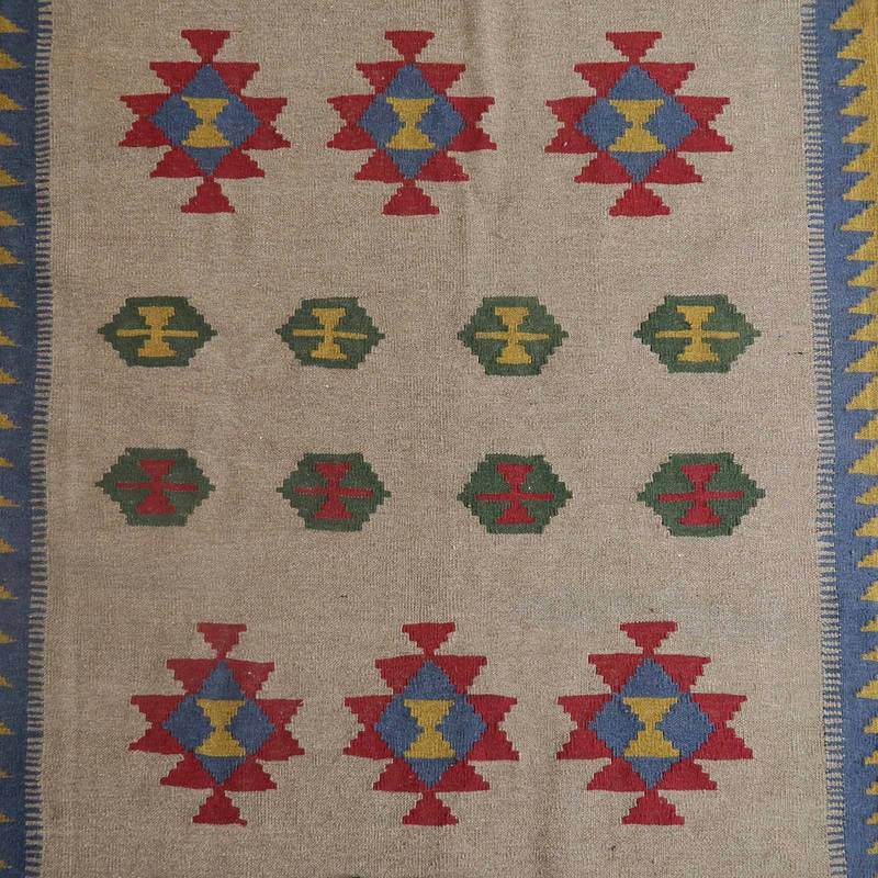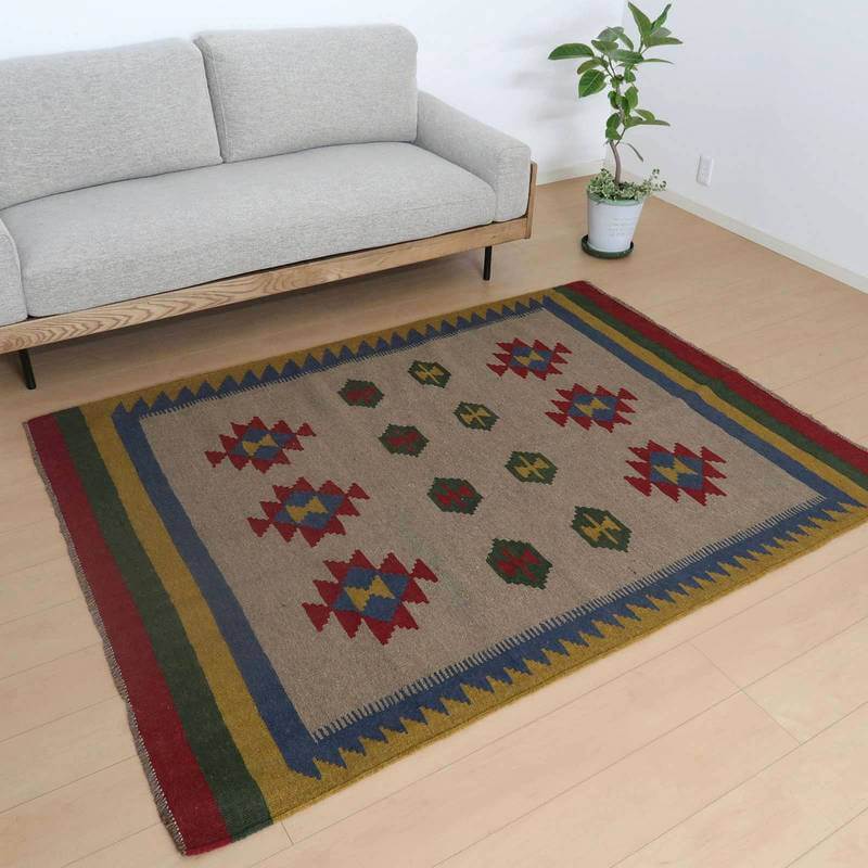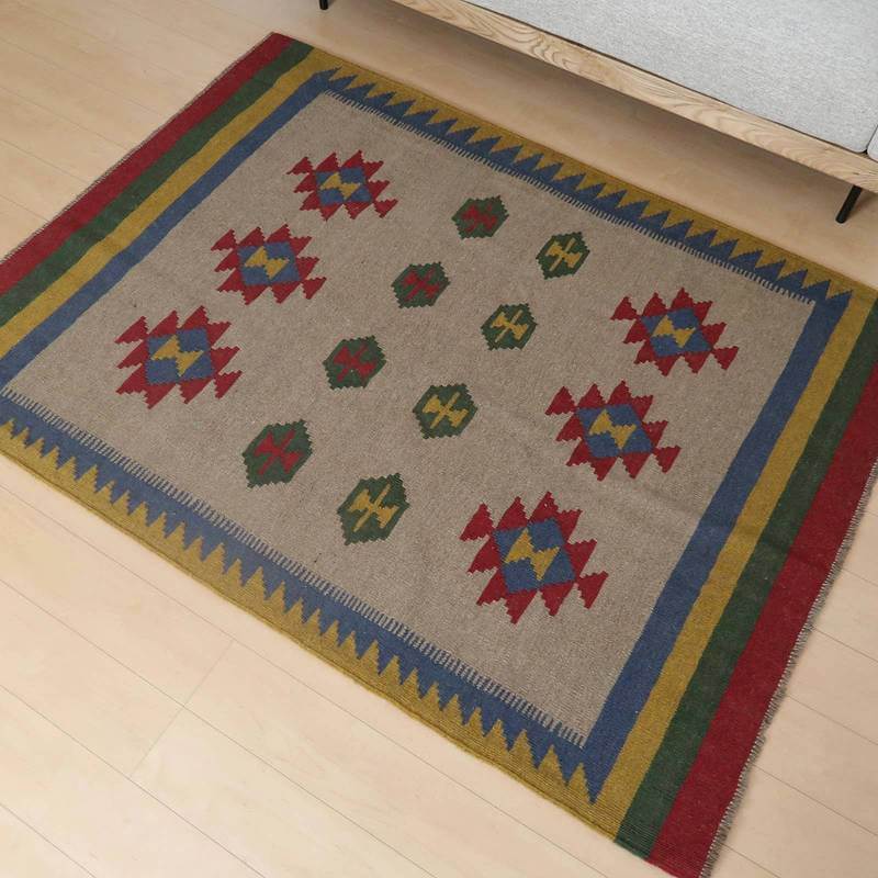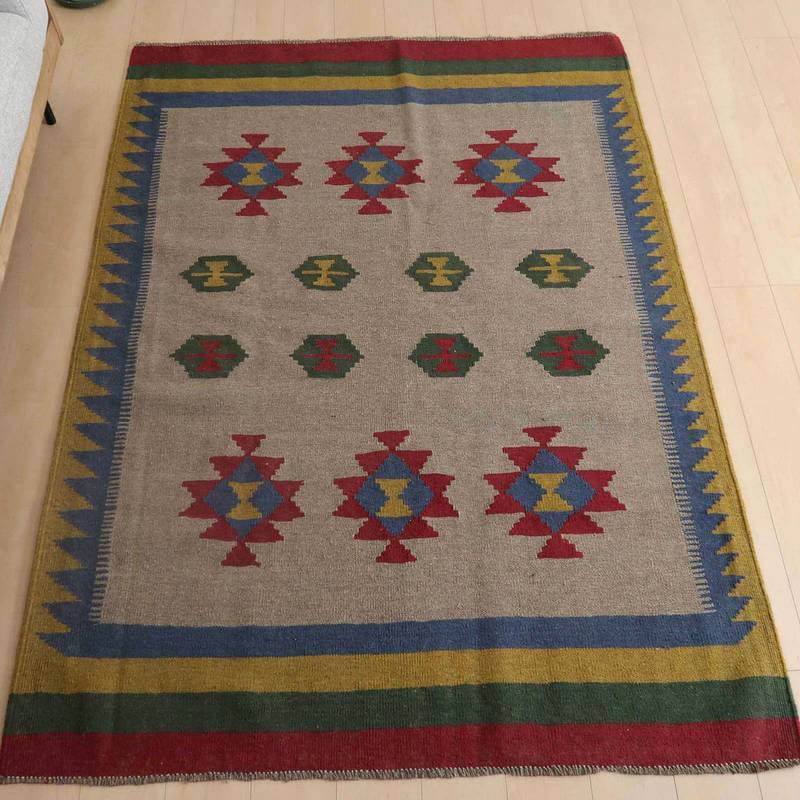 ギャッベでお馴染みのシラーズ地方カシュガイ族に伝わるキリムです。いくつかの色を使用した幾何学柄やギザギザ文様はリズムのある明るい雰囲気。程よく落ち着いた色とウールの風合いが、やさしくインテリアに馴染みます。カシュガイの女性が昔ながらに織り上げたキリムなので、よく締まった丈夫な織り目で、早く仕上げる為、ゆるく粗く織られる商用生産のキリムには無い、誠実さが伝わってくる一枚です。また、平織り(ひらおり)という裏表の無い織り方で両面使えます。カシュガイ族の遊牧のテント生活用の為、丈夫に織られ、洗濯も簡単、床なじみの良い適度な厚さで、普段使いのラグとして大変使いやすいキリムです。