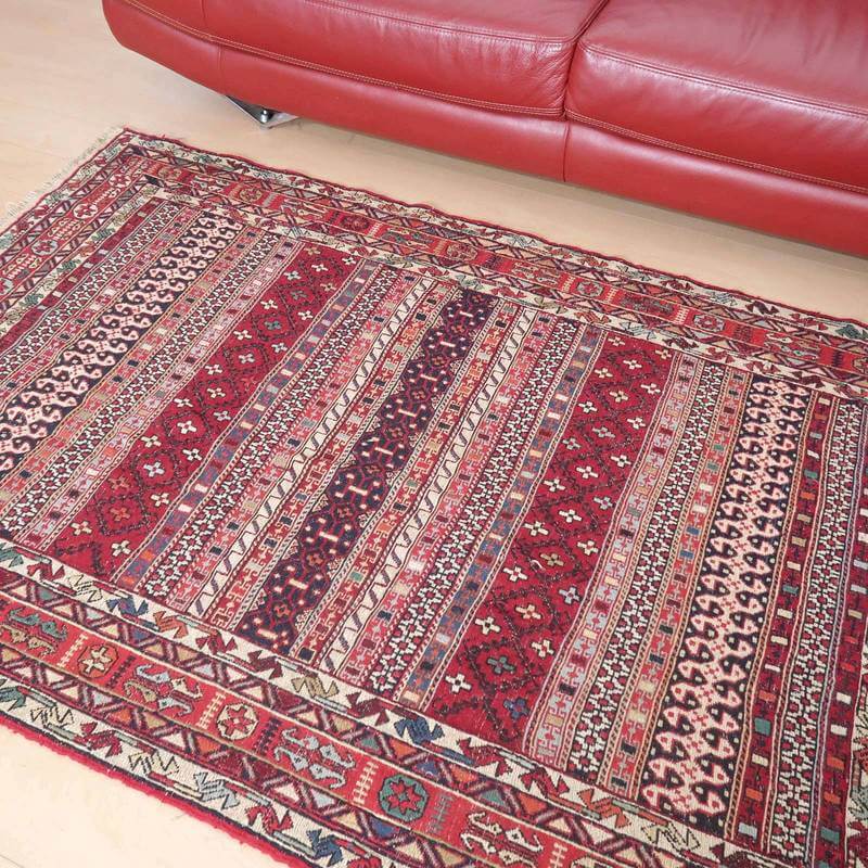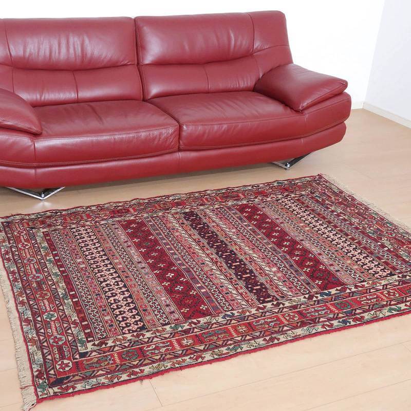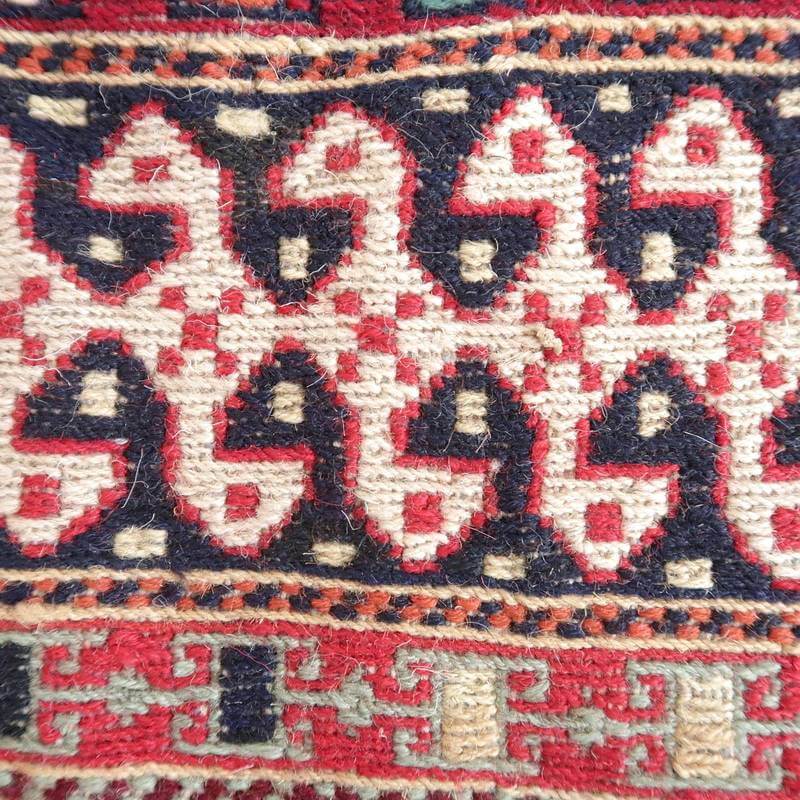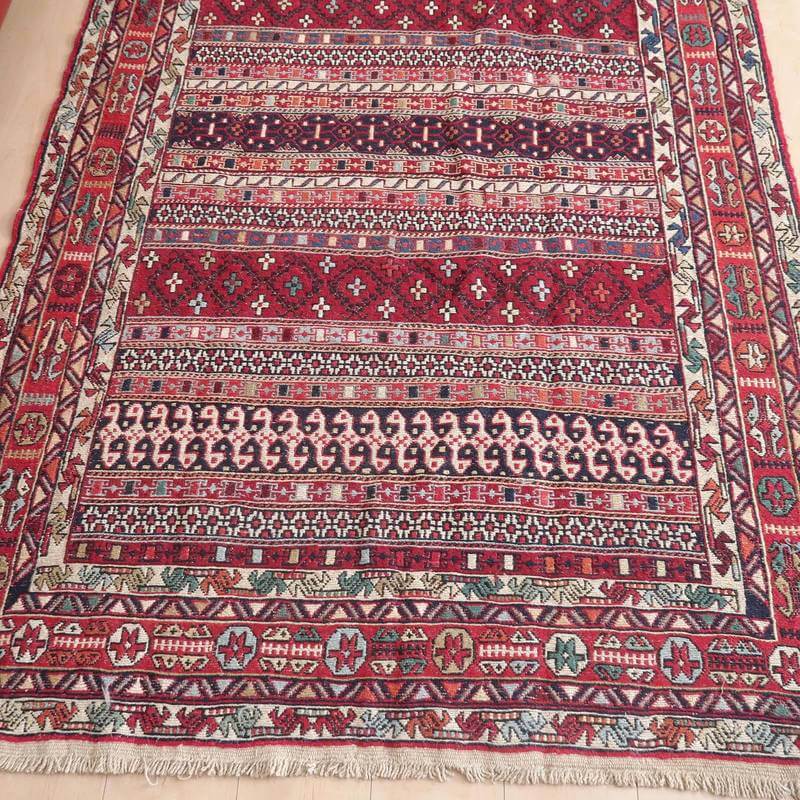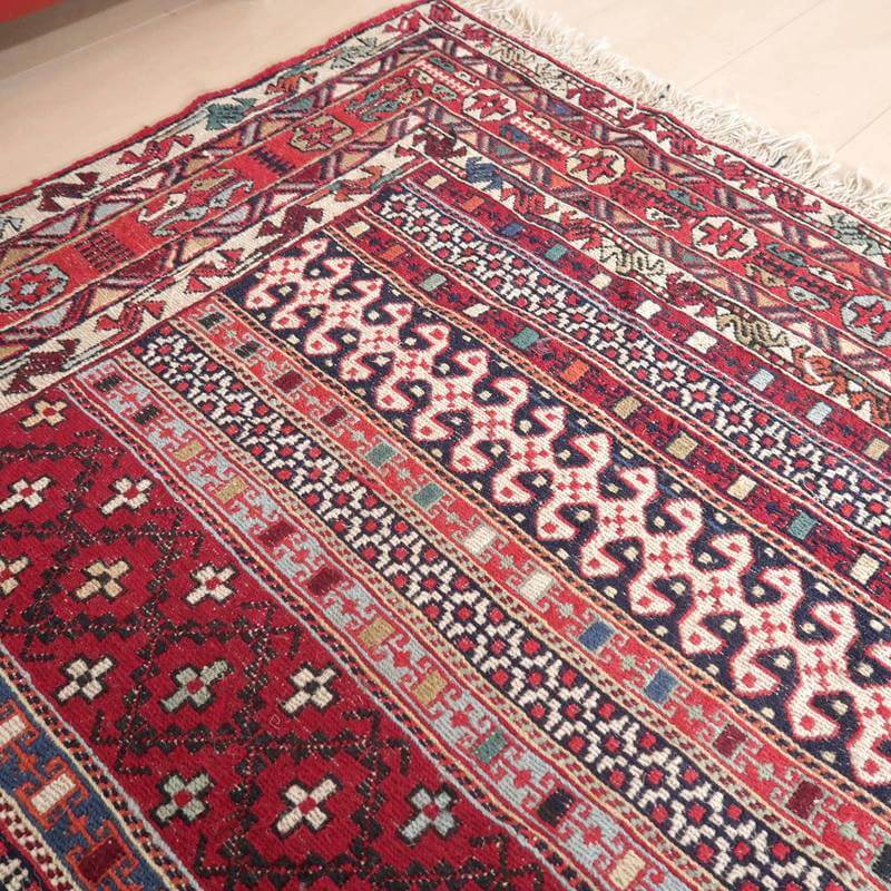 刺繍のように細かな文様が全面に施された美しいスマック織りのキリム。赤を基調に様々な色で文様が入った多色使いですが柄が細かいので落ち着きもあります。一目一目の模様をじっくり眺めて味わえるキリムでたいへん上質感があります。スマック織りは裏面に模様の糸を渡してあるので片面使いのキリムになります。