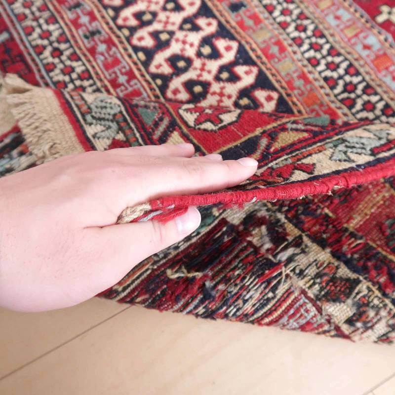 スマック織りとは、イランのキリムの織り方の技法です。生地は刺繍のような仕上がりですが、これは後から刺したものではなく、土台の縦糸と横糸の上にもう一本横糸を絡めるように巻き込んで織っていく高度なテクニックで、生地を二重に織るため通常の平織りのキリムより倍の手間ひまが掛かる分高価になりますが、非常に堅固で丈夫、また普通より細かなデザインを描けるという長所がありますので、価格以上の価値を感じて頂けるキリムです。