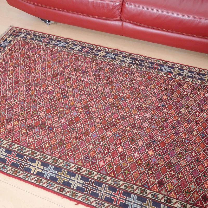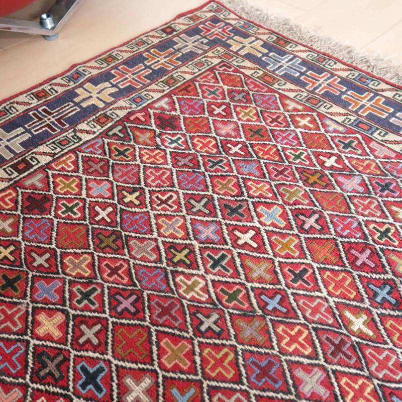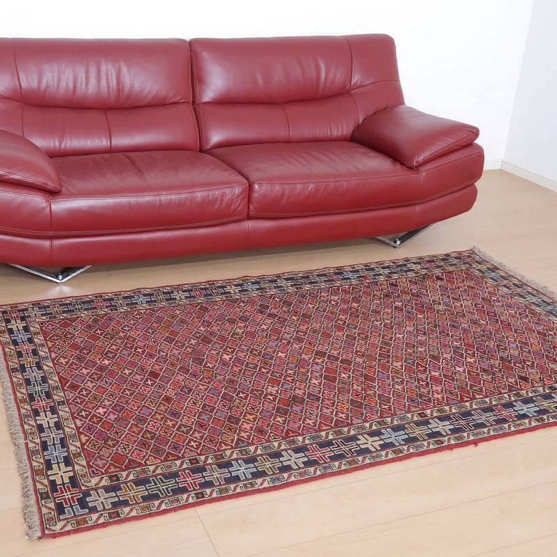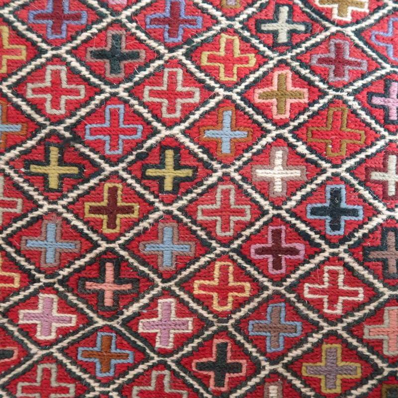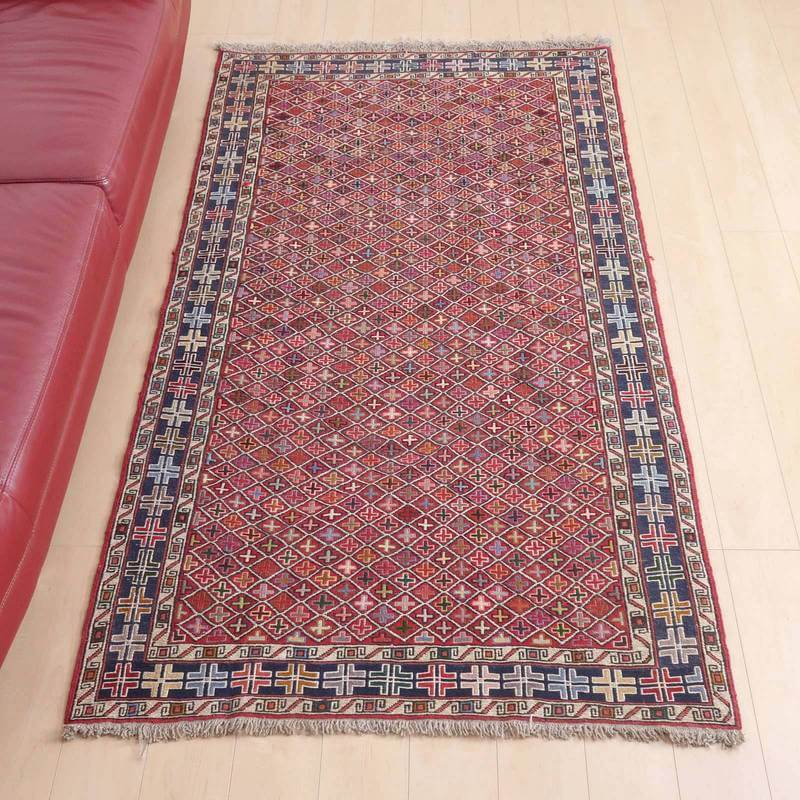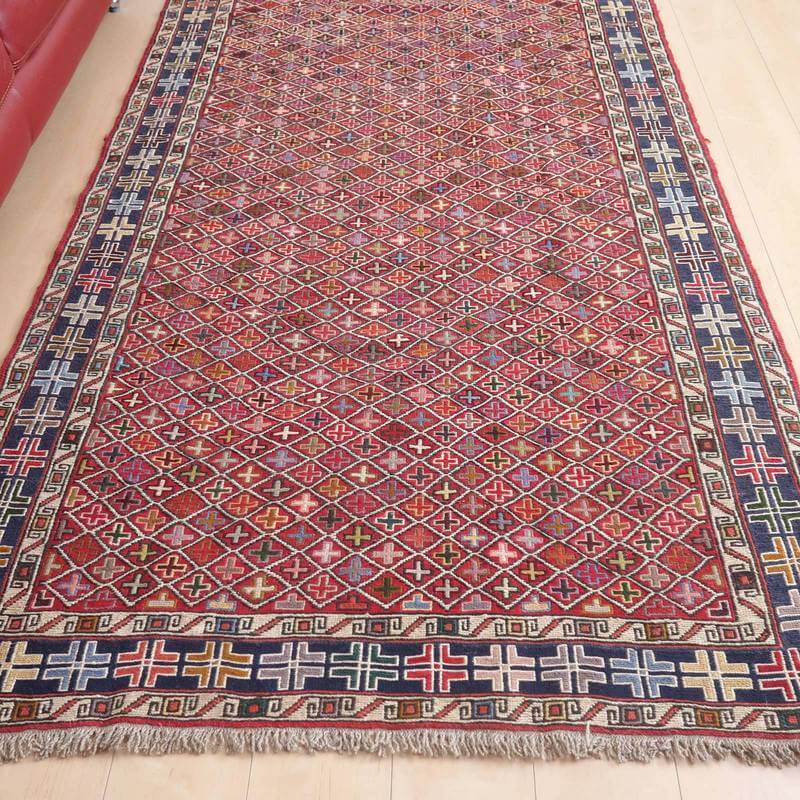 刺繍のように細かな文様が全面に施された美しいスマック織りのキリム。赤を基調に様々な色で文様が入った多色使いですが柄が細かいので落ち着きもあります。一目一目の模様をじっくり眺めて味わえるキリムでたいへん上質感があります。スマック織りは裏面に模様の糸を渡してあるので片面使いのキリムになります。