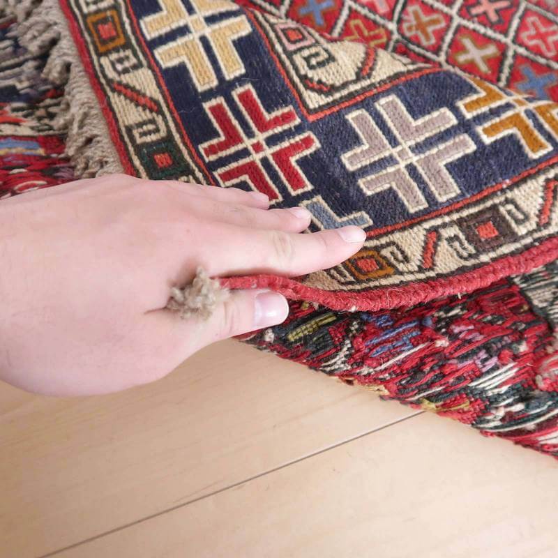 スマック織りとは、イランのキリムの織り方の技法です。生地は刺繍のような仕上がりですが、これは後から刺したものではなく、土台の縦糸と横糸の上にもう一本横糸を絡めるように巻き込んで織っていく高度なテクニックで、生地を二重に織るため通常の平織りのキリムより倍の手間ひまが掛かる分高価になりますが、非常に堅固で丈夫、また普通より細かなデザインを描けるという長所がありますので、価格以上の価値を感じて頂けるキリムです。
