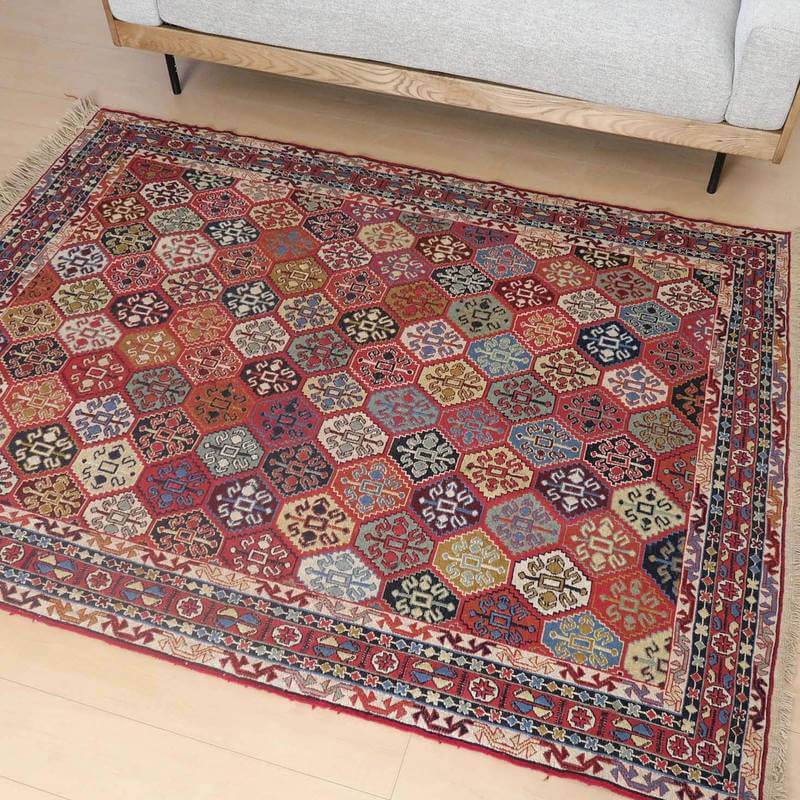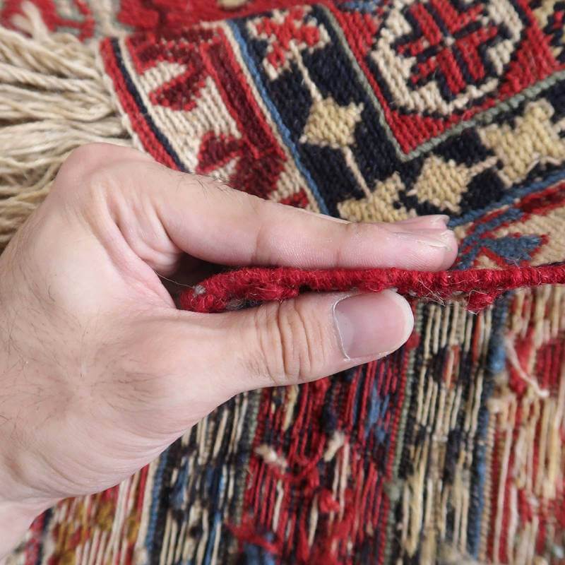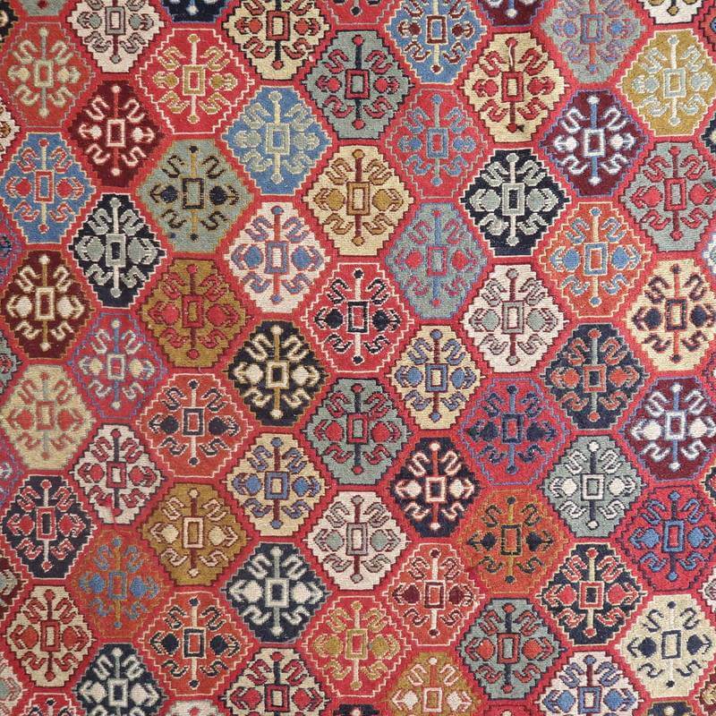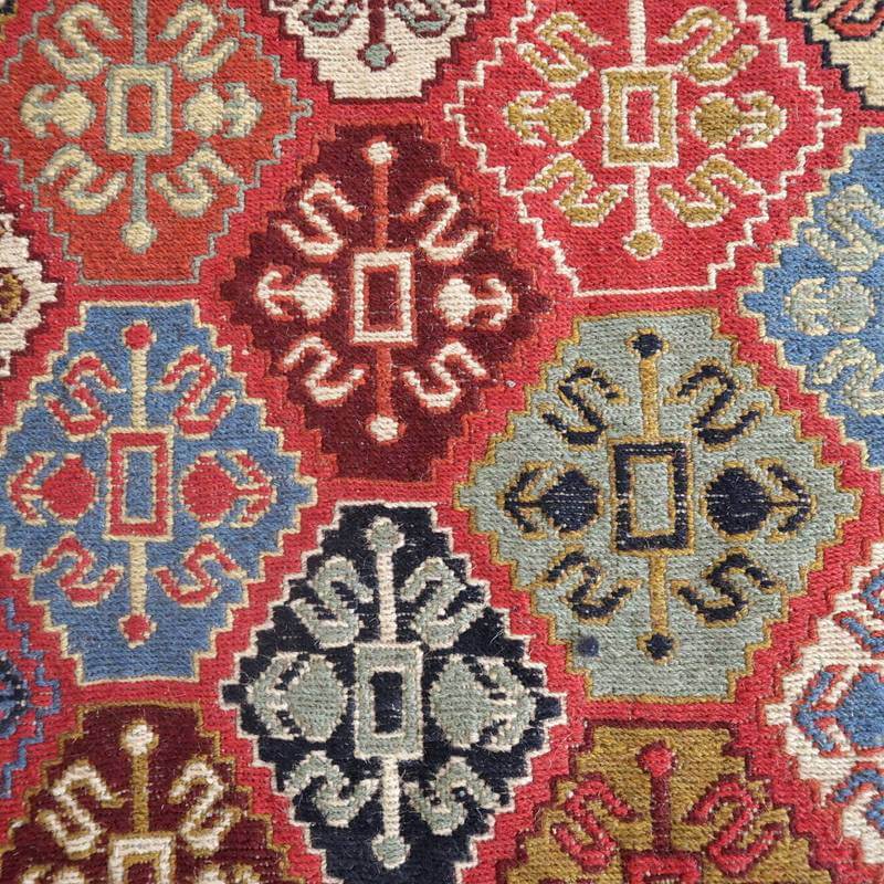 刺繍のように細かな文様が全面に施された美しいスマック織りのキリム。赤を基調に様々な色で文様が入った多色使いですが柄が細かいので落ち着きもあります。一目一目の模様をじっくり眺めて味わえるキリムでたいへん上質感があります。スマック織りは裏面に模様の糸を渡してあるので片面使いのキリムになります。