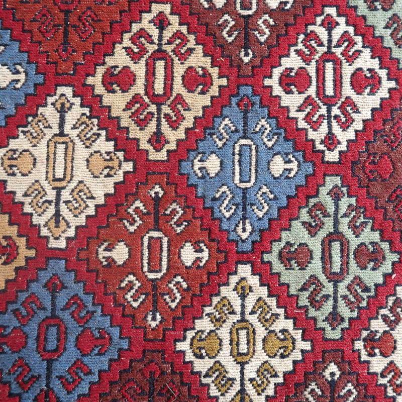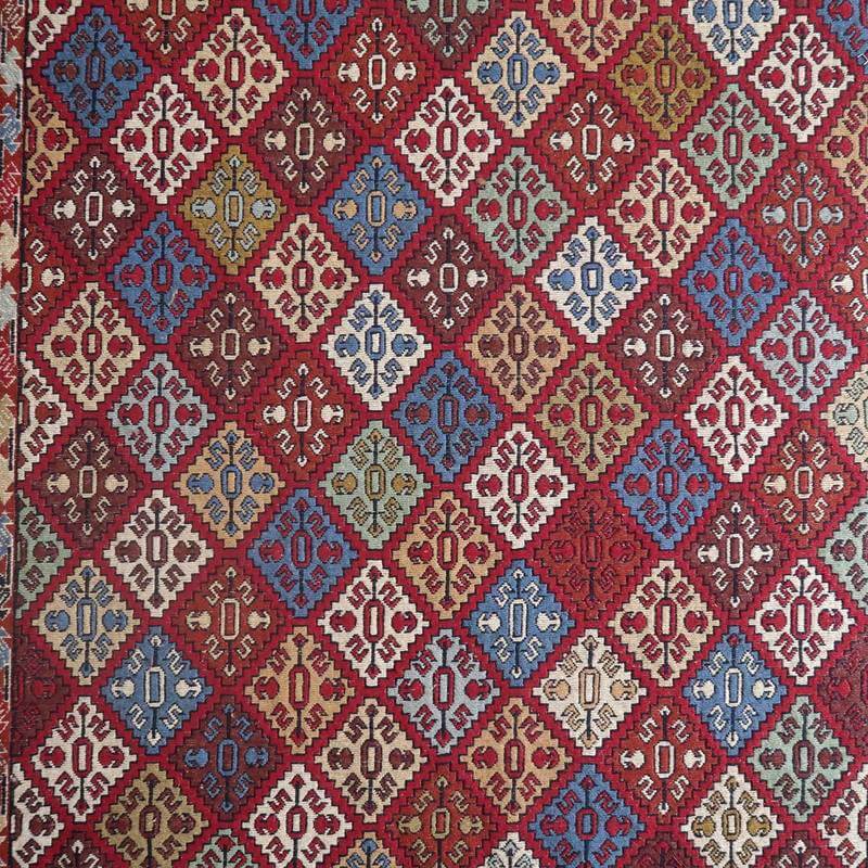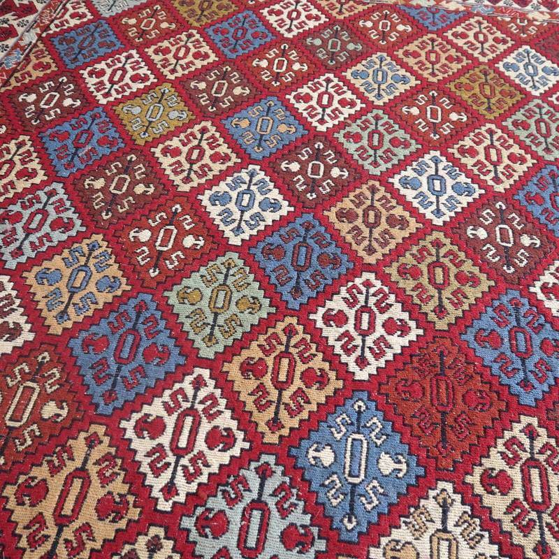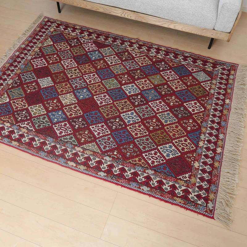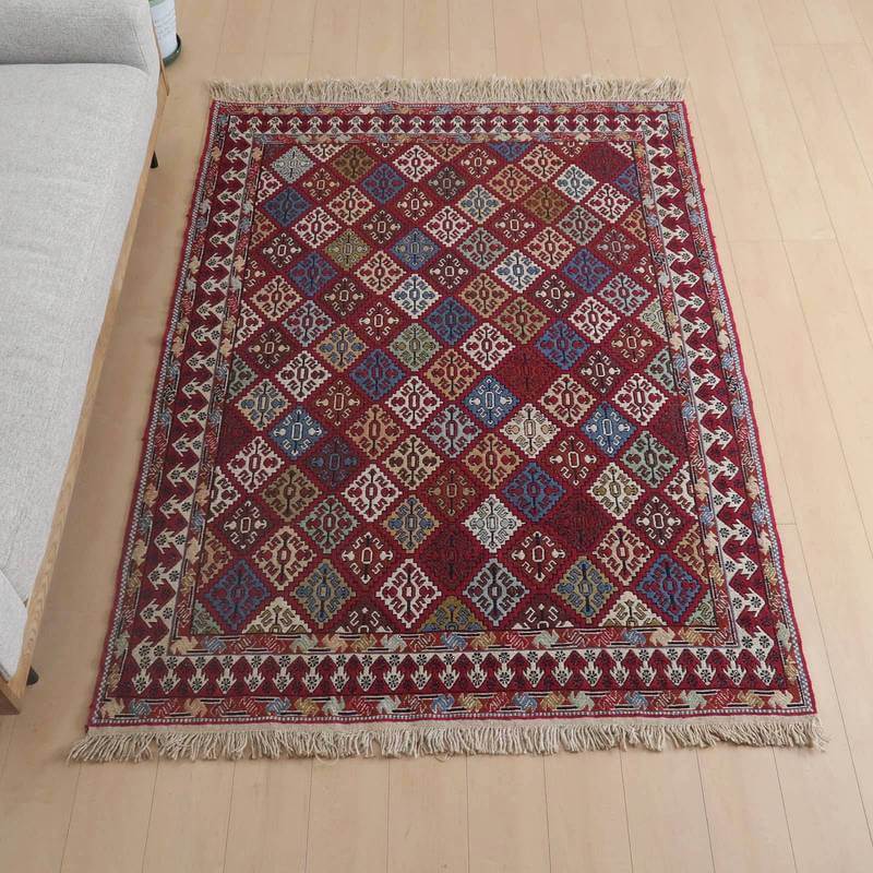 刺繍のように細かな文様が全面に施された美しいスマック織りのキリム。赤を基調に様々な色で文様が入った多色使いですが柄が細かいので落ち着きもあります。一目一目の模様をじっくり眺めて味わえるキリムでたいへん上質感があります。スマック織りは裏面に模様の糸を渡してあるので片面使いのキリムになります。右端の長さが197センチ、左端の長さが203センチです。右端の長さが203センチ、左端の長さが193センチです。
