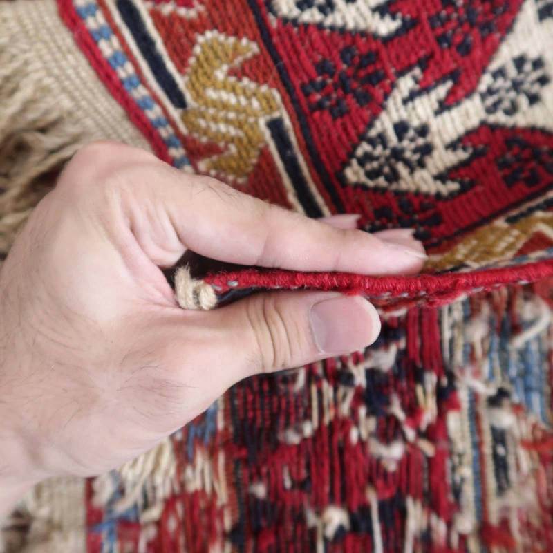 スマック織りとは、イランのキリムの織り方の技法です。生地は刺繍のような仕上がりですが、これは後から刺したものではなく、土台の縦糸と横糸の上にもう一本横糸を絡めるように巻き込んで織っていく高度なテクニックで、生地を二重に織るため通常の平織りのキリムより倍の手間ひまが掛かる分高価になりますが、非常に堅固で丈夫、また普通より細かなデザインを描けるという長所がありますので、価格以上の価値を感じて頂けるキリムです。