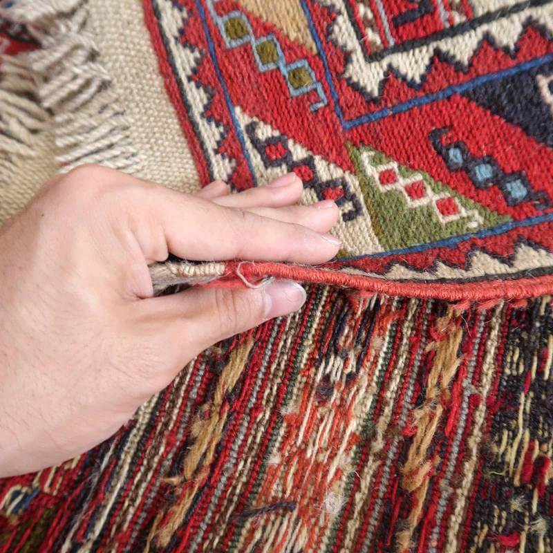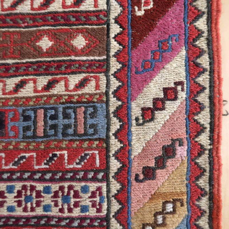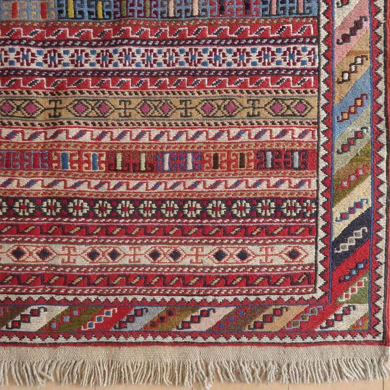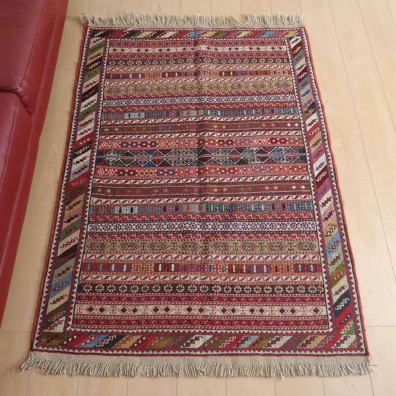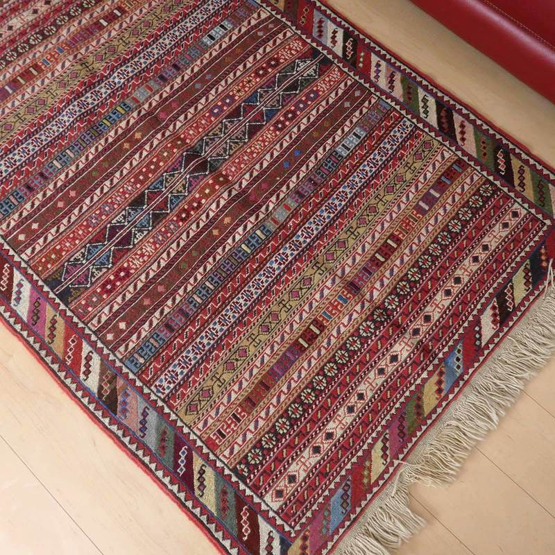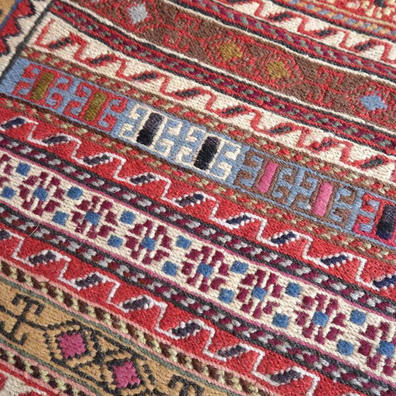刺繍のように細かな文様が全面に施された美しいスマック織りのキリム。赤を基調に様々な色で文様が入った多色使いですが柄が細かいので落ち着きもあります。一目一目の模様をじっくり眺めて味わえるキリムでたいへん上質感があります。スマック織りは裏面に模様の糸を渡してあるので片面使いのキリムになります。スマック織りとは、イランのキリムの織り方の技法です。生地は刺繍のような仕上がりですが、これは後から刺したものではなく、土台の縦糸と横糸の上にもう一本横糸を絡めるように巻き込んで織っていく高度なテクニックで、生地を二重に織るため通常の平織りのキリムより倍の手間ひまが掛かる分高価になりますが、非常に堅固で丈夫、また普通より細かなデザインを描けるという長所がありますので、価格以上の価値を感じて頂けるキリムです。