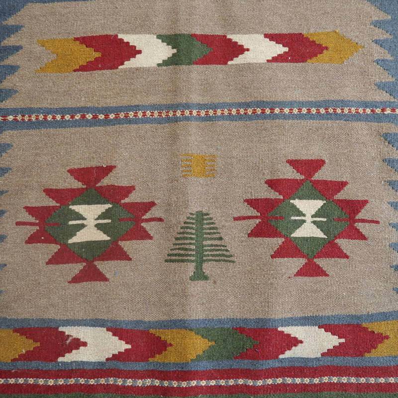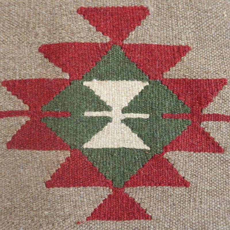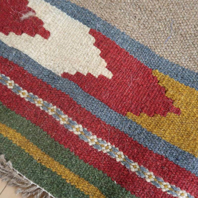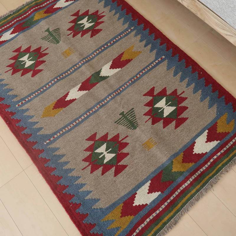 イラン南部シラーズ地方のキリムです。いくつかの色を使用した幾何学柄やギザギザ文様はリズムのある明るい雰囲気。程よく落ち着いた色とウールの風合いが、やさしくインテリアに馴染みます。カシュガイの女性が昔ながらに織り上げたキリムなので、よく締まった丈夫な織り目で、早く仕上げる為、ゆるく粗く織られる商用生産のキリムには無い、誠実さが伝わってくる一枚です。また、平織り(ひらおり)という裏表の無い織り方で両面使えます。カシュガイ族の遊牧のテント生活用の為、丈夫に織られ、洗濯も簡単、床なじみの良い適度な厚さで、普段使いのラグとして大変使いやすいキリムです。