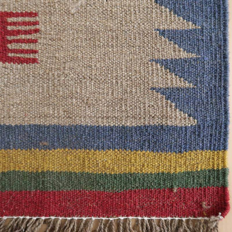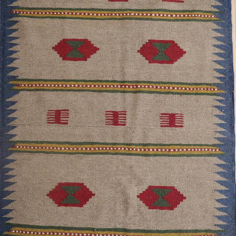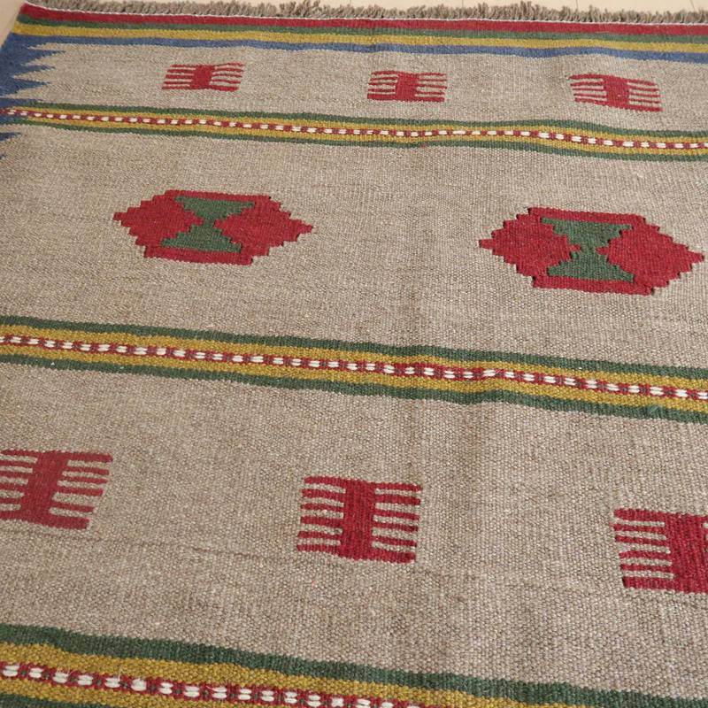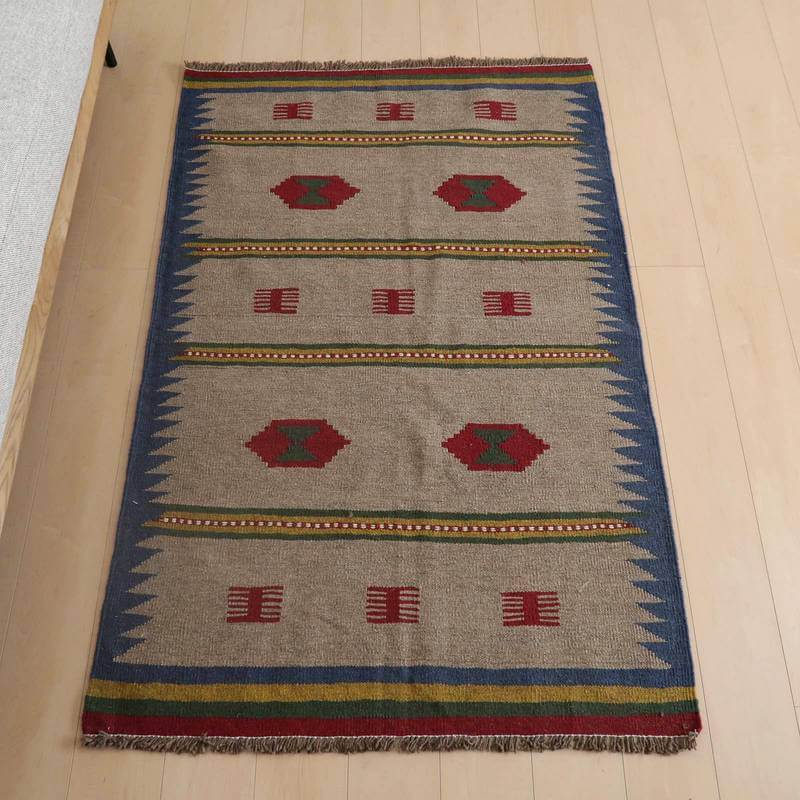イラン南部シラーズ地方のキリムです。いくつかの色を使用した幾何学柄やギザギザ文様はリズムのある明るい雰囲気。程よく落ち着いた色とウールの風合いが、やさしくインテリアに馴染みます。カシュガイの女性が昔ながらに織り上げたキリムなので、よく締まった丈夫な織り目で、早く仕上げる為、ゆるく粗く織られる商用生産のキリムには無い、誠実さが伝わってくる一枚です。また、平織り(ひらおり)という裏表の無い織り方で両面使えます。カシュガイ族の遊牧のテント生活用の為、丈夫に織られ、洗濯も簡単、床なじみの良い適度な厚さで、普段使いのラグとして大変使いやすいキリムです。右端で155センチ、左端で157センチと長さに手織りならではの少しの違いがございます。