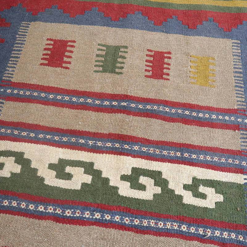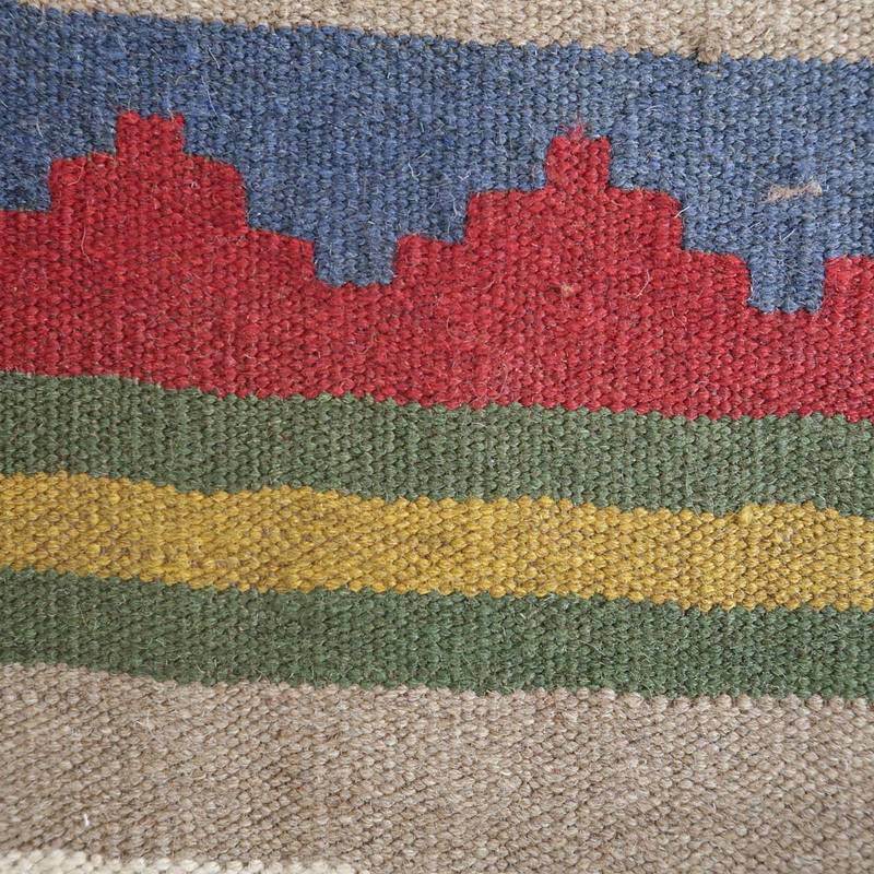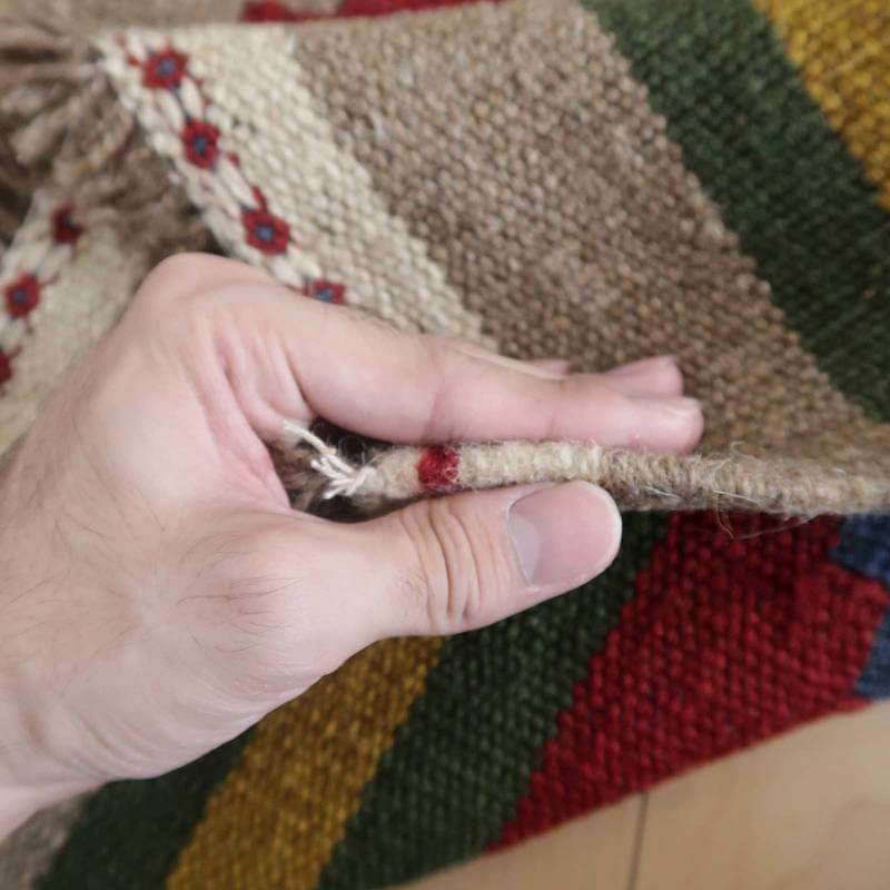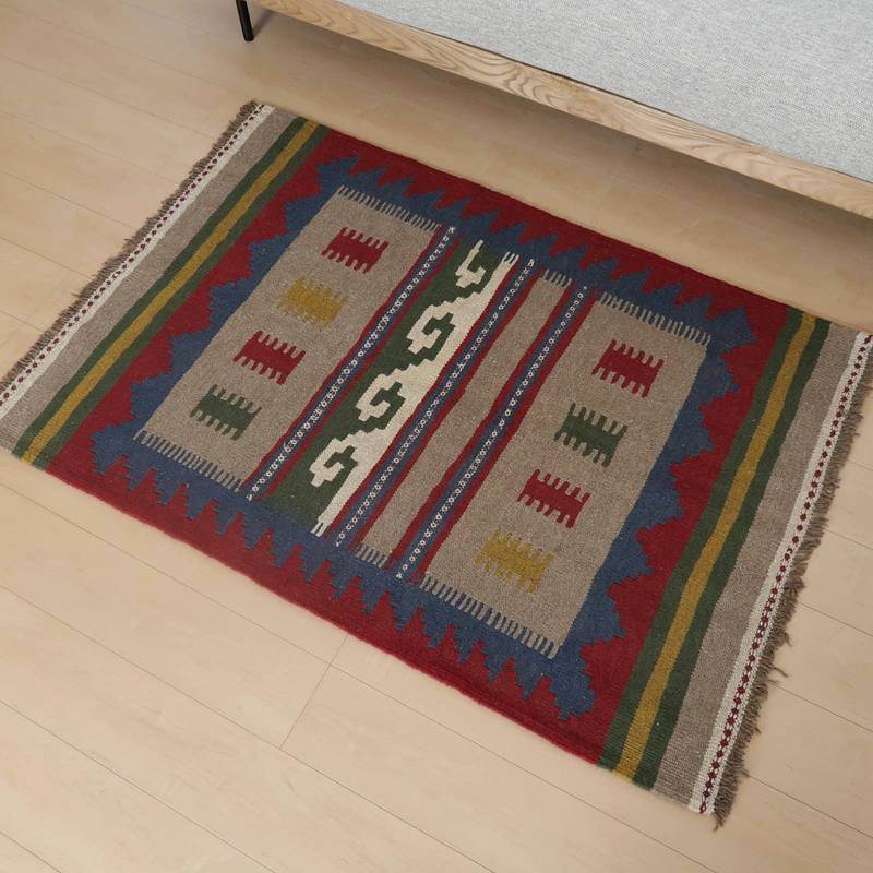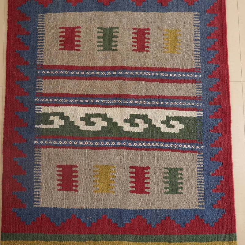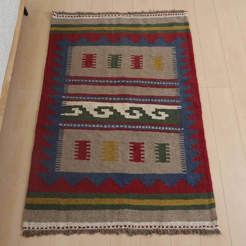 イラン南部シラーズ地方のキリムです。いくつかの色を使用した幾何学柄やギザギザ文様はリズムのある明るい雰囲気。程よく落ち着いた色とウールの風合いが、やさしくインテリアに馴染みます。カシュガイの女性が昔ながらに織り上げたキリムなので、よく締まった丈夫な織り目で、早く仕上げる為、ゆるく粗く織られる商用生産のキリムには無い、誠実さが伝わってくる一枚です。また、平織り(ひらおり)という裏表の無い織り方で両面使えます。カシュガイ族の遊牧のテント生活用の為、丈夫に織られ、洗濯も簡単、床なじみの良い適度な厚さで、普段使いのラグとして大変使いやすいキリムです。