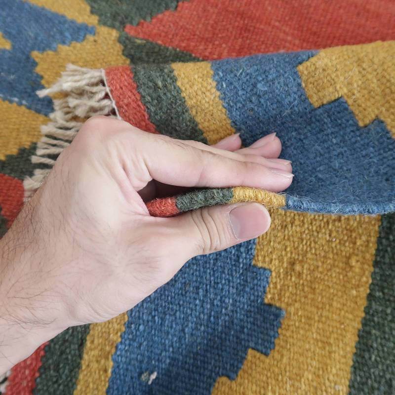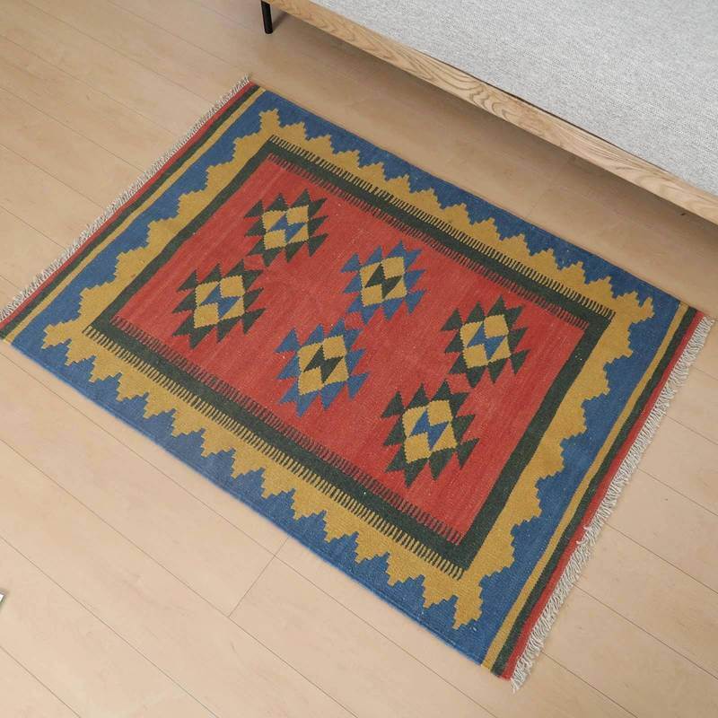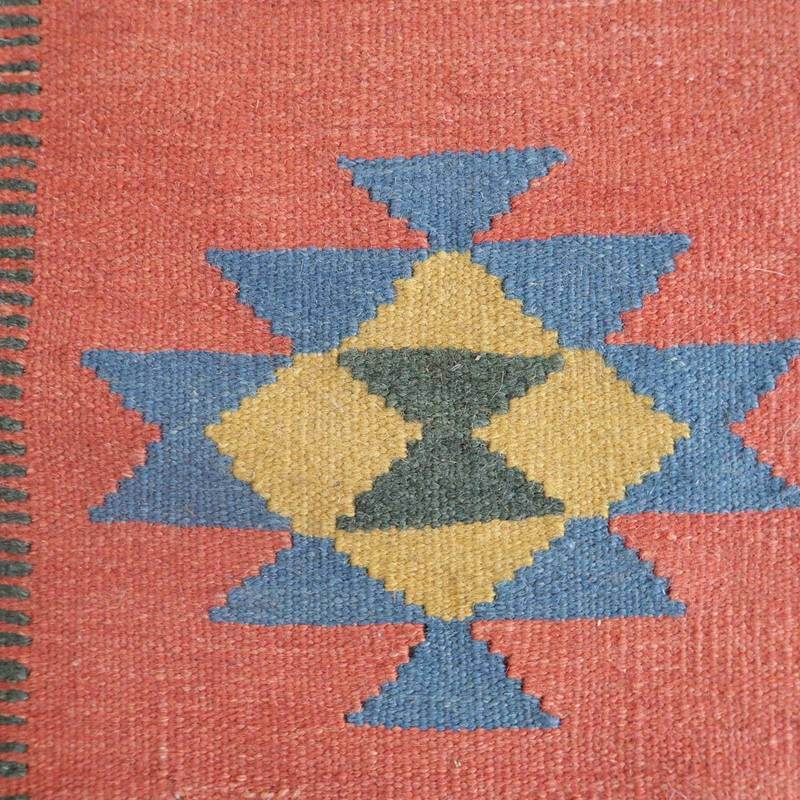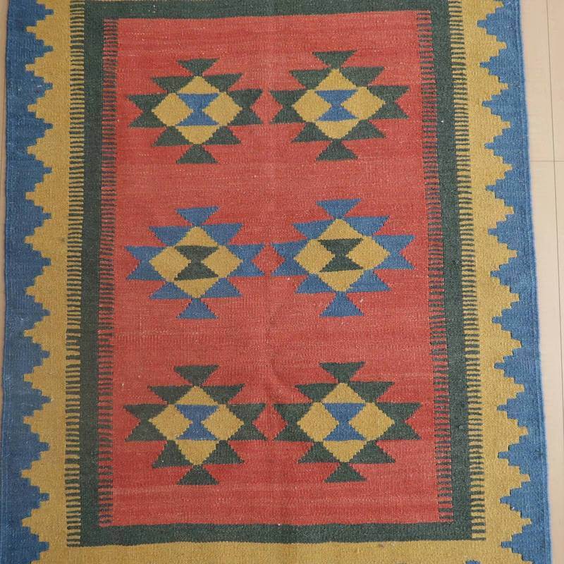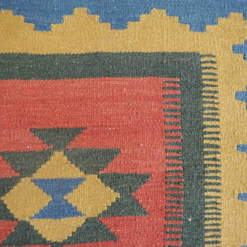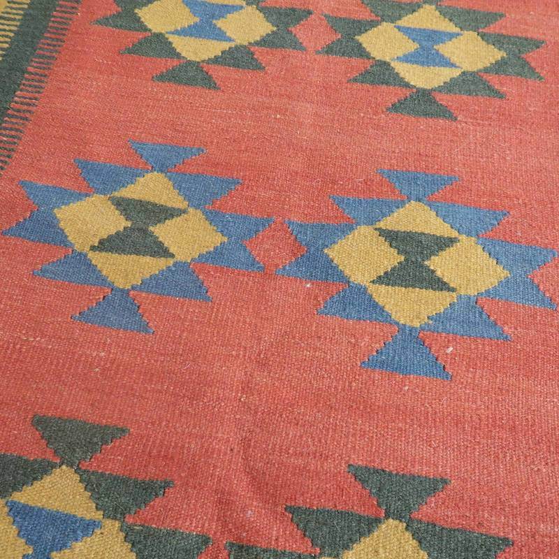 ギャッベでお馴染みのシラーズ地方カシュガイ族に伝わるキリムです。いくつかの色を使用した幾何学柄やギザギザ文様はリズムのある明るい雰囲気。程よく落ち着いた色とウールの風合いが、やさしくインテリアに馴染みます。カシュガイの女性が昔ながらに織り上げたキリムなので、よく締まった丈夫な織り目で、早く仕上げる為、ゆるく粗く織られる商用生産のキリムには無い、誠実さが伝わってくる一枚です。また、平織り(ひらおり)という裏表の無い織り方で両面使えます。カシュガイ族の遊牧のテント生活用の為、丈夫に織られ、洗濯も簡単、床なじみの良い適度な厚さで、普段使いのラグとして大変使いやすいキリムです。